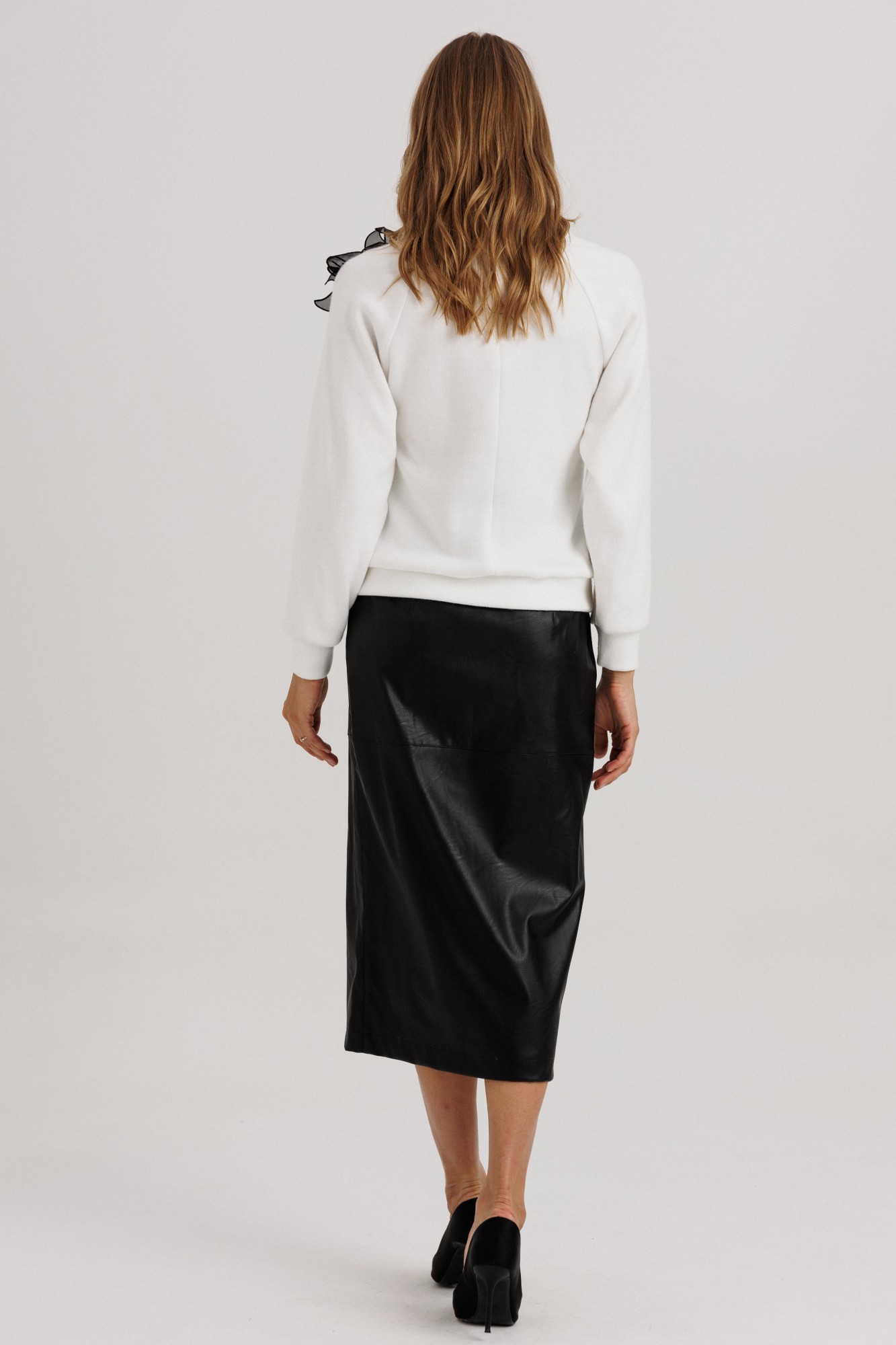 Эффектный комплект, состоящий из элегантного блузона и удлиненной юбки с разрезом спереди. Блузон из уютного трикотажного полотна, свободного прямого силуэта. Рукав реглан, полноценной длины на манжете. Спинка изделия со средним швом, в котором располагается застежка-молния. Низ блузона оканчивается притачной манжетой, высотой 6 см. Горловина оформлена стойкой-лодочкой, высотой 4 см. Отдельным декоративным элементом выступает съемная брошь-цветок. Юбка выполнена из эко-кожи прямого силуэта. Спереди: центральный разрез-шлица, высотой 46 см. Также, в центральном шве расположена застежка на молнию. Также юбка имеет горизонтальные линии с декоративной строчкой, высота кокетки 34 см. Линия талии обработана притачным поясом со шлевочными держателями. В боковых сегментах пояса вставлена эластичная тесьма для дополнительного регулирования объема талии. Высота пояса 4.5 см. Застежка в поясе на две функциональные петли/пуговицы. На линии талии расположены таллиевые вытачки. В боковых швах: наклонные карманы. Дополнительно в шлевочные отверстия вставлен текстильный пояс с пряжкой. (фурнитура может отличаться от представленной на рекламном фотоматериале). Особые рекомендации: рекомендуется холодная деликатная ручная стирка, без использования отбеливающих СМС, без интенсивного трения. Сушка в вертикальном положении. ВТО с минимальным паром.