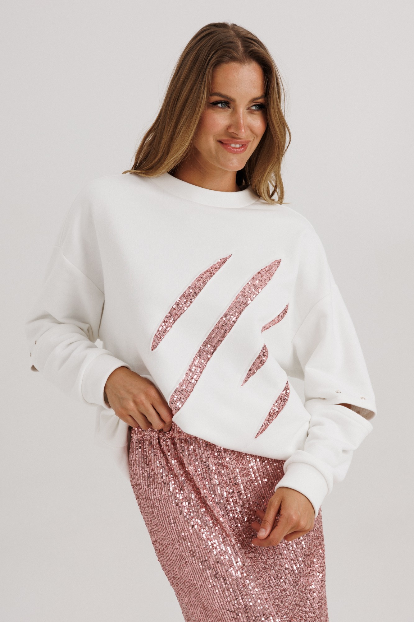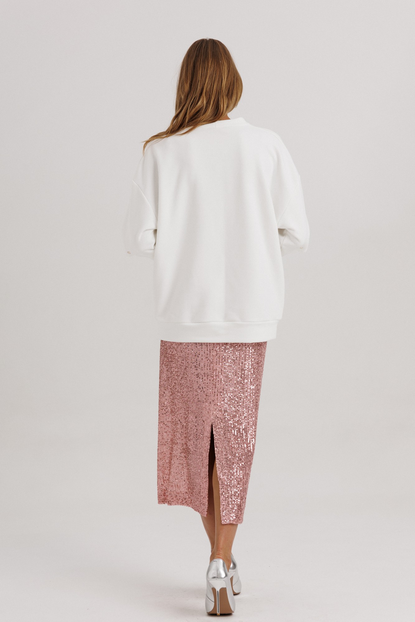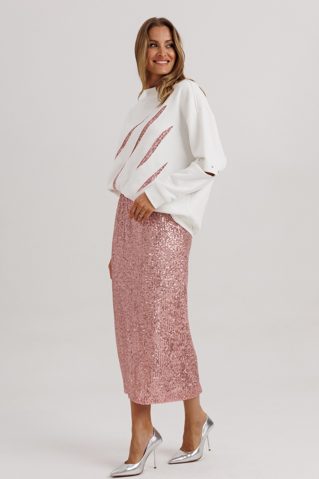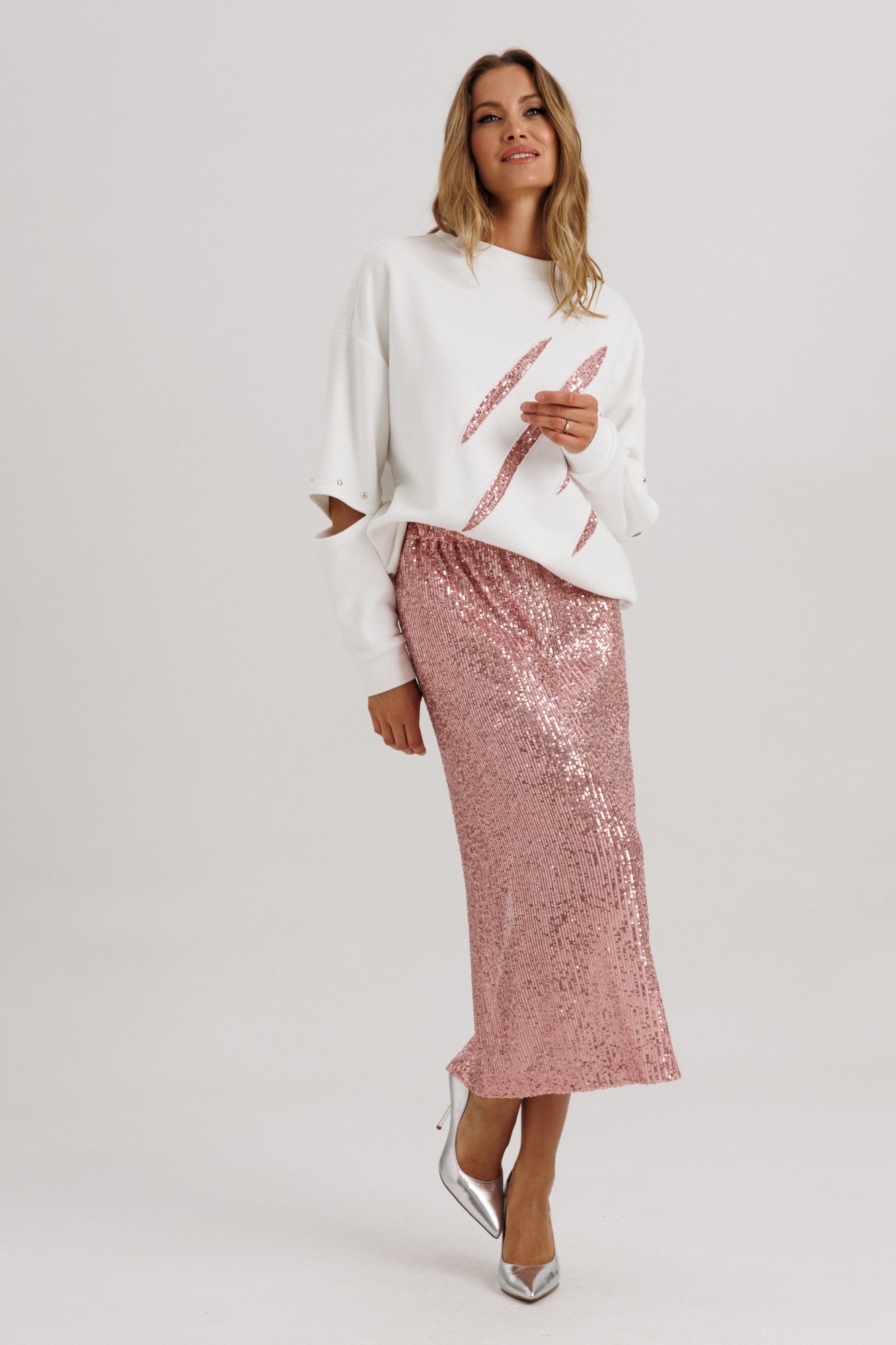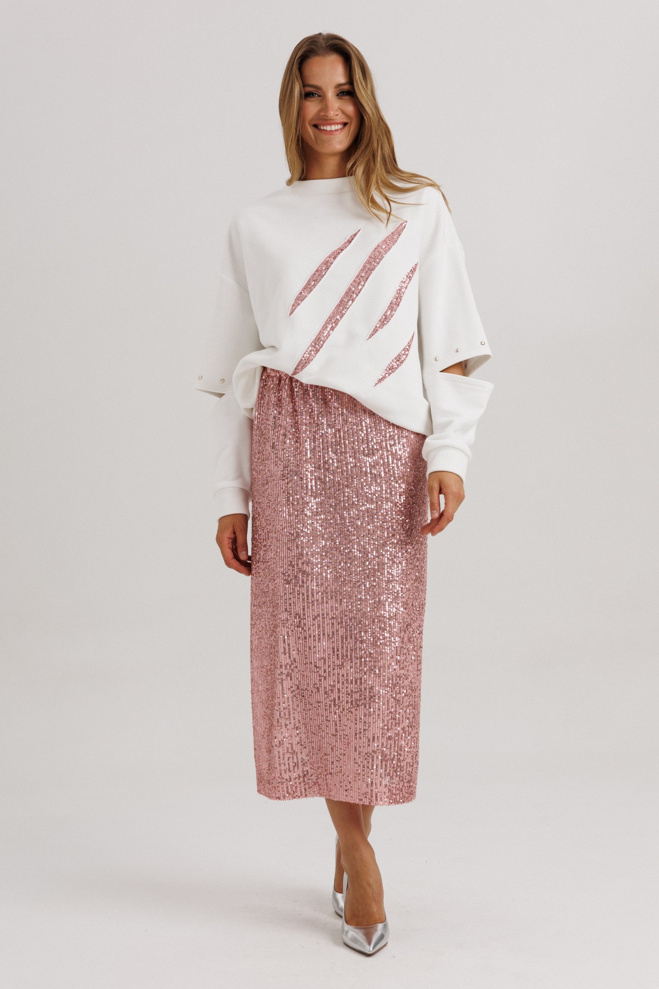 Блузон из уютного трикотажного полотна, свободного прямого силуэта. Линия плеча спущена, рукав прямой на зауженной манжете. Линия плеча состоит из притачного элемента: погона. Рукав основной состоит из двух деталей, в горизонтальном шве стачивания данных деталей расположен открытый разрез. По верхнему срезу расположены стразы. При желании длина рукава может трансформироваться и отверстием выступает открытый разрез. Длина рукава вместе с плечевой линией 75 см. Из них 13 см: длина плеча и 62 см: длина рукава. Высота манжета 5 см. На центральной части переда блузона расположены декоративные аппликационные элементы в виде ассиметричных полос из пайеток. Горловина округлая, оформлена притачной планкой, высотой 3 см. Низ блузона оканчивается притачной манжетой, высотой 6 см. Длина блузона по спинке изделия 70 см. Юбка из трикотажного полотна с пайетками, прямого свободного силуэта, на трикотажной подкладке. Линия талии оформлена притачным поясом на эластичной тесьме. Длина юбки по среднему шву спинки 78 см. (фурнитура может отличаться от представленной на рекламном фотоматериале). Особые рекомендации: рекомендуется холодная деликатная ручная стирка, без использования отбеливающих СМС, без интенсивного трения. Сушка в вертикальном положении. ВТО с минимальным паром.