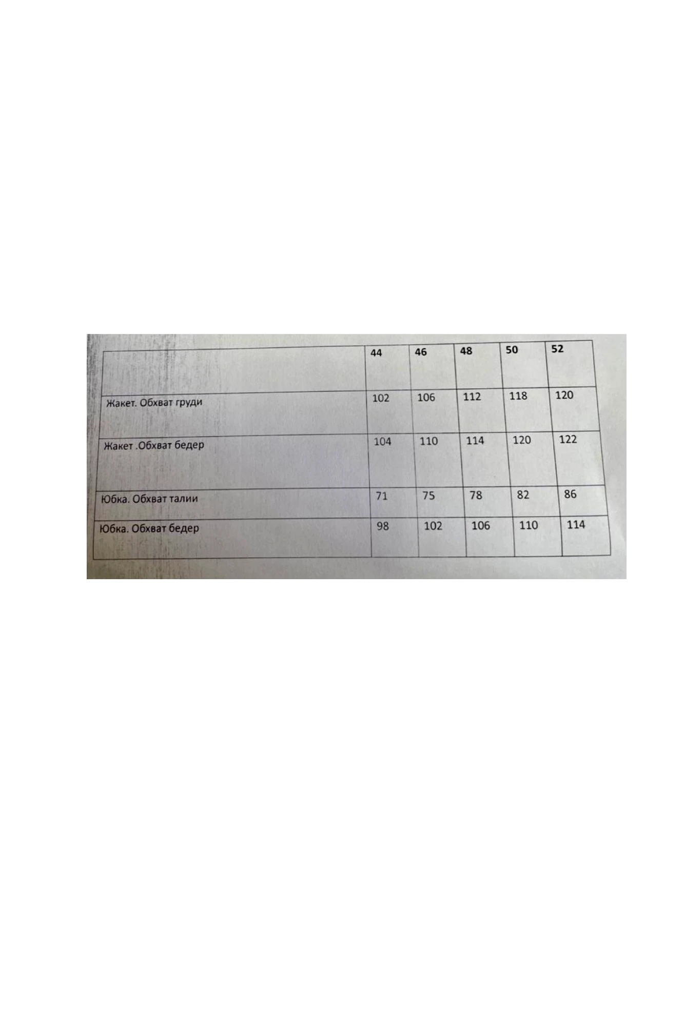 Таблица размеров