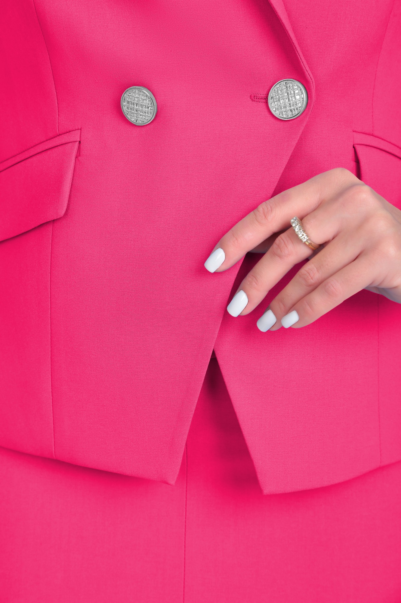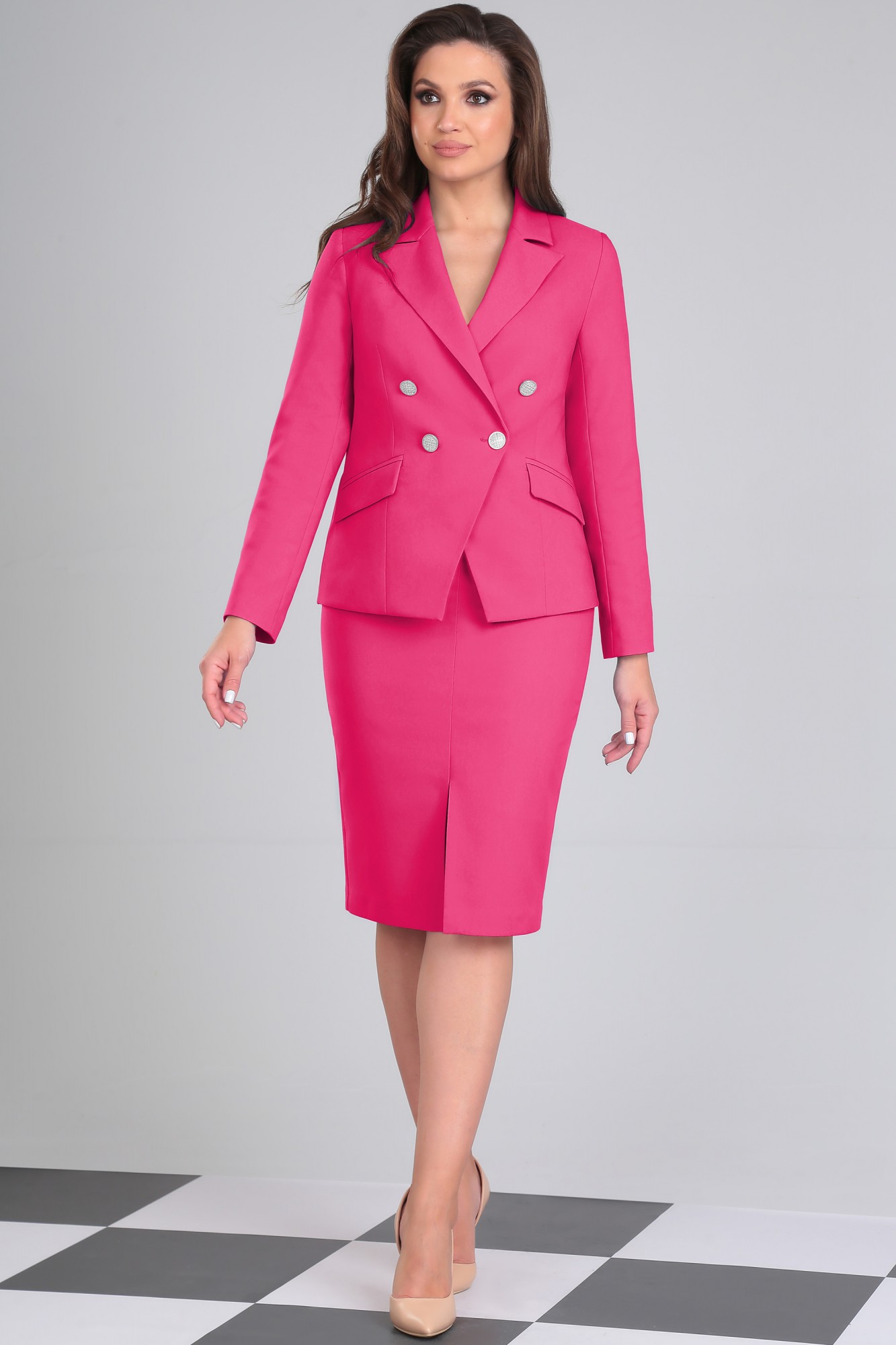 Комплект женский состоящий из жакета, юбки и блузки на бретелях. Жакет полуприлегающего силуэта на подкладке. По переду нагрудная выточка и прорезные функциональные карманы с клапаном. По спинке вертикальные рельефы из проймы и средний шов. Застежка ассиметричная (сверху двубортная, снизу однобортная) бортовая застегивающаяся на петли и декоративные пуговицы. Воротник пиджачного типа. Рукав втачной двухшовный длинный. Юбка на подкладке зауженная к низу на обтачке( без пояса). По переду фигурная кокетка и средний шов с разрезом. Застежка на потайную тесьму-молнию в среднем шве спинки.Топ из трикотажного полотна на узких регулируемых бретелях.