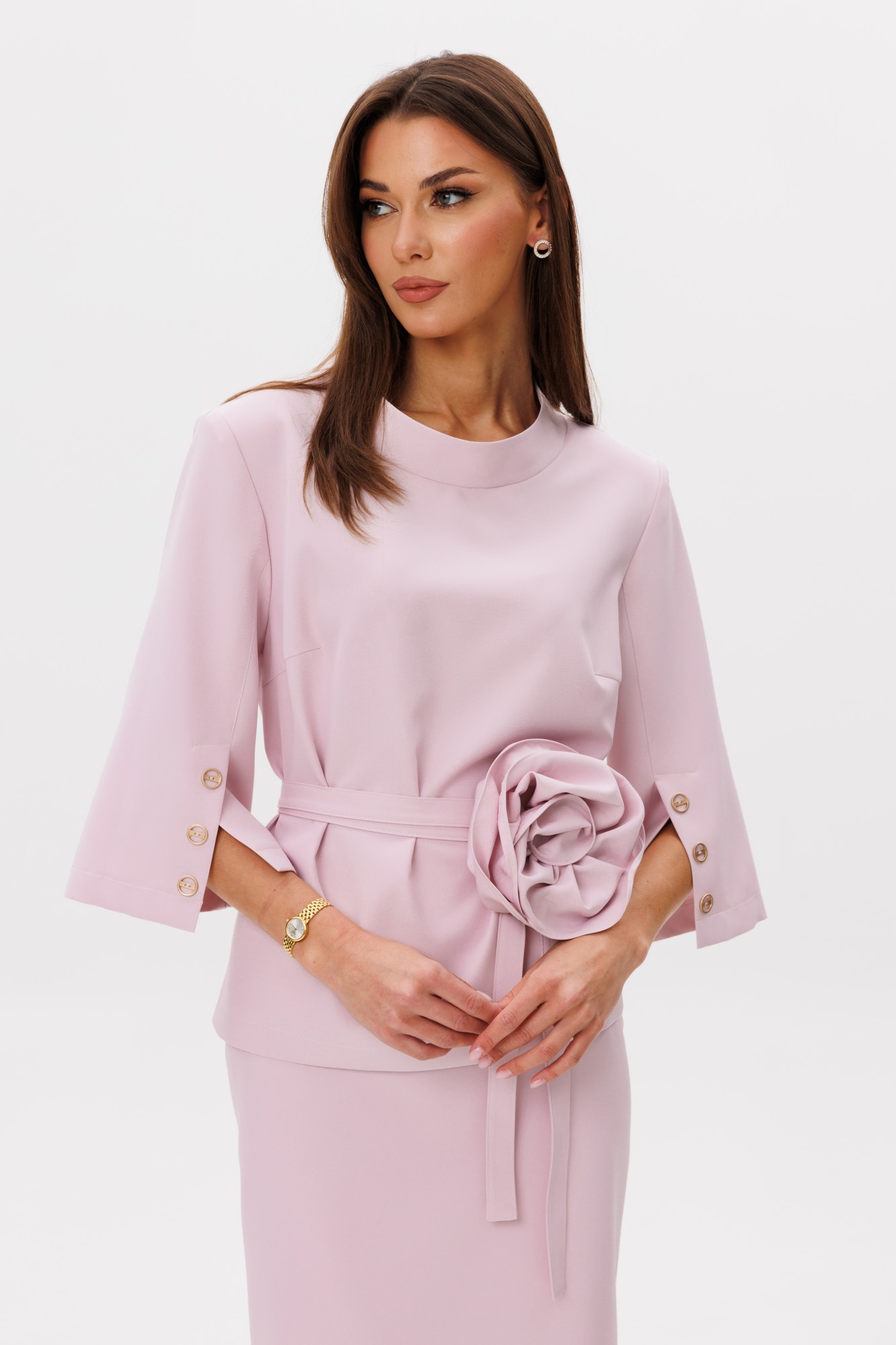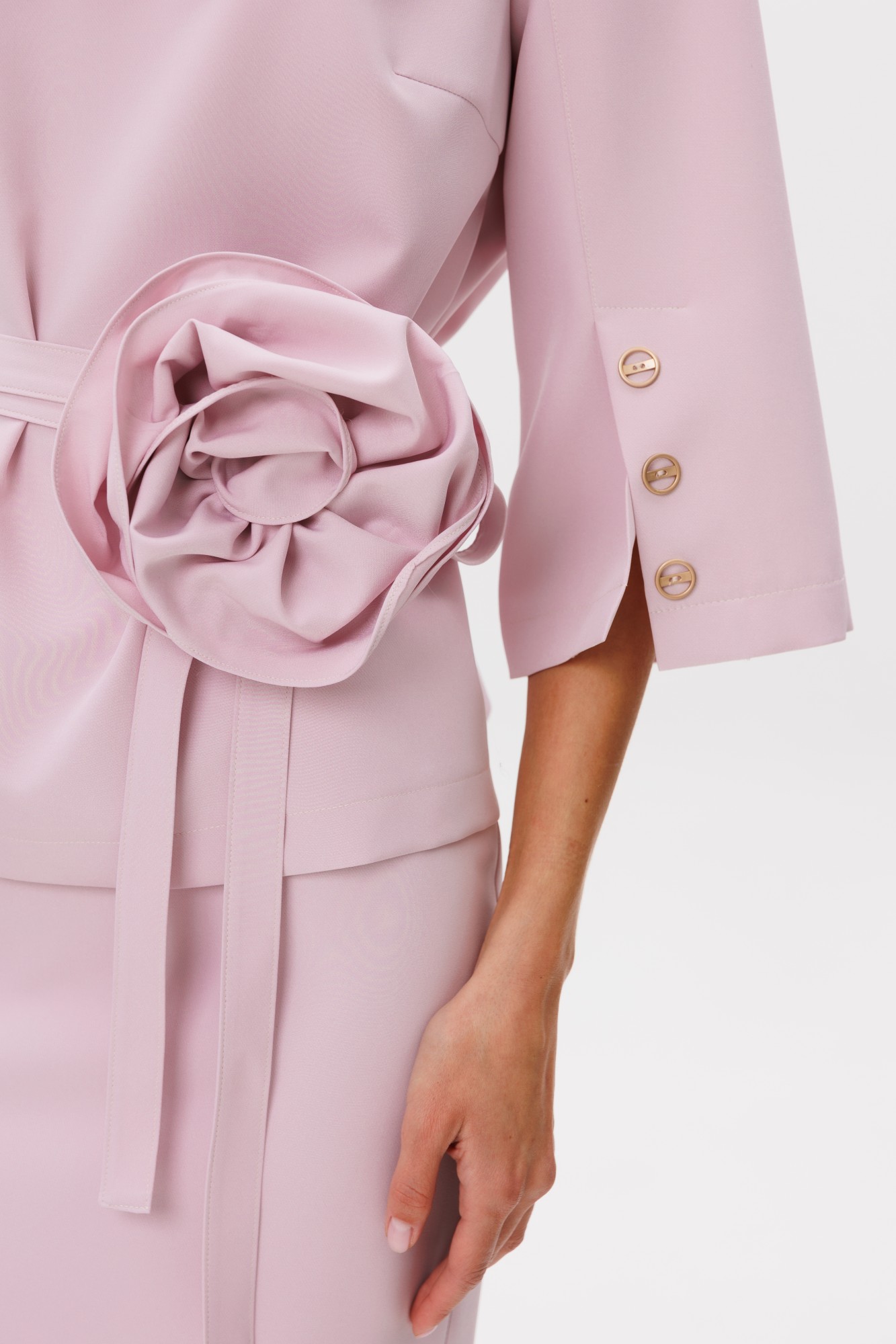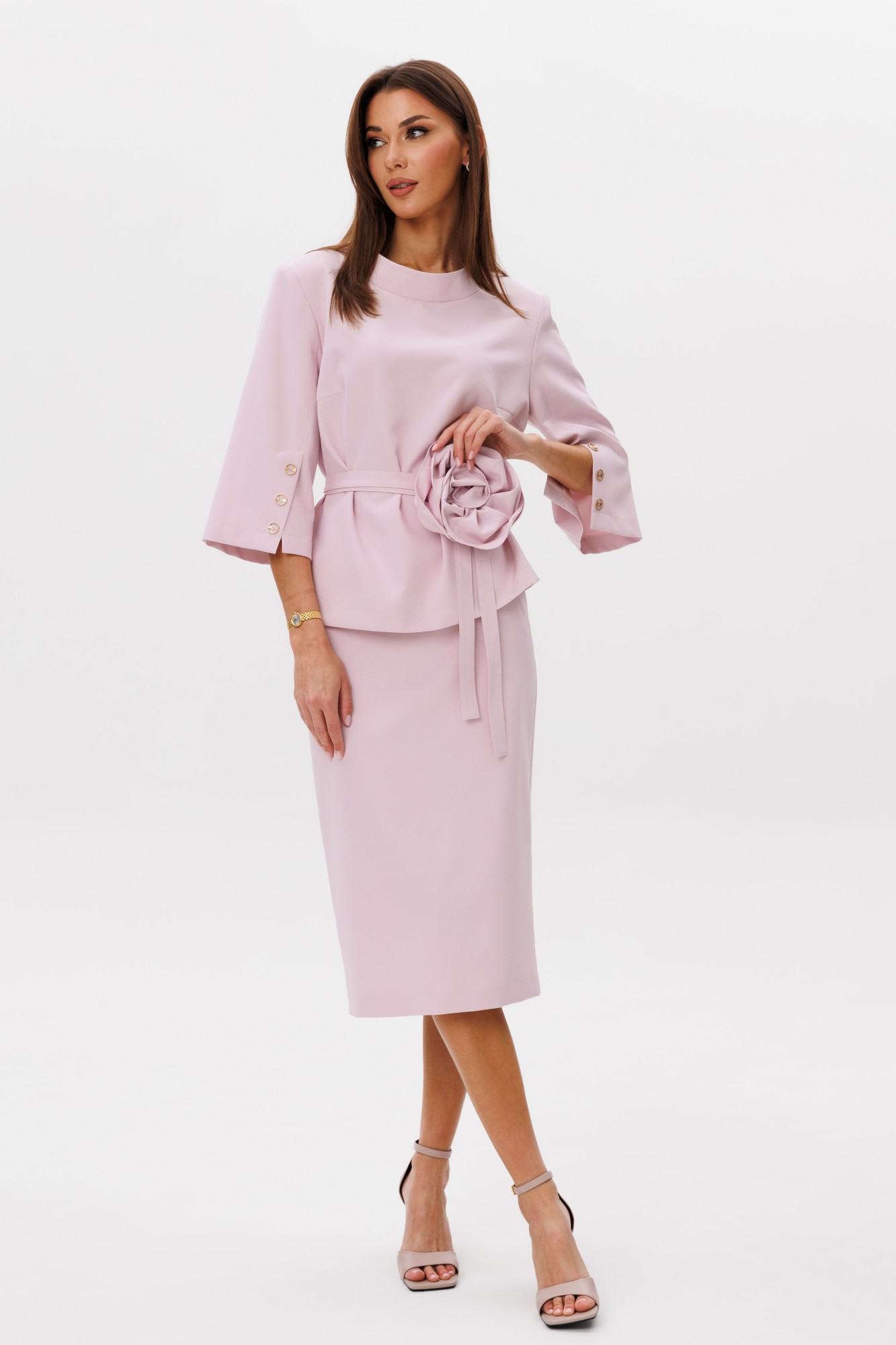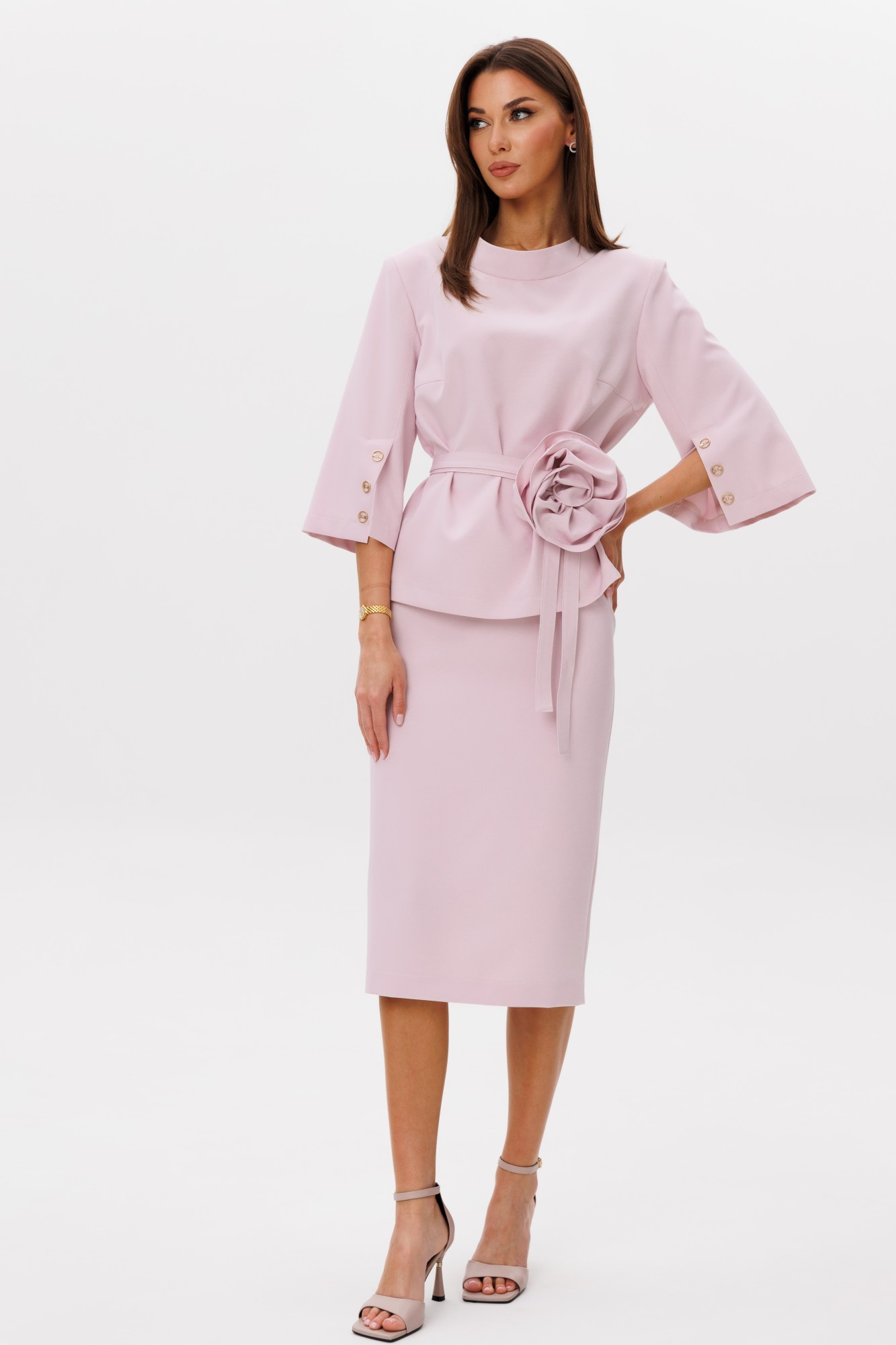 Элегантный комплект: полуприлегающий блузон со стойкой и облегающей юбкой прямого силуэта, поясом и текстильным украшением в виде цветка ручной работы.