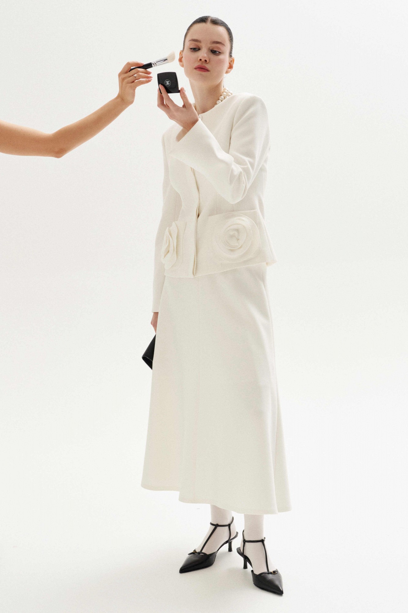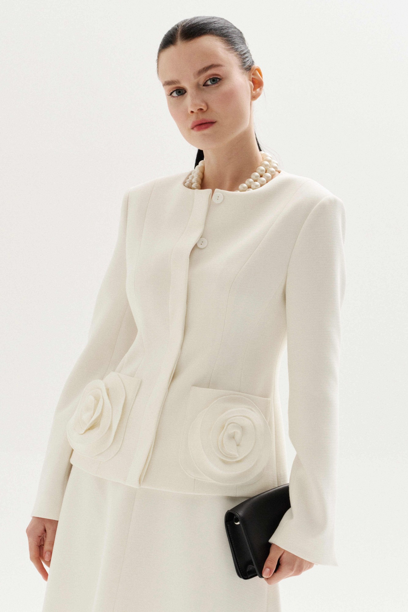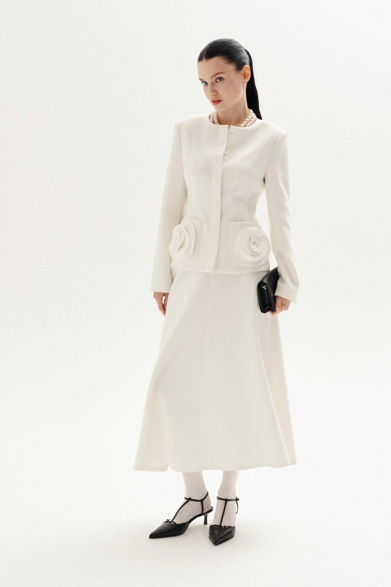 Комплект состоит из жакета и юбки. Жакет полуприлегающего силуэта на подкладке. Рукав втачной двухшовный, по локтевому шву шлица. По переду округлый вырез горловины, потайная застёжка на петли и пуговицы, рельефы из проймы и до линии низа, в области бёдер накладные карманы на подкладке с настрочным цветком из основной ткани. По спинке средний шов и рельефы. Юбка А-силуэта на притачном поясе, на подкладке. На передней части юбки средний шов, по задней части юбки средний шов, переходящий в застёжку на потайную молнию.