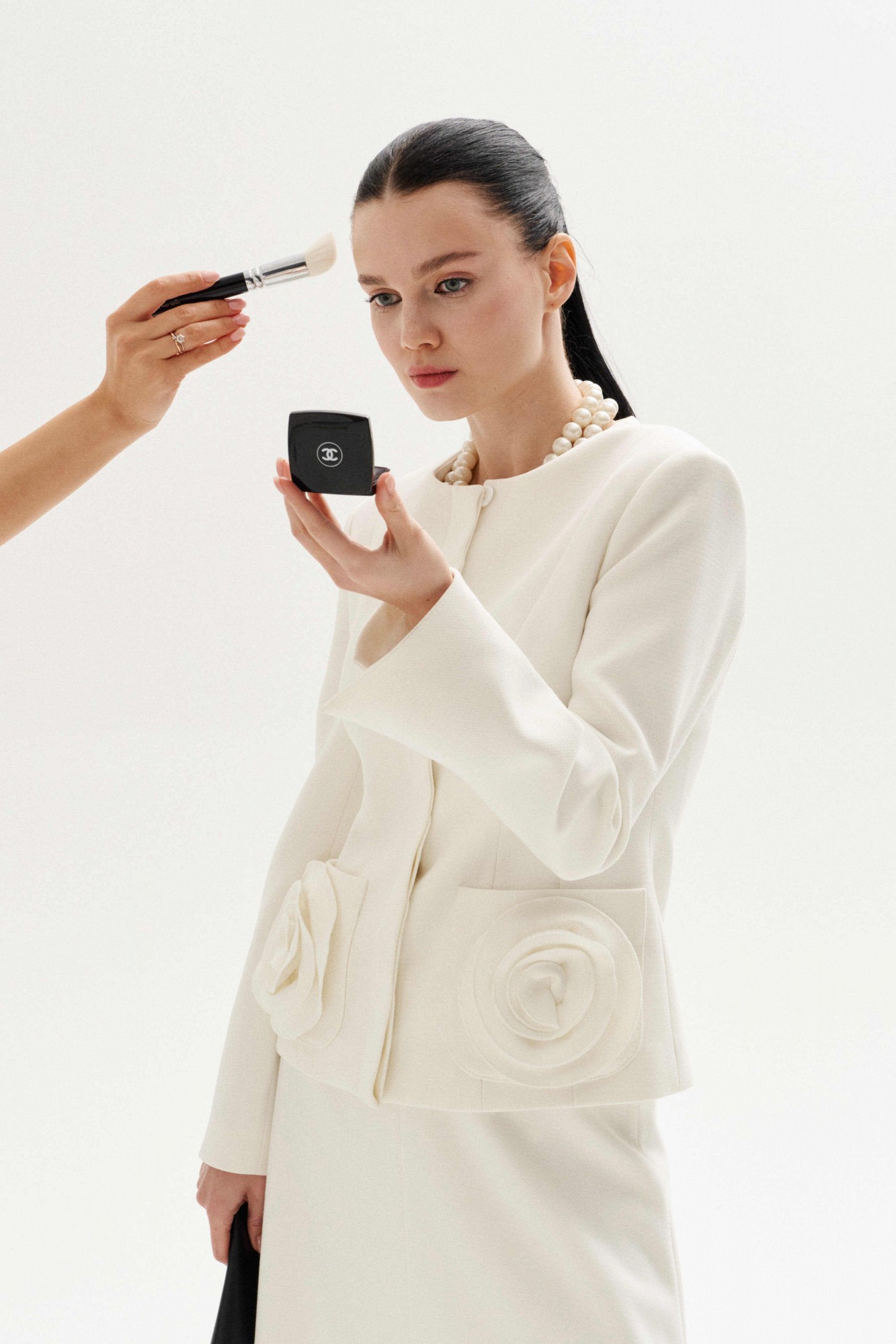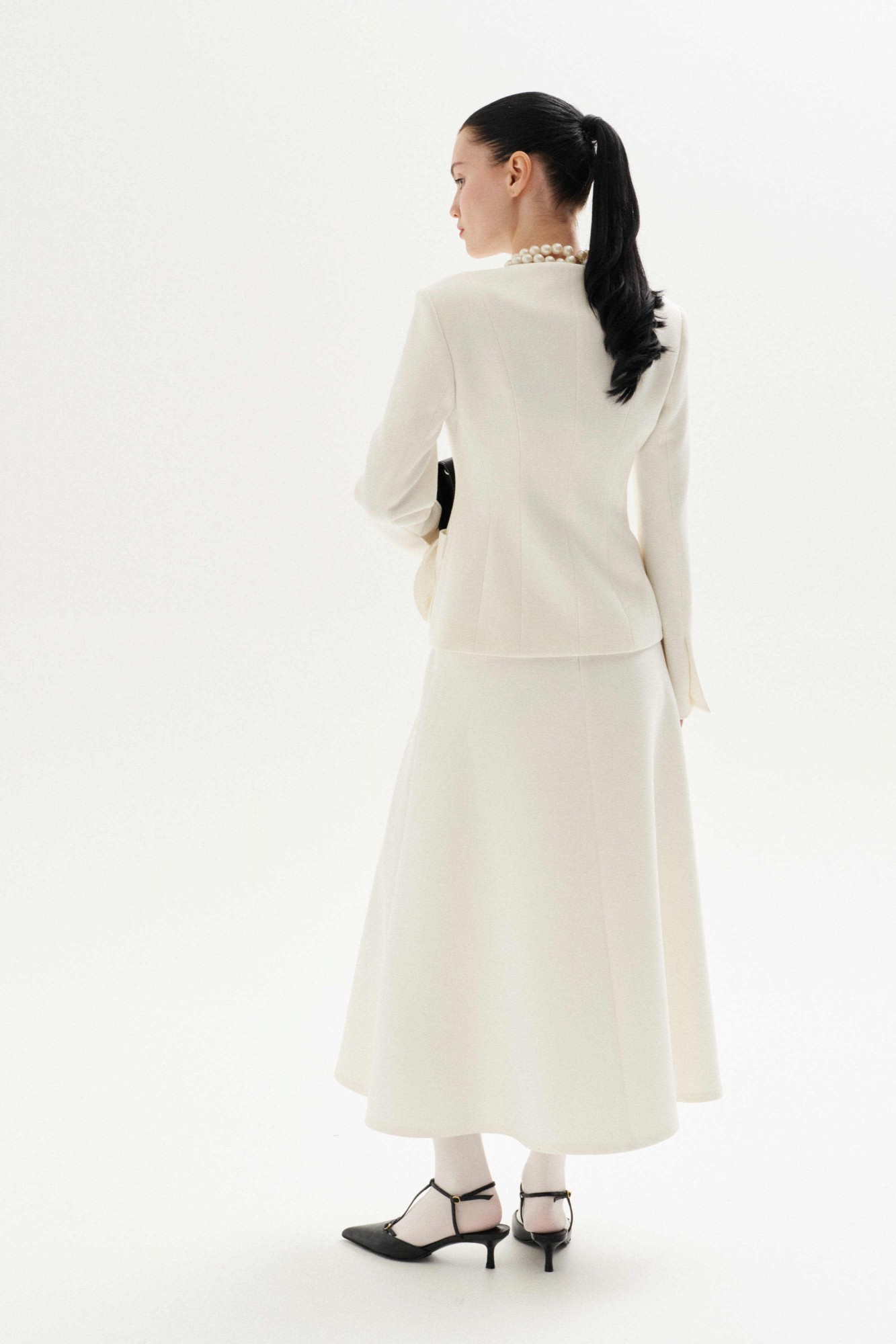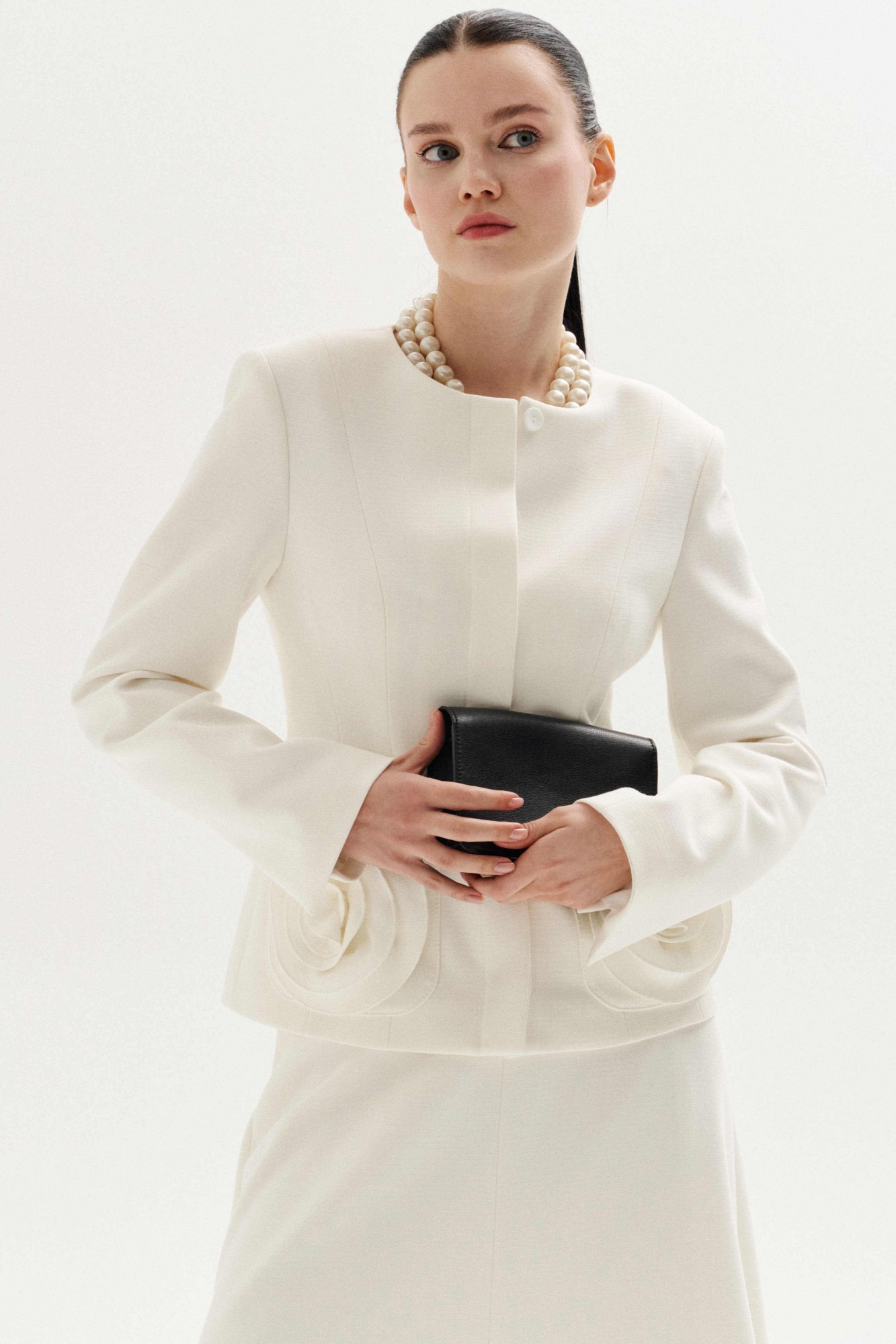 Комплект состоит из жакета и юбки. Жакет полуприлегающего силуэта на подкладке. Рукав втачной двухшовный, по локтевому шву шлица. По переду округлый вырез горловины, потайная застёжка на петли и пуговицы, рельефы из проймы и до линии низа, в области бёдер накладные карманы на подкладке с настрочным цветком из основной ткани. По спинке средний шов и рельефы. Юбка А-силуэта на притачном поясе, на подкладке. На передней части юбки средний шов, по задней части юбки средний шов, переходящий в застёжку на потайную молнию.