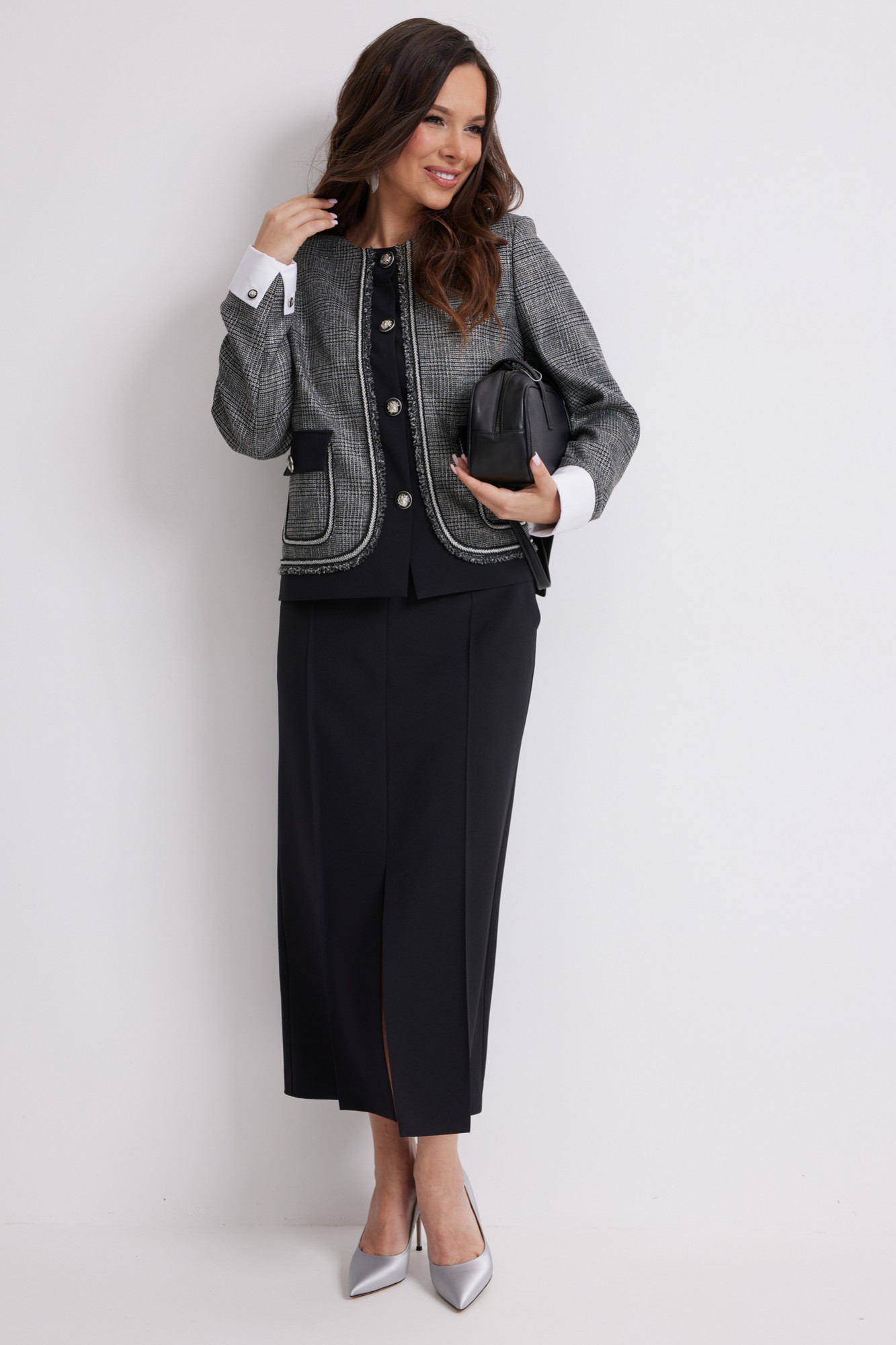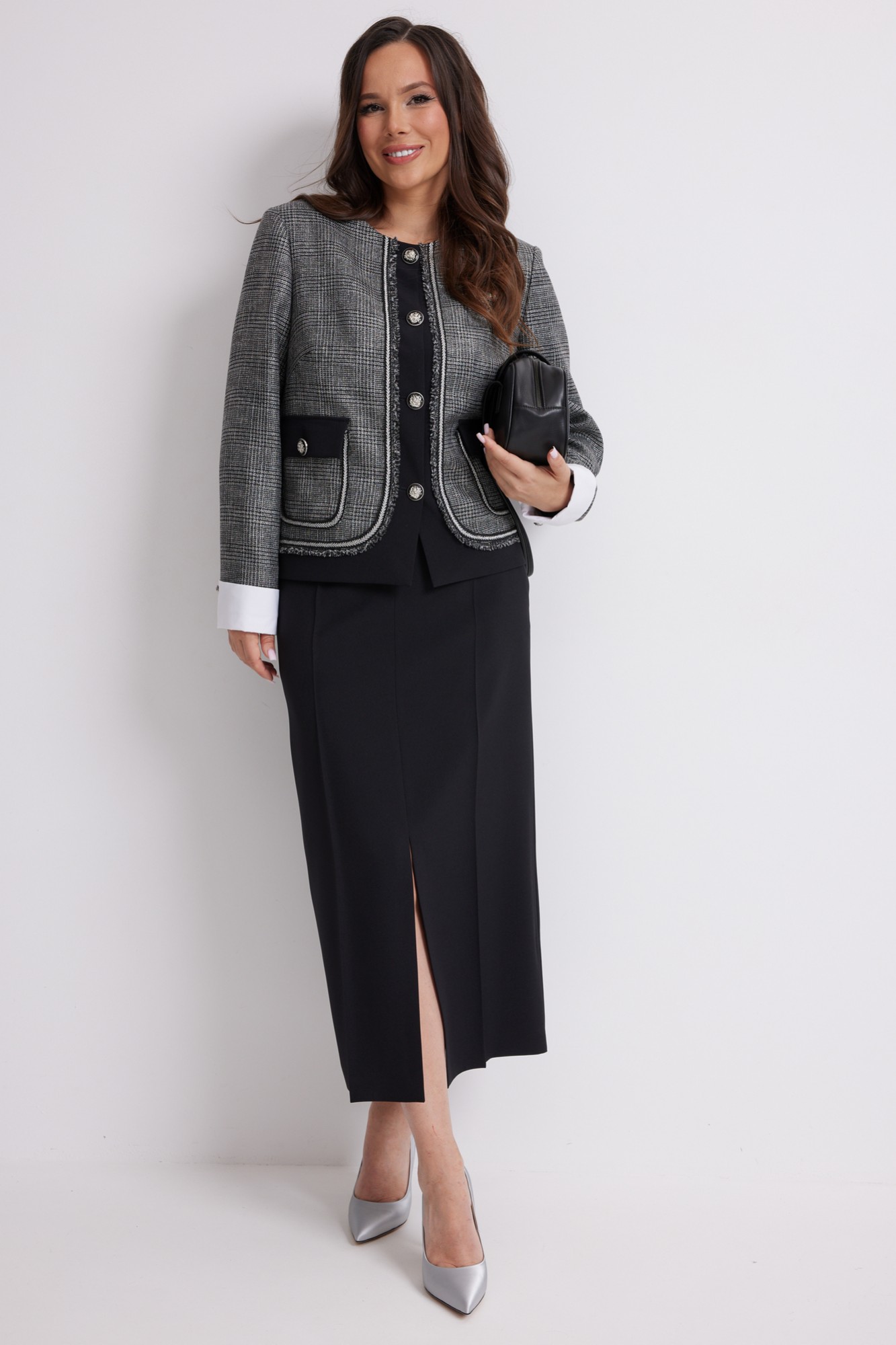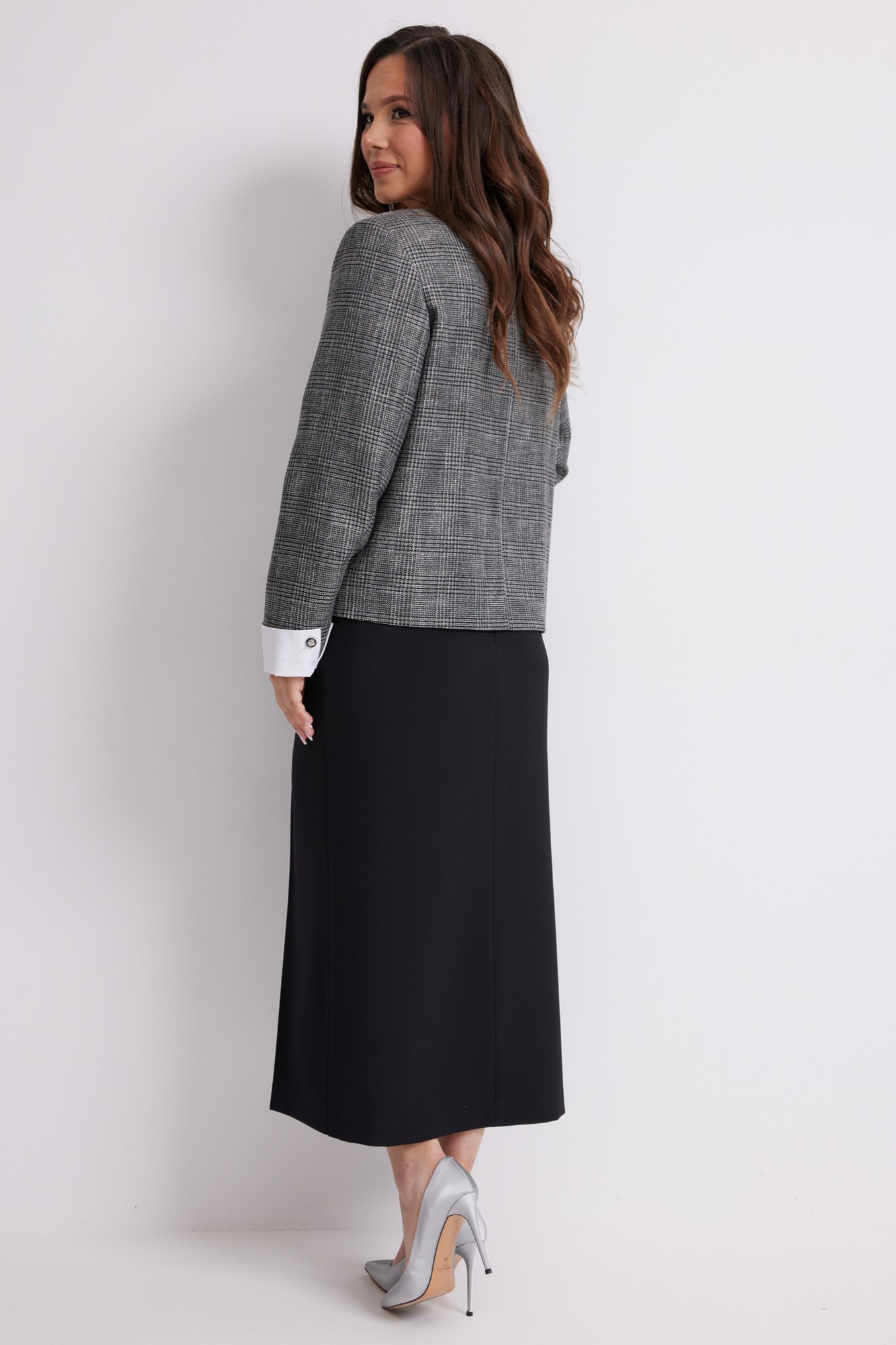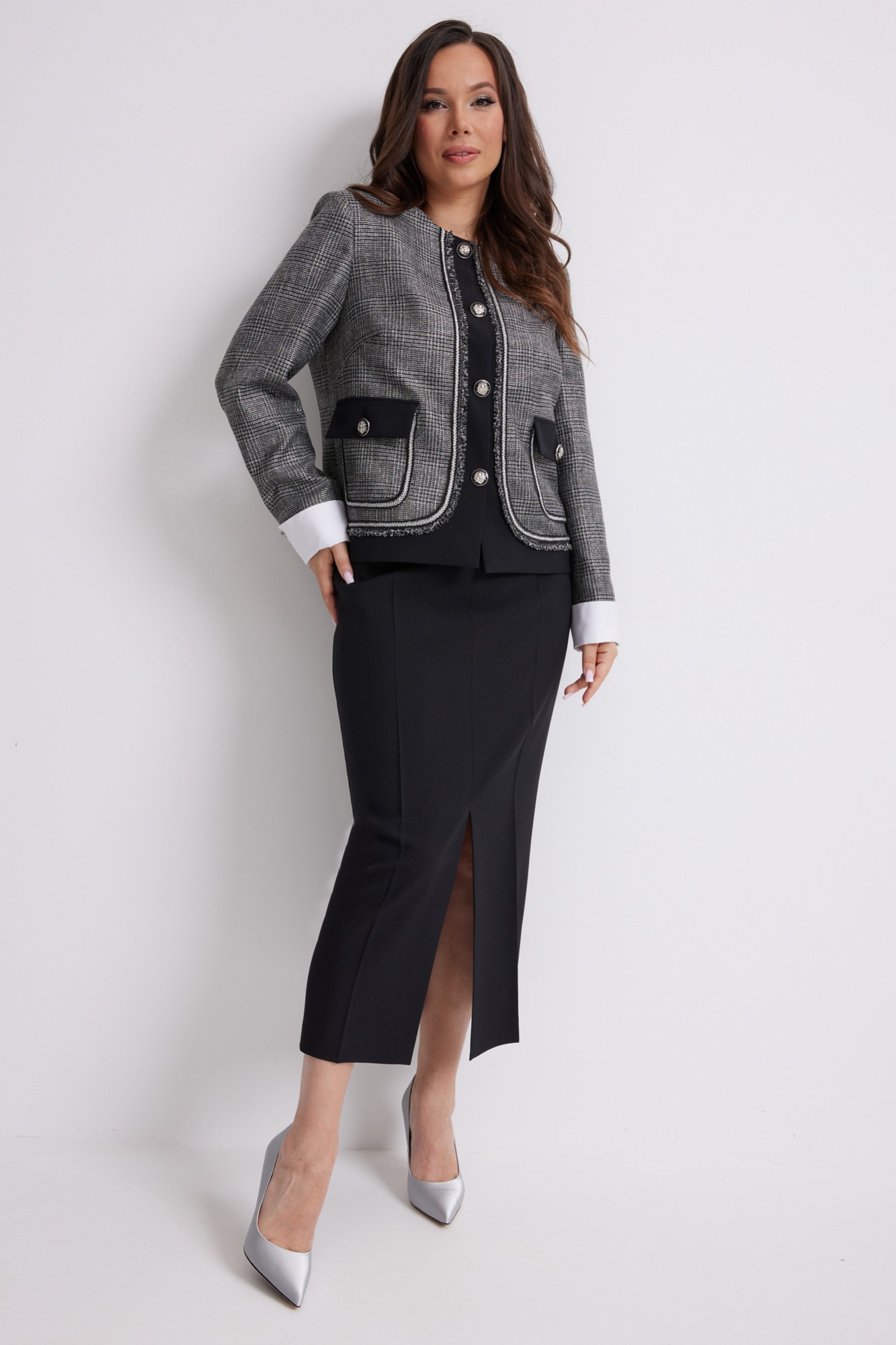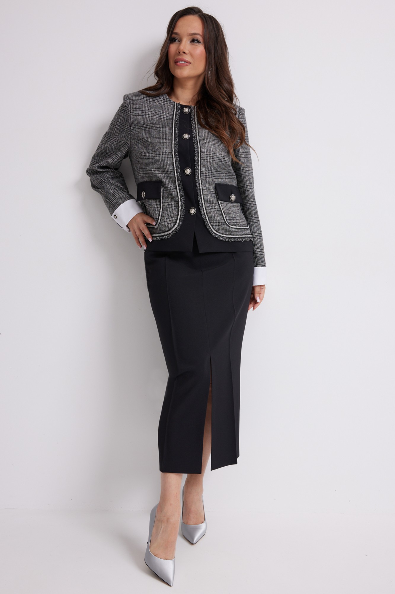 Стильный комплект из жакета и брюк. Жакет прямого кроя, на подкладке, с центральной застежкой на красивые пришивные пуговицы. Рукав втачной, дополнен съемными белыми манжетами. Выполнен жакет из красивой костюмной ткани. Юбка миди прямого кроя, на подкладке, с удобным разрезом спереди. Дополнена удобными боковыми и накладными задними карманами. Юбка с притачным поясом со шлевками для ремня, с застежкой по спинке на потайную молнию и пуговицу.