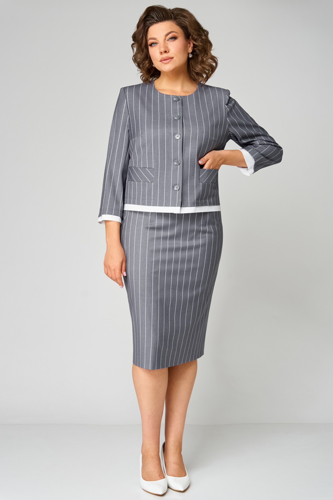Элегантный женский комплект 2-ух предметный, состоящий из жакета и юбки. Жакет укороченный полуприлегающего силуэта, частично на подкладке по полочкам. Округлый вырез горловины. По переду прорезные карманы с листочкой. По низу переда вставка из белого хлопка. Спинка со встречными складами и вставкой из белого хлопка. По линии талии сзади вставлен хлястик на 1 пуговицу и петлю. Застежка центральная на 5 пуговиц и петель. Рукав втачной, двухшовный длиной 7/8 со съемными манжетами из холопка. Застегиваются манжеты на 4 пуговицы и петли. Длина жакета 51см, длина рукава с манжетой 51см. Юбка с завышенной талией заужена к низу на обтачке. Сзади разрез и застежка на потайную тесьму-молнию. Юбка на подкладке. Длина юбки 66см.