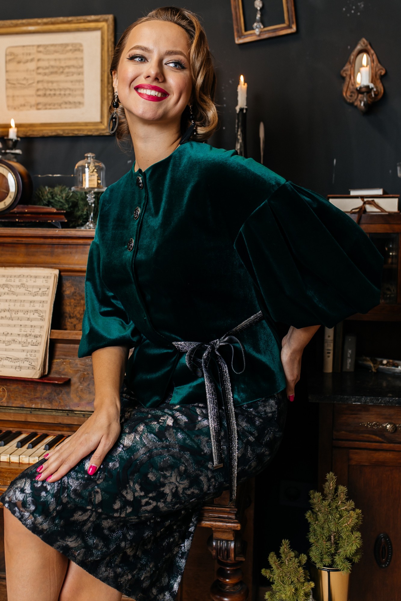 Нарядный комплект, состоящий из жакета и юбки. Комфортный жакет из велюра полуприлегающего силуэта с центральной комбинированной застежкой на 3 пуговицы и 3 потайные кнопки. Спинка со средним швом и талиевыми вытачками. По переду также талиевые вытачки. Горловина округлой формы. Объемные фантазийные рукава со складками смягчают строгий силуэт. Декором выступают декоративные пуговицы и завязка на талии. Юбка двухслойная, заужена к низу. Верхний слой выполнен из кружевного полотна (гипюра). Нижний - из трикотажного эластичного полотна с блестящим напылением. Молния и шлица в среднем шве. По талии кокетки. Костюм на подкладке.