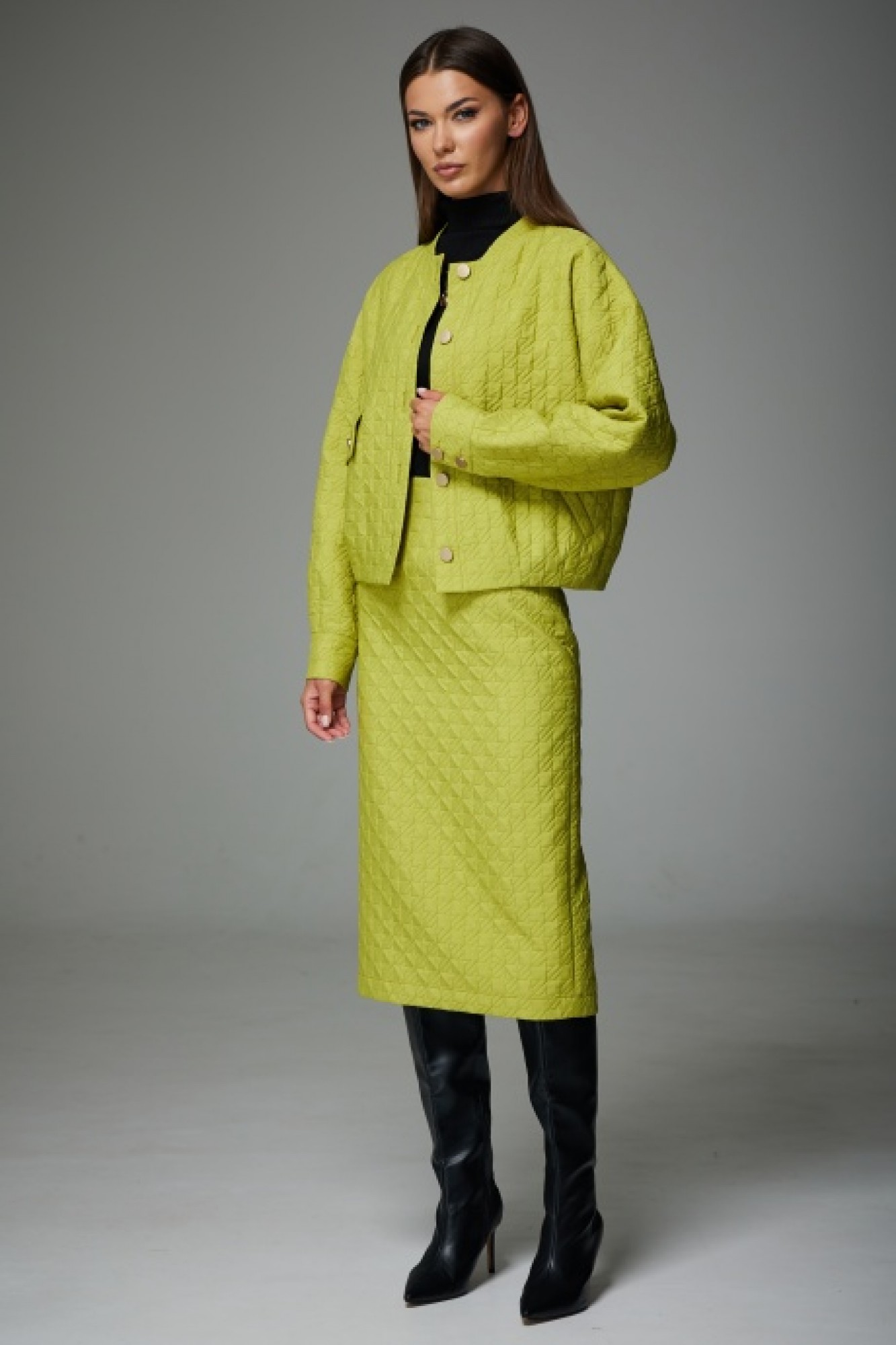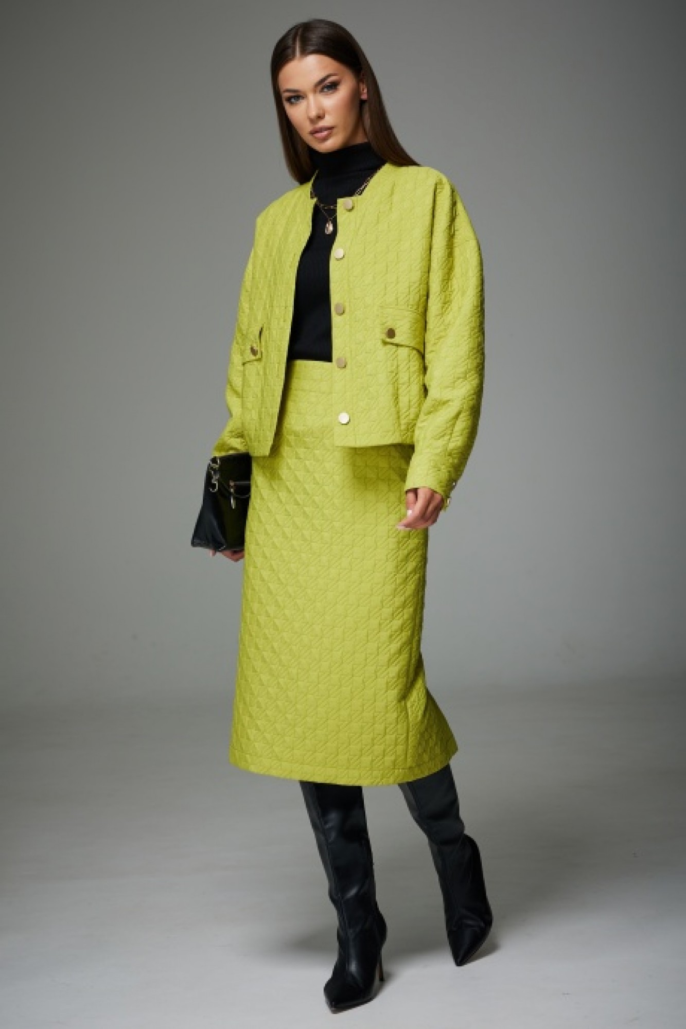 Юбка прямая, к низу заужена, с завышенной талией (цельнокроеным поясом). На переднем полотнище талевые вытачки расположены попарно. На заднем полотнище расположен средний шов со шлицей и застежкой на тесьму – «молнию», а также расположены талевые вытачки.