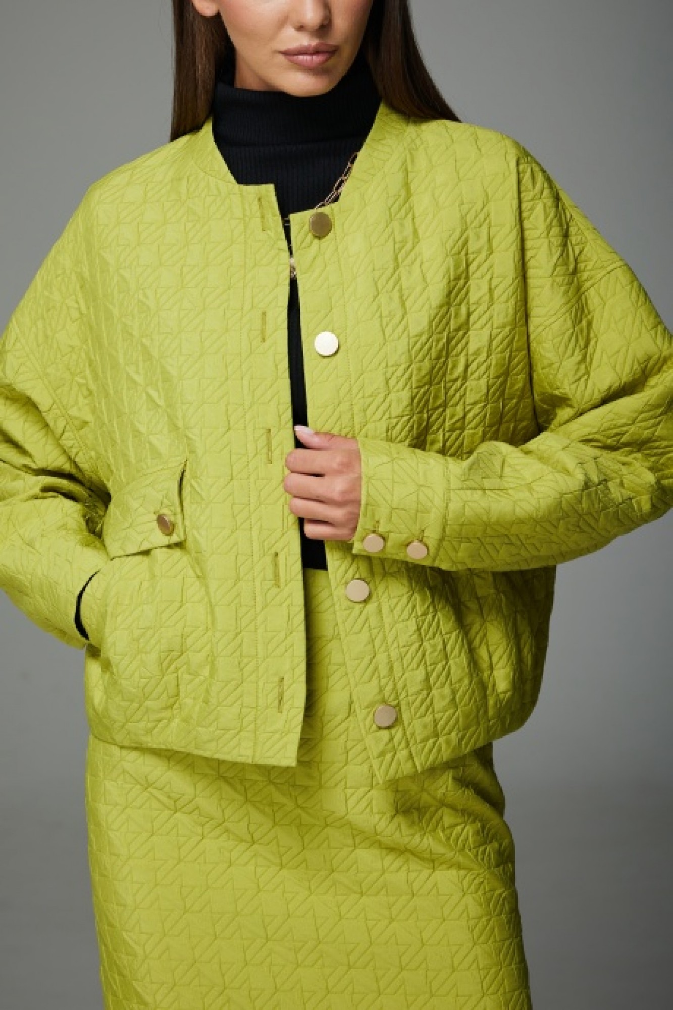 Жакет покроя спущенной плечо, рукав двушовный с манжетой по низу на две петли-пуговицы, по низу рукава расположены вытачки создающие объемную форму. Горловина округлой формы, оформлена воротником стойкой покроенным по косой. По низу спинки и переда застрочены вытачки, что создает форму бочонка. По переду расположены наклонные прорезные карманы в листочку и покроенные по косой притачные клапаны. Дополнением жакету служат пуговицы в цвет золота.