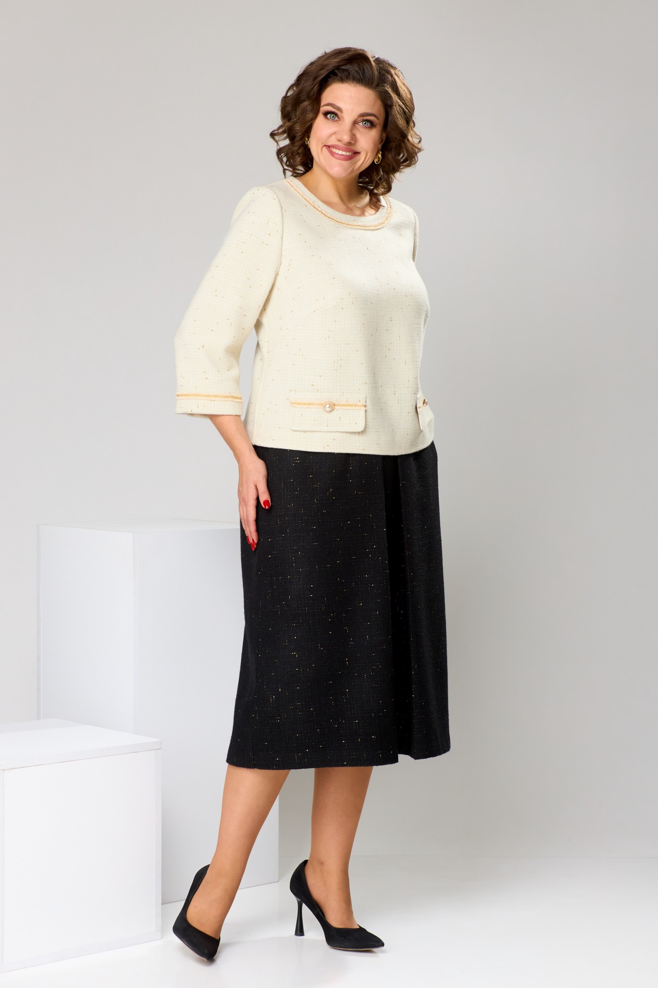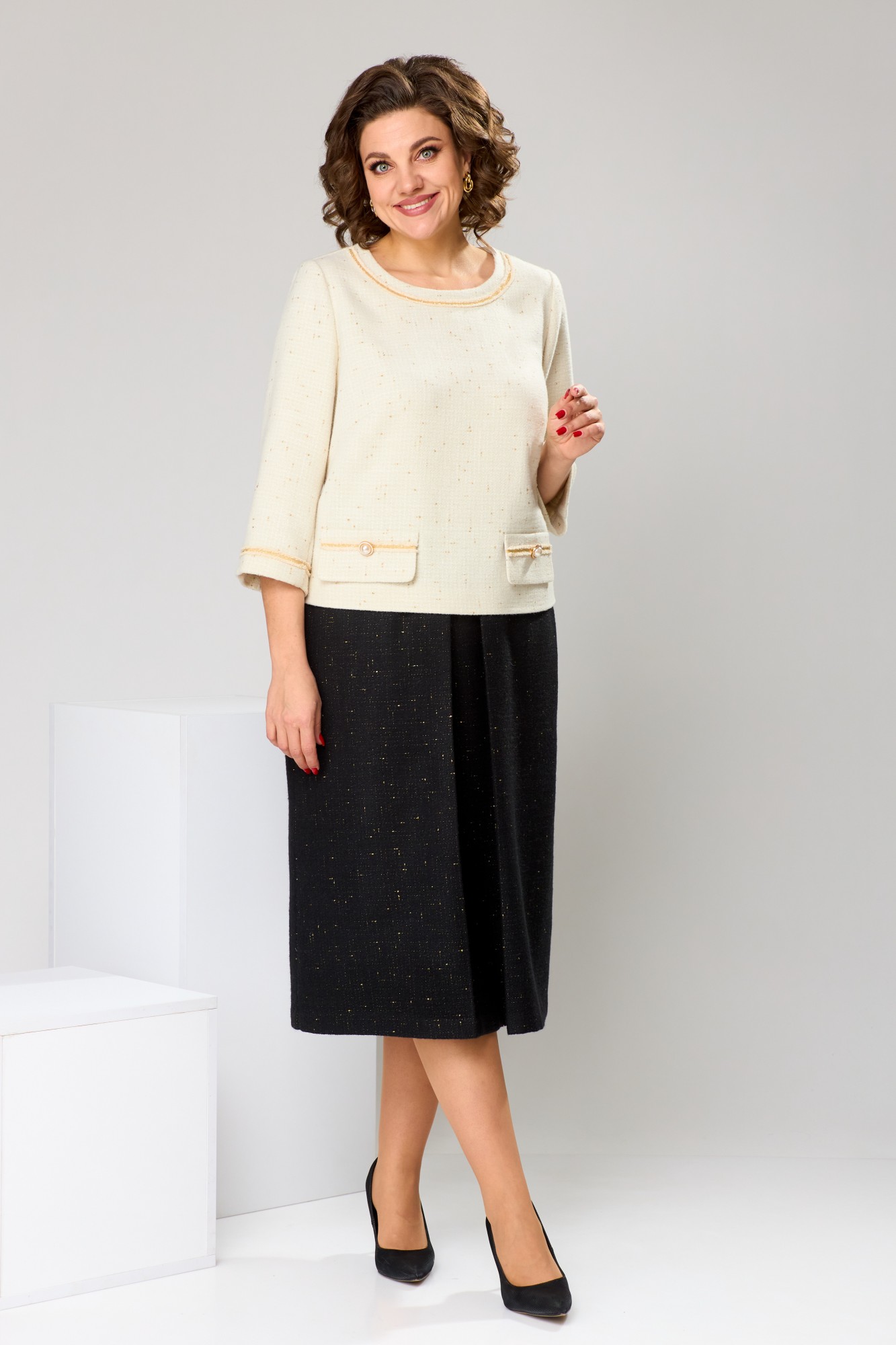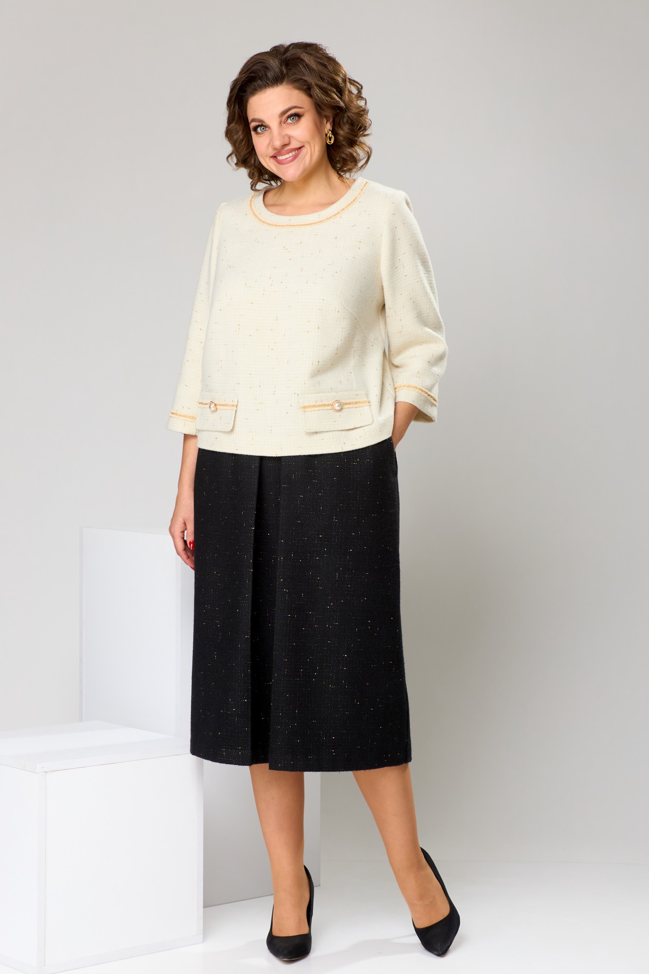 Костюм женский, предназначен для повседневной носки. Костюм 2-ух предметный блузон и юбка. Блузон прямого силуэта, длиной до линии бёдер. Перед с 2-мя нагрудными вытачками, с 2-мя надстрочными клапанами, декорированными отделочной тесьмой и пришивными пуговицами. Спинка с надстрочной планкой, декорированной 3-мя пришивными пуговицами. Горловина круглая, обточная, без воротника, по переду декорирована отделочной пришивной тесьмой. Рукав втачной, 2-х шовный, длиной 7/8, низ декорирован надстрочной отделочной тесьмой. Блузон с плечевыми накладками. Юбка женская, слегка расширена к низу, длиной ниже колена. Переднее полотнище с карманами в боковых швах, с одной встречной складкой по центру. Заднее полотнище с 2-мя таллиевыми вытачками. Юбка с притачным поясом, собранным на эластичную тесьму и закреплённую отделочной строчкой. Юбка на подкладке.