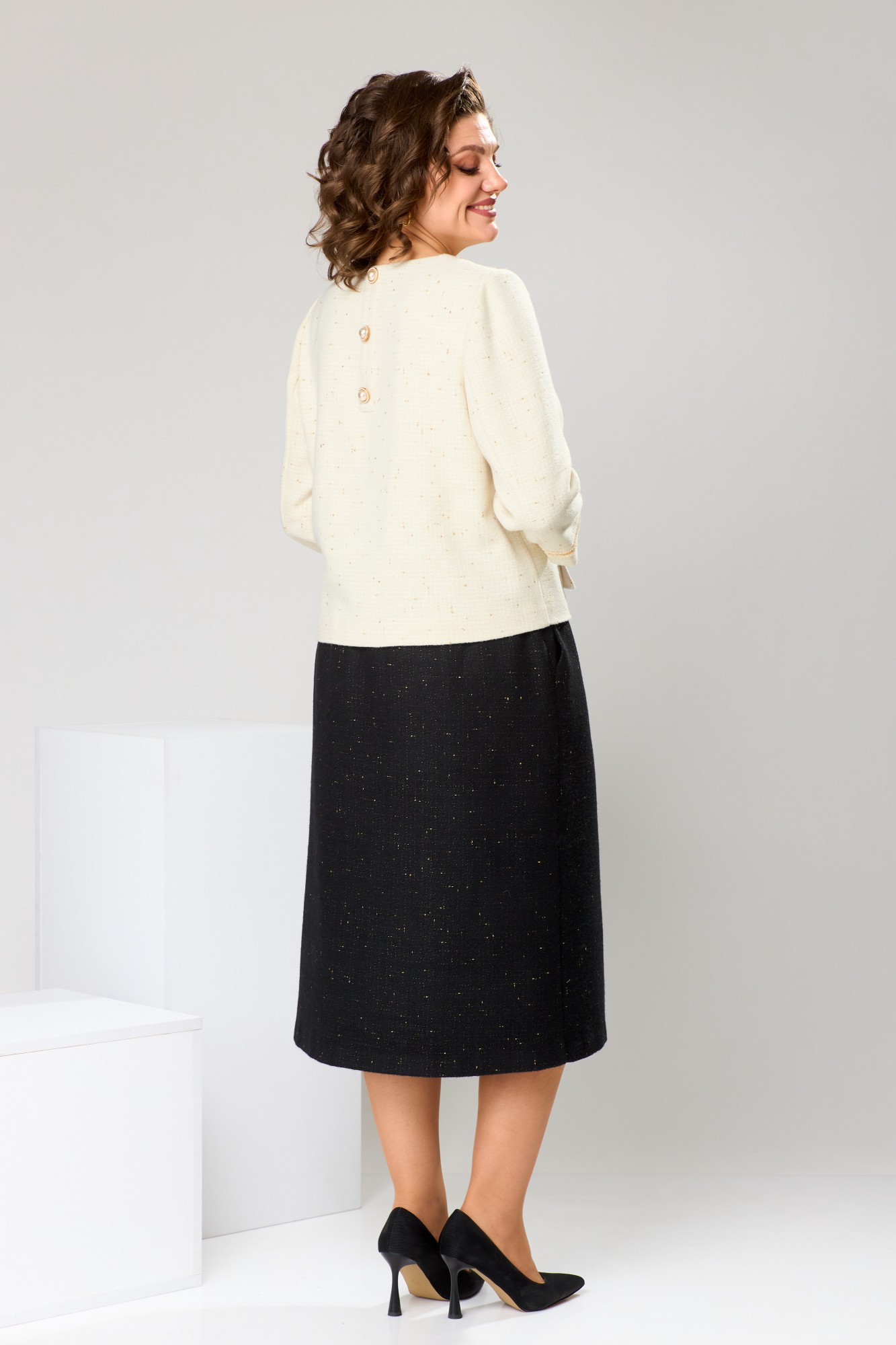 Длина по боковому срезу юбки 72 см, длина спинки блузона 53 см, длина рукава 48 см.