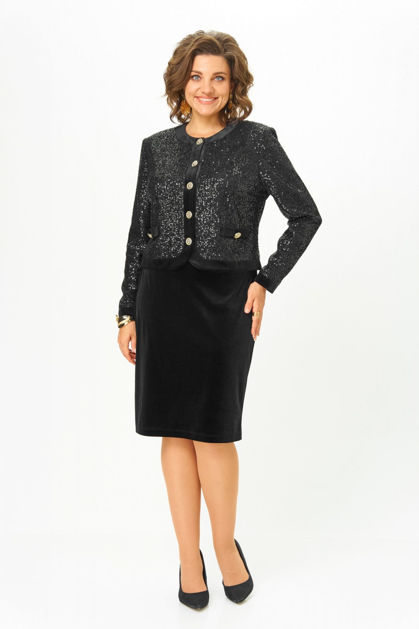 Костюм женский в двухпредметный состоящий из жакета и юбки. Жакет в стиле «Шанель» полуприлегающего силуэта с втачным рукавом, на трикотажной подкладке. Горловина округлой формы. Застежка центральная на пять обметанных петель и пять акцентных пуговиц. Перед с вытачками по линии груди, в нижней части декоративные карманы. По горловине, краю борта, низу жакета и рукавов отрезная планка. Юбка женская, длиной за колено, слегка заужена к низу. Верх на притачном поясе с эластичной тесьмой.