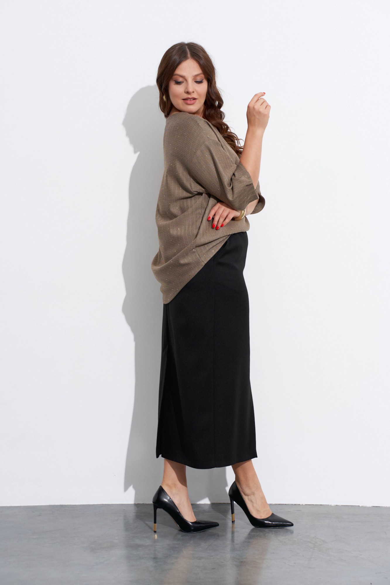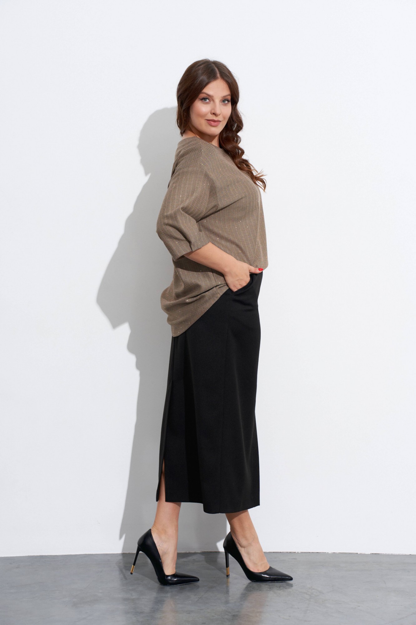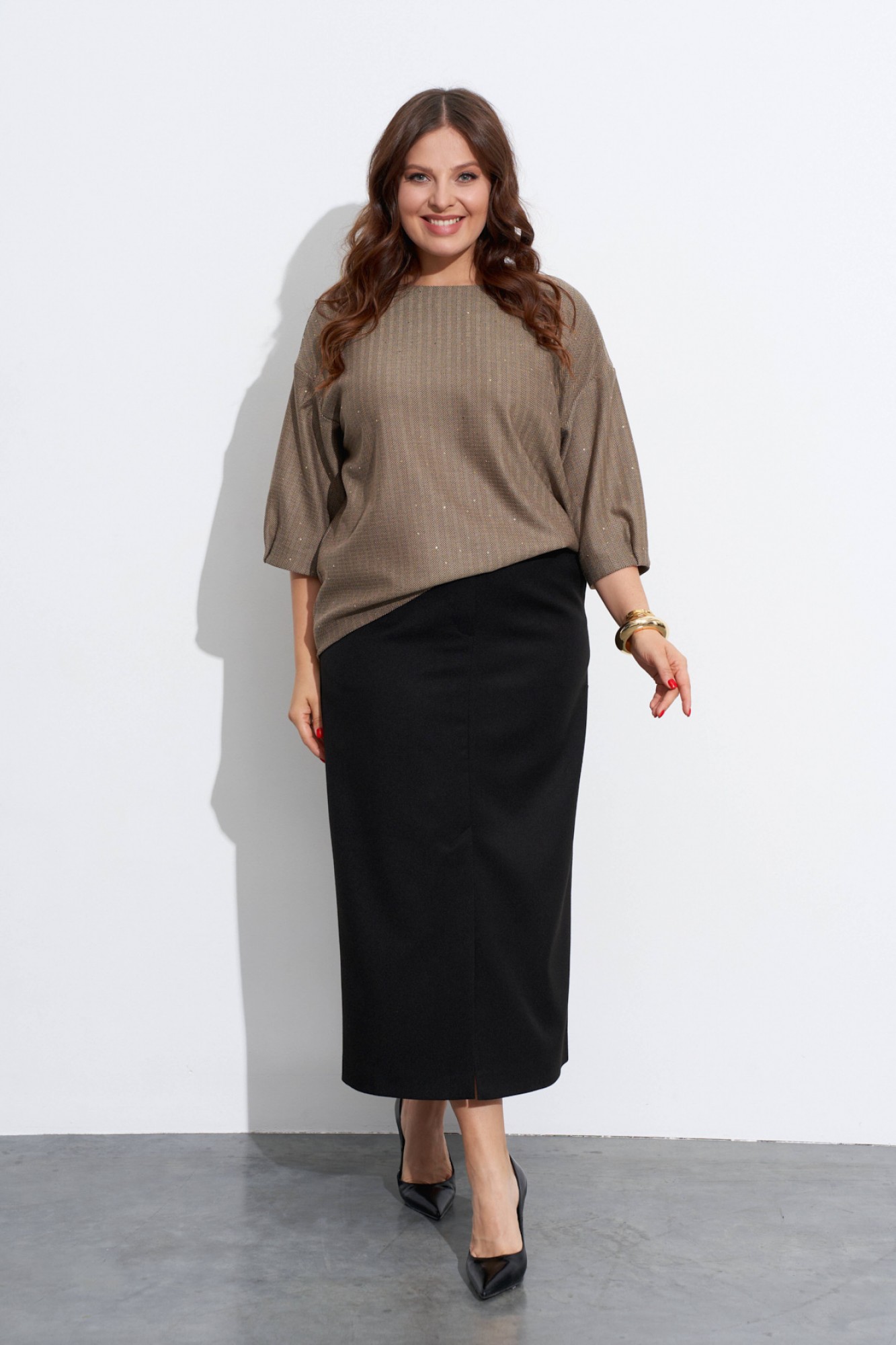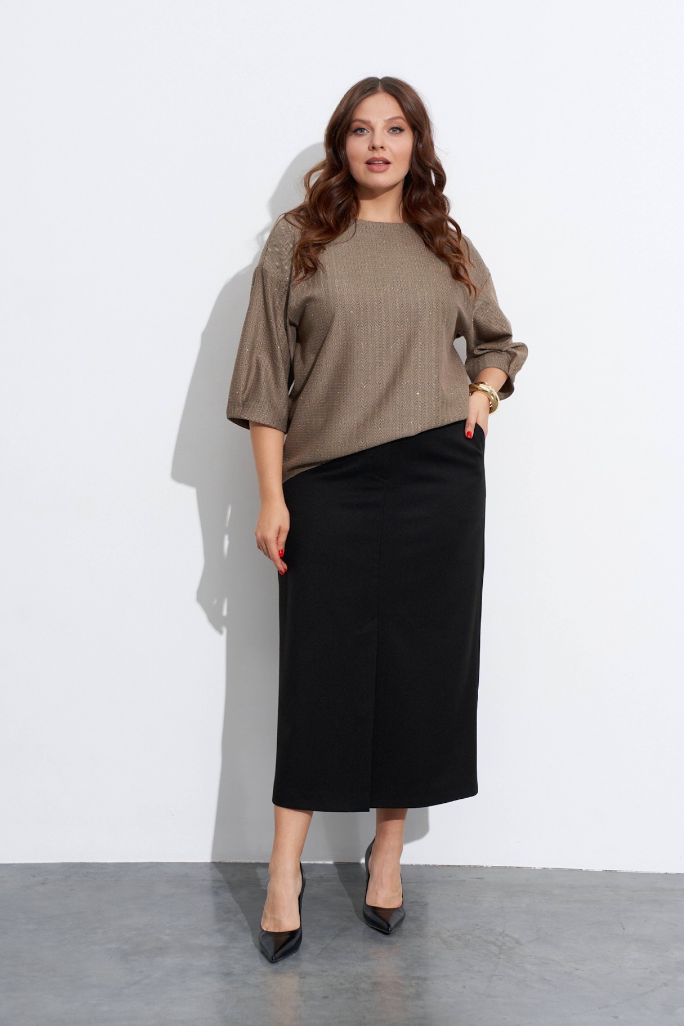 Комплект-двойка из юбки и блузы. Блуза объёмная, прямого силуэта, с мягкой линией плеча и рукавами в ¾ длины. Низ переда и спинки фигурный, разной длины. Горловина округлая, на спинке обработана короткая металлическая молния. Низ рукавов со складками. Юбка прямого силуэта. Спереди и сзади обработаны средние швы со шлицами в низу. На передних полотнищах обработаны карманы с косым входом и застёжка на молнию. Верх юбки на