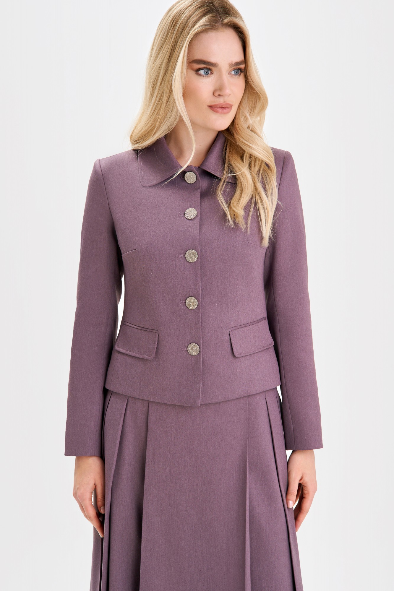 Изящный костюм с идеальным кроем, достоин гардероба настоящей леди. Этот костюм подчеркнет чувство стиля и хороший вкус его обладательницы. Костюм женский из костюмно-плательной ткани, состоит из жакета полуприлегающего силуэта и юбки. Костюм для повседневной носки. Жакет женский с центральной бортовой застёжкой до верха на 5 петель и пуговиц (размер и цвет фурнитуры может незначительно отличаться от фото), на подкладке. Перед жакета с рельефными швами, выходящими из проймы и идущими до низа, и нагрудными вытачками, выходящими из рельефа. На передних половинках жакета, чуть ниже линии талии, расположены прорезные карманы “в рамку” с клапаном. Углы клапана скругленные. По краю клапана проложена отделочная строчка, ширина шва - 0,7 см. Спинка с рельефными швами, выходящими из проймы и идущими до низа, и средним швом. Рельефные швы и средний шов спинки оформлены отделочной строчкой в цвет основного материала, ширина шва - 0,7 см. Рукава втачные, двухшовные, длинные. Горловина круглой формы, обработана отложным воротником с закругленными краями. По отлету воротника проложена отделочная строчка, ширина шва - 0,7 см. Юбка женская, длиной за колено, по переду с тремя парами складок, на подкладке. Спинка со средним швом и талиевыми вытачками. В верхней части среднего шва обработана застежка на потайную тесьму-молнию. Верхний край юбки обработан притачным поясом (в 50-54 размерах с резинкой по бокам), застегивающимся на пришивной брючный крючок.