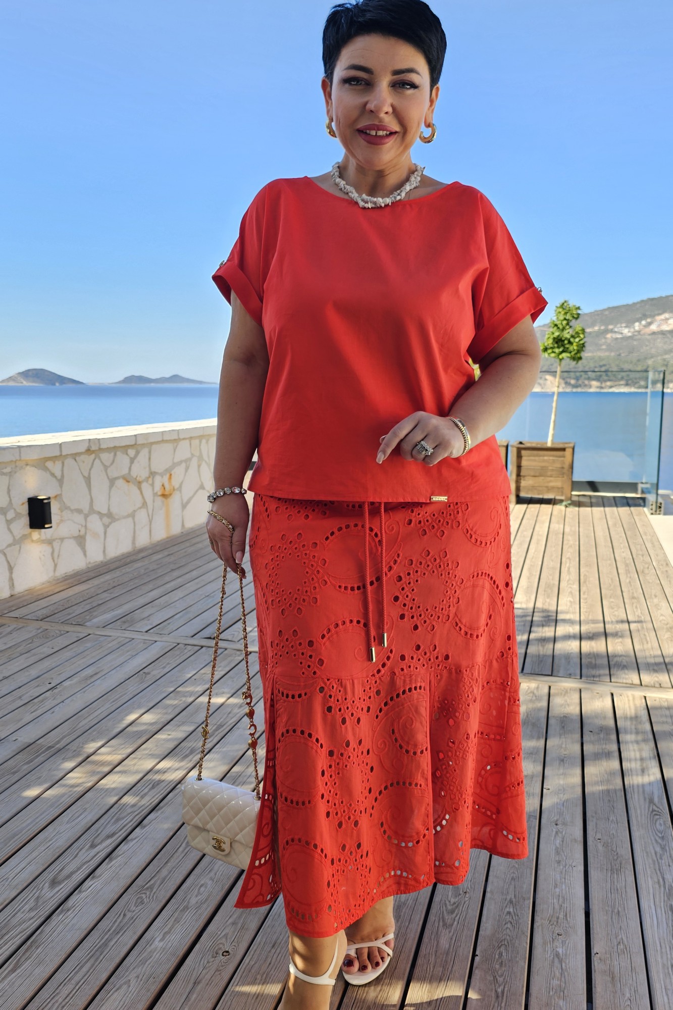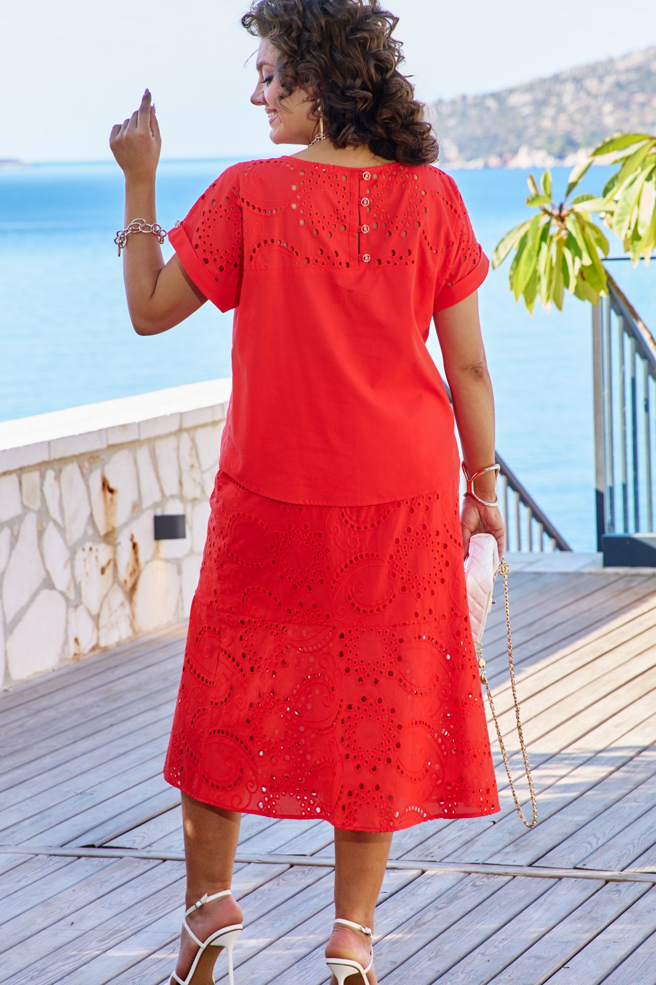 Женский летний костюм из легкой однотонной ткани в сочетании с изысканным ришелье олицетворяет утонченность и свежесть. Блузка струится по телу, придавая образу невесомость. Её простота подчеркивает изящество форм, а акцент на деталях добавляют эффекта романтичности. Этот летний комплект становится настоящим обаянием, который притягивает взгляды окружающих, придавая каждой женщине уверенность и шарм. Костюм идеально подходит как для прогулок по солнцу, так и для вечерних встреч в уютных кафе, даря своему обладателю ощущение легкости и свободы. Блуза свободного прямого силуэта, с округлой формой горловины, линия плеча спущенная с отложной манжетой по низу фиксируется декоративной пуговицей в качестве отделки. Спинка в блузе с отрезной кокеткой из отделочной ткани ришелье, на просвет, декоративной застёжкой на петли пуговицы. Низ в блузе ассиметричный с разрезами в боковых швах и пришивным декоративным элементом по низу переда. Юбка выполненная в трапециевидном силуэте, плавно ниспадает от талии, создавая ощущение легкости и свободы. Юбка из ришелье добавляет текстуру и эффектный контраст с однотонным верхом. Верхняя часть юбки с отрезной кокеткой, вставкой венгерки по задней детали, декоративными шлёвками и шнуром от боковых швов. В боковом шве юбки застёжка на потайную тесьму-молнию. По низу юбки притачной волан с разведением и декоративными разрезами по переду.
