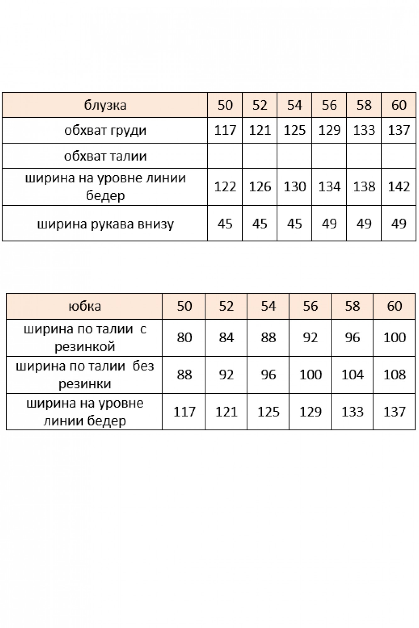 Длина блузки 59 см(р.50-54) 59,5 см (р.56-60), длина рукава(плеча) 25,5 см(р.50-54), 28,5 см (р.56-60) . Длина юбки 84 см.