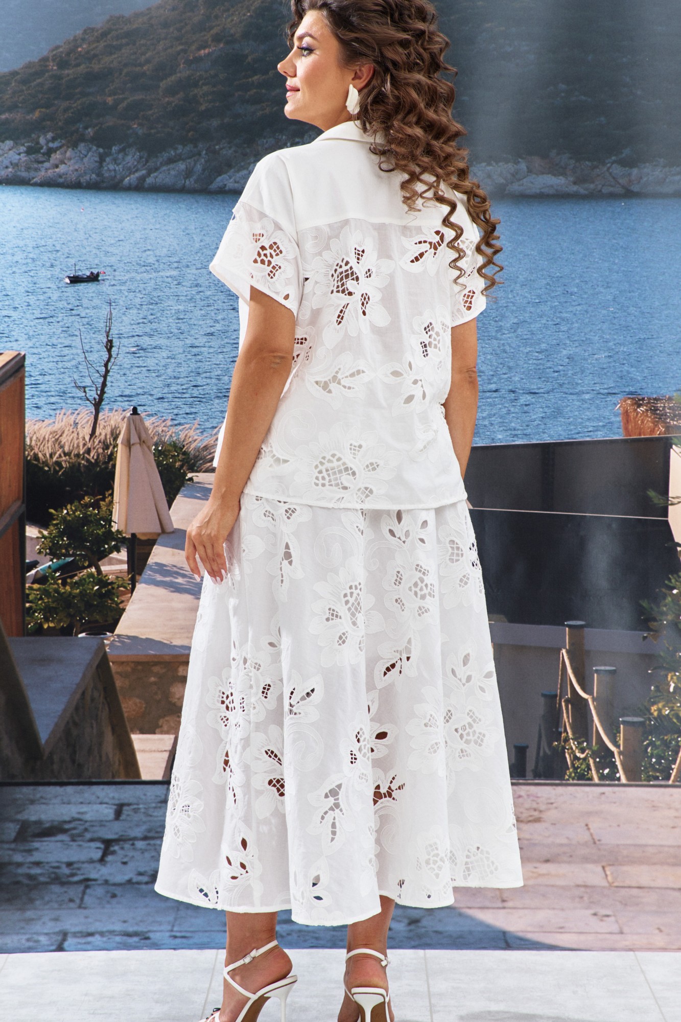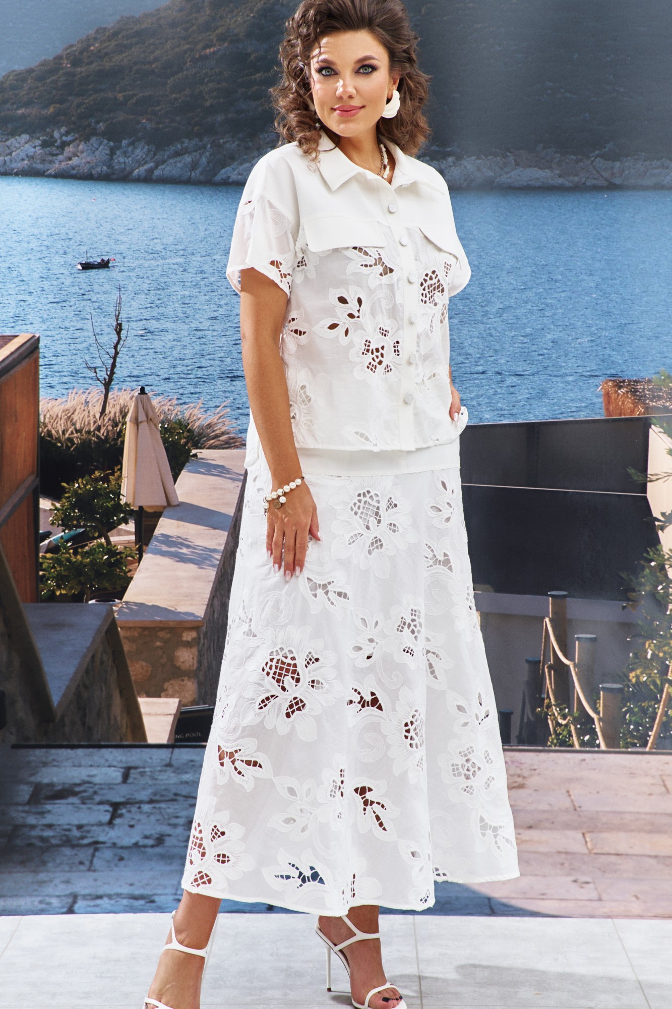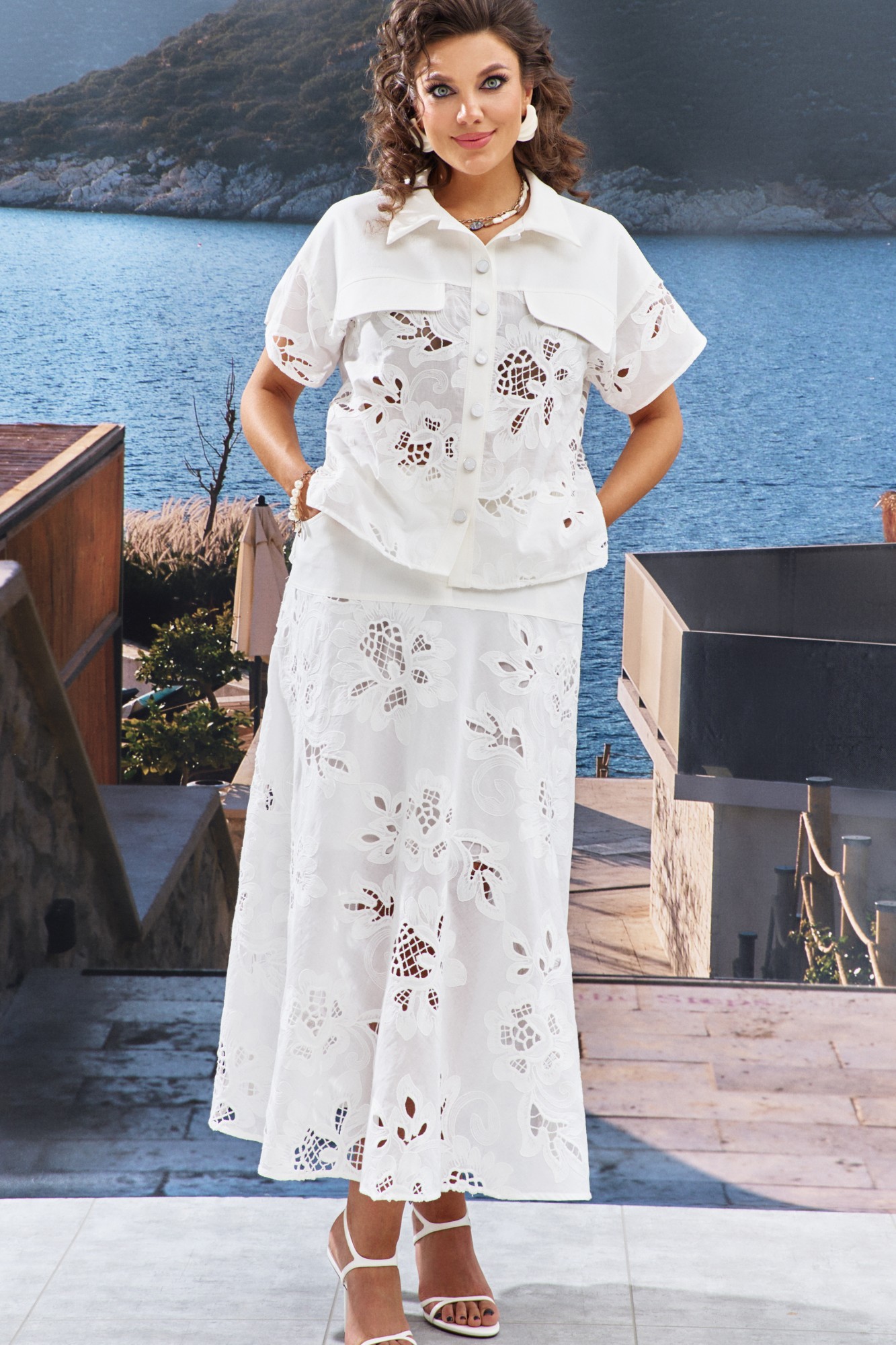 Этот летний костюм становится настоящим обаянием, который притягивает взгляды окружающих, придавая каждой женщине уверенность и шарм. Костюм идеально подходит как для прогулок по солнцу, так и для вечерних встреч в уютных кафе, даря своему обладателю ощущение легкости и свободы. Каждый шаг в этом наряде станет шагом к светлому настроению, а гармоничное сочетание ткани ришелье и отделочных деталей из однотонной джинсовой ткани привлекут восхищенные взгляды на каждого, кто имеет счастье пройти мимо. Блузка прямого силуэта с центральной застёжкой на петли-пуговицы по планке, отложным воротником рубашечного типа. По переду блузки отрезная кокетка и декоративные клапаны кармана из отделочной ткани. По спинке блузки отрезная кокетка из однотонной ткани. Линия плеча спущенная. Рукав втачной, короткий из ришелье. В боковых швах блузки разрезы. Воротник, планка, кокетка переда и спинки блузки, клапана карманов выполнены из отделочной однотонной ткани- джинса, который гармонично сочетается с основной тканью- ришелье. Юбка трапециевидного силуэта с отрезной кокеткой из однотонной ткани. По переду юбки застежка на тесьму молнию в гульфике и пуговицу в поясе. Пояс в юбке притачной со шлёвками, вставкой эластичной тесьмы-резинки в бочках от таллиевых вытачек. По переду юбки прорезные карманы. По заднему полотнищу юбки отрезная кокетка из однотонной ткани со средним швом. Юбка на подкладке. Обращаем Ваше внимание, что фурнитура может незначительно отличаться от фото.