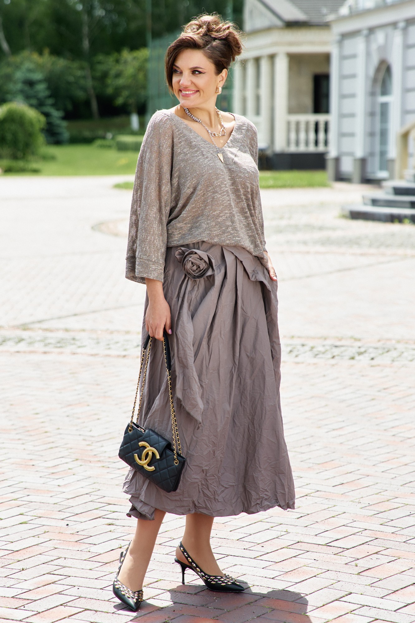 Комплект женский, состоящий из блузона и юбки. V-образный вырез мягко обрамляет шею. Тонкая вязка, чуть растягиваясь на движениях, создаёт ощущение второго слоя кожи — тёплой, невесомой, бесконечно нежной. Рукав в блузоне цельнокроеный с притачной манжетой по низу. Юбка трапециевидного силуэта. Объёмная, но не тяжеловесная, она играет с пропорциями, мягко округляясь на бёдрах и изящно расширяясь к низу. Ткань со сжатым эффектом добавляет динамики: то собирается в лёгкие складки, то разглаживается, будто дышит в такт шагам. Пояс в юбке притачной со вставкой декоративной тесьмы-резинки в бочках. По переднему полотнищу юбки от бокового шва закладывается декоративная складка с функциональным карманом. По заднему полотнищу брюк застёжка на потайную тесьму-молнию в среднем шве и пуговицу в поясе. В комплекте идёт декоративное украшение в виде съёмной броши-цветка из основной ткани.