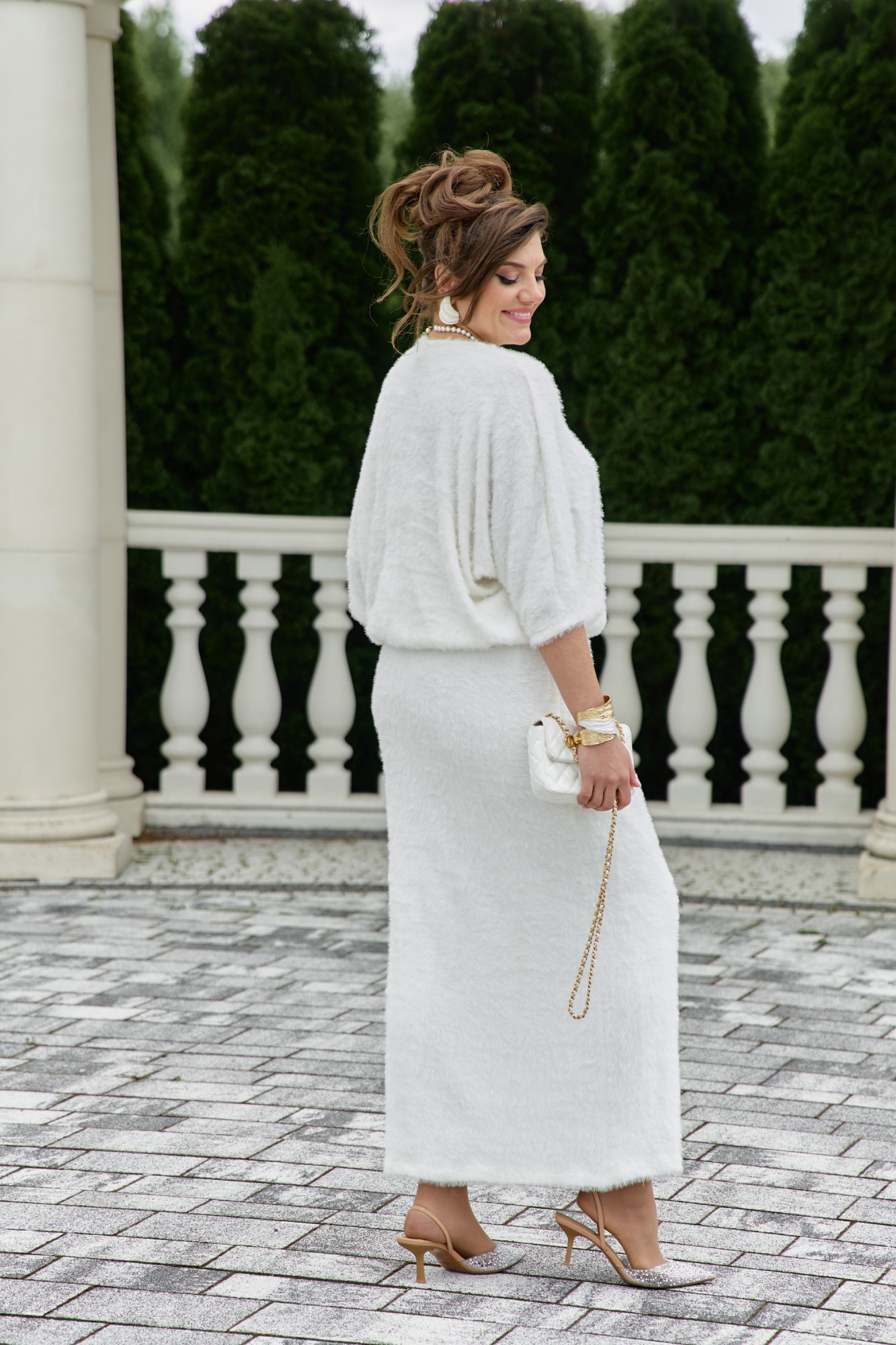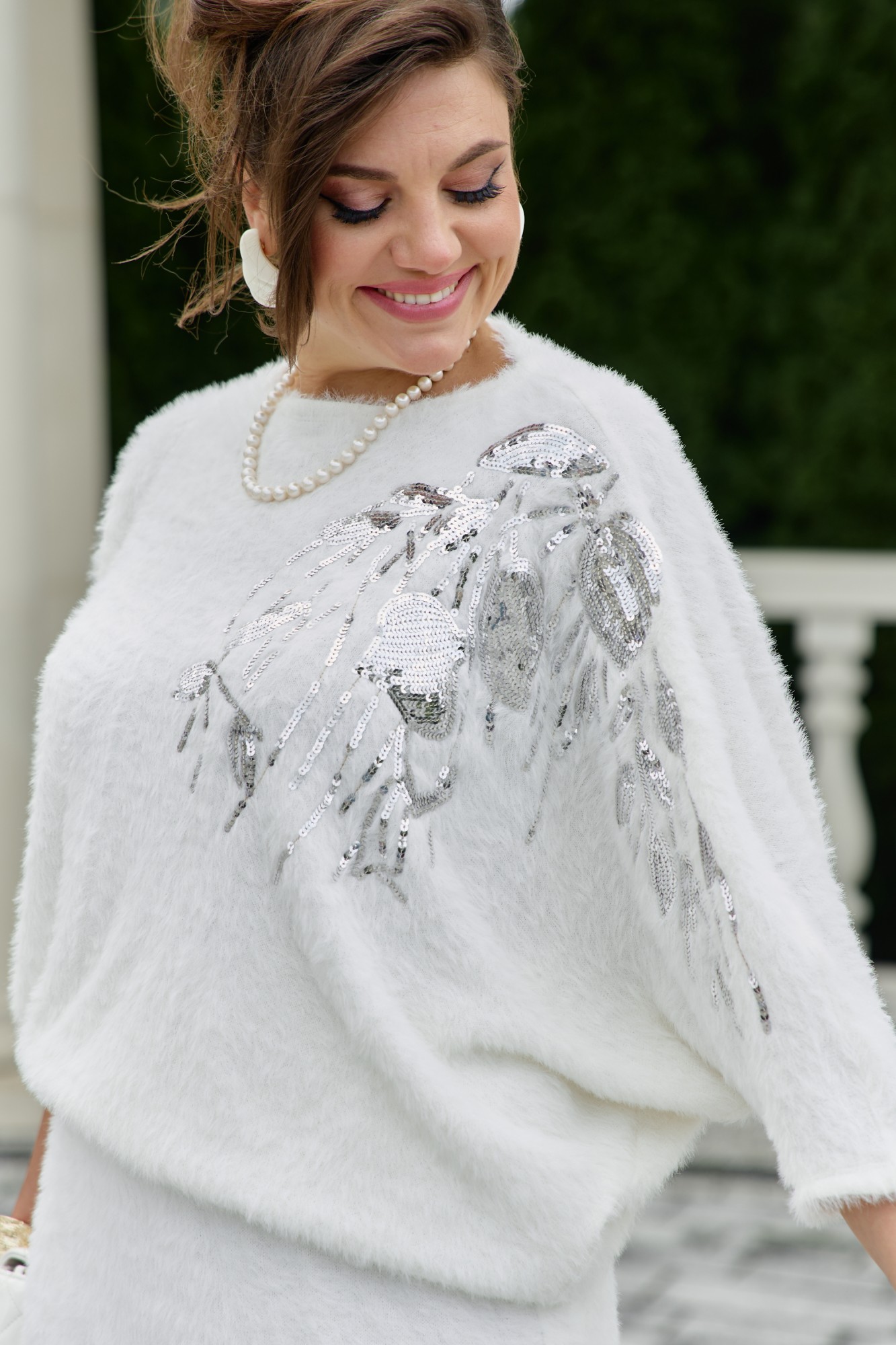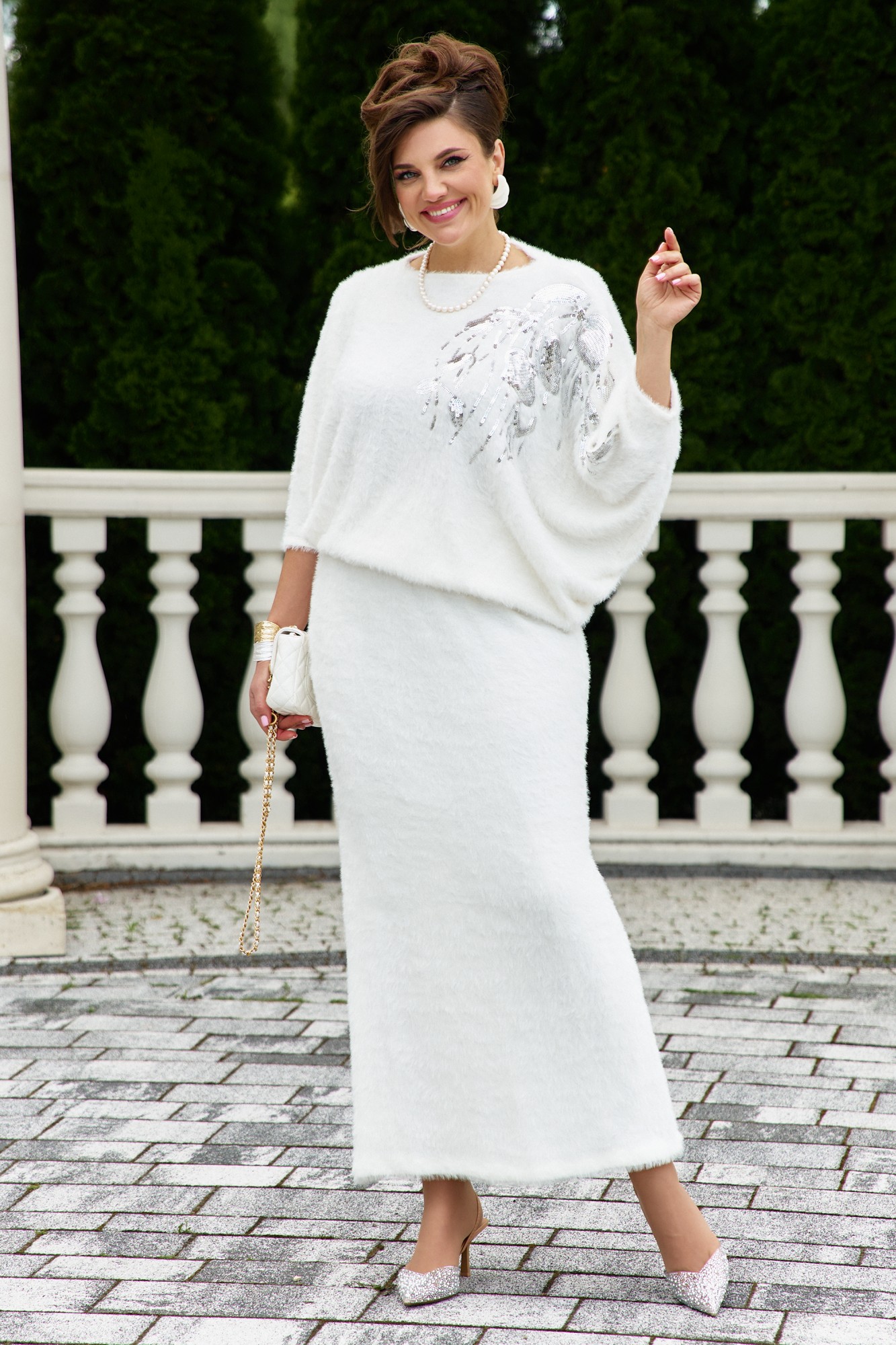 Безумно красивый и элегантный костюм мягко обволакивает фигуру мягким светом молочного оттенка, как теплое облако создает шикарный образ. Костюм состоит из блузы и юбки. Блуза свободного силуэта с округлой формой горловины. Рукав в блузе по форме «летучая мышь», длинной 7/8. Спинка со средним швом. Низ в блузе ассиметричный, на эластичной тесьме резинке. По переду блузки декоративный элемент в виде дизайнерской вышивки пайеткой, который является главным элементом костюма. Юбка длины миди, мягко очерчивая изящную линию бедер и расширяясь книзу. Пояс в юбке притачной, на эластичной тесьме резинке, которая обеспечивает максимально удобную посадку на любой тип фигуры. Юбка на подкладке.