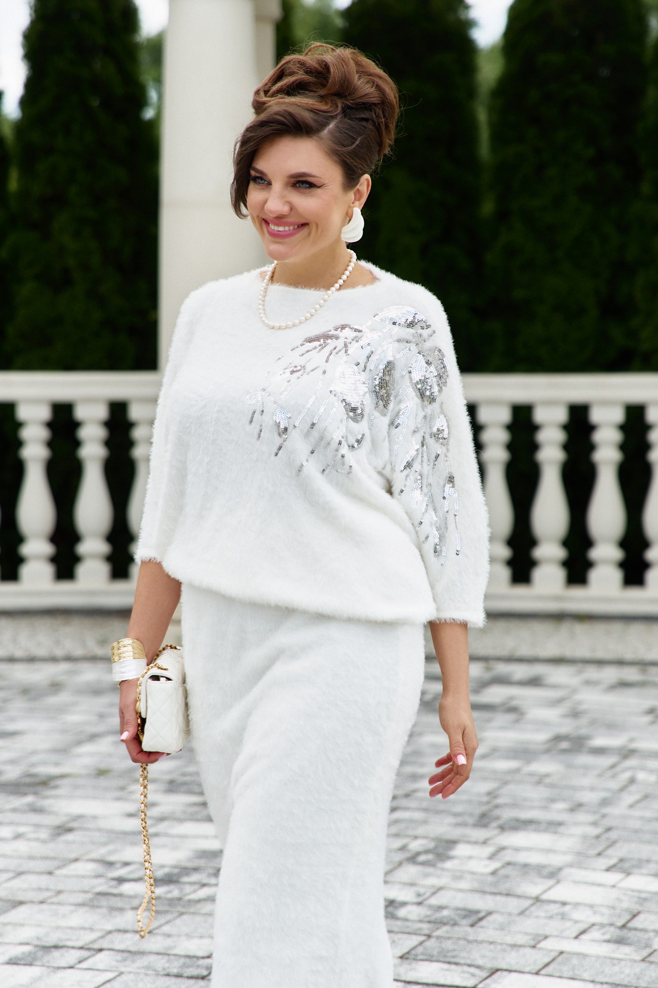Безумно красивый и элегантный костюм мягко обволакивает фигуру мягким светом молочного оттенка, как теплое облако создает шикарный образ. Костюм состоит из блузы и юбки. Блуза свободного силуэта с округлой формой горловины. Рукав в блузе по форме «летучая мышь», длинной 7/8. Спинка со средним швом. Низ в блузе ассиметричный, на эластичной тесьме резинке. По переду блузки декоративный элемент в виде дизайнерской вышивки пайеткой, который является главным элементом костюма. Юбка длины миди, мягко очерчивая изящную линию бедер и расширяясь книзу. Пояс в юбке притачной, на эластичной тесьме резинке, которая обеспечивает максимально удобную посадку на любой тип фигуры. Юбка на подкладке.
