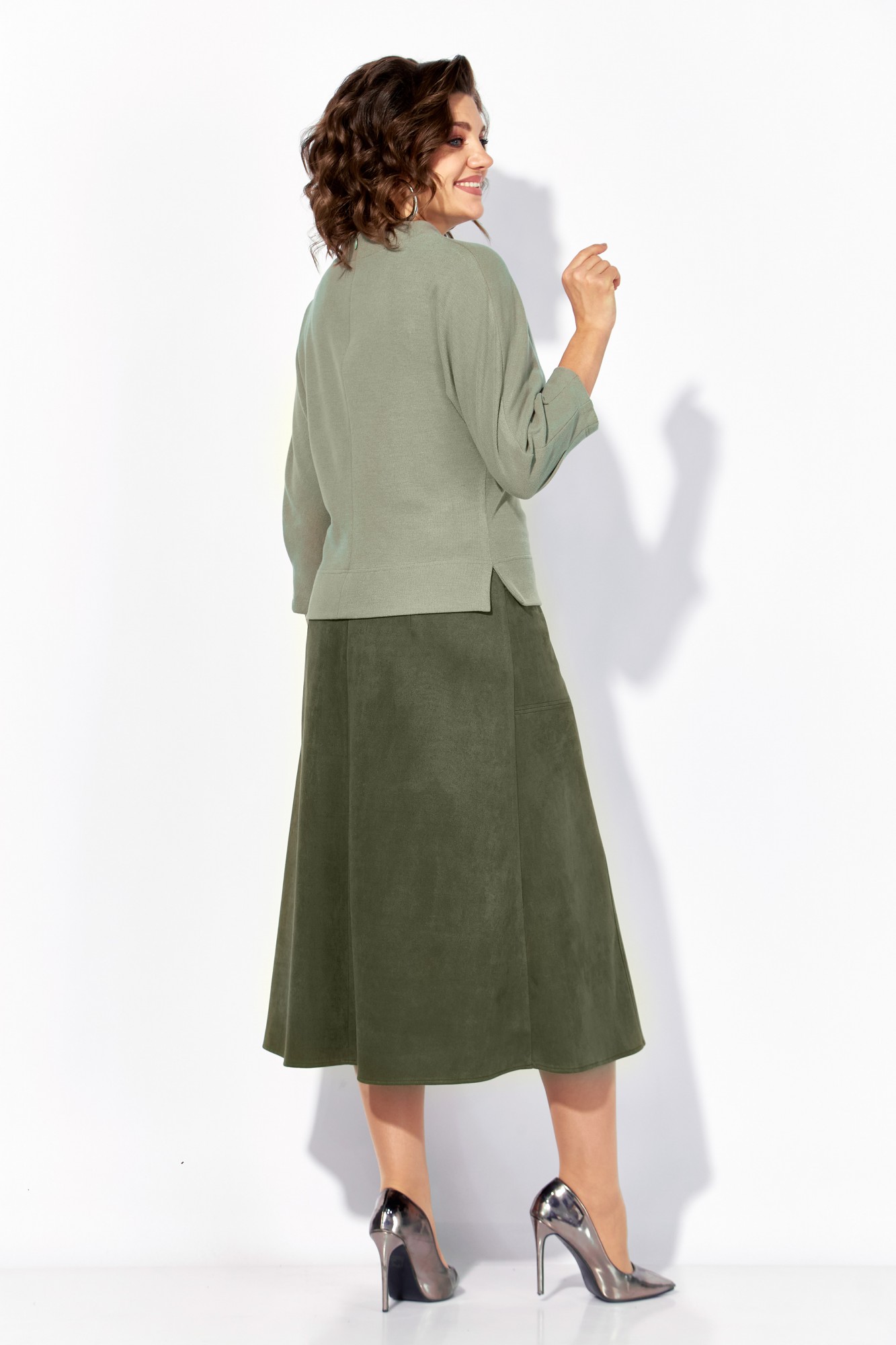 Эффектный и стильный комплект, состоящий из блузки и юбки. Блузка свободного силуэта, с цельнокроеным рукавом длиной ¾-ти, выполнена из мягкого трикотажа с бархатным эффектом. По низу рукава заложены небольшие складки. Модель на мягкой стойке-горловине с застежкой на потайную молнию по спинке. Лиф украшает ассиметричная печать-накат в виде цветка с бусинами. Широкая подгибка с боковыми разрезами обеспечивает идеальную посадку. Талию можно подчеркнуть съёмным поясом с металлической пряжкой. Юбка в комплекте выполнена из искусственной замши – спандекса, на подкладке. Перед с продольными рельефами на расклешение и боковыми карманами. Пояс в юбке притачной, в боковых участках вставлена резинка для комфортного прилегания. Застежка – юбочная тесьма-молния в среднем шве. Создайте свой уникальный образ. Не упустите возможность стать центром внимания на любом празднике с нашим теплым комплектом! Заказывайте готовый наряд прямо сейчас и наслаждайтесь комфортом и стилем в любое время года.