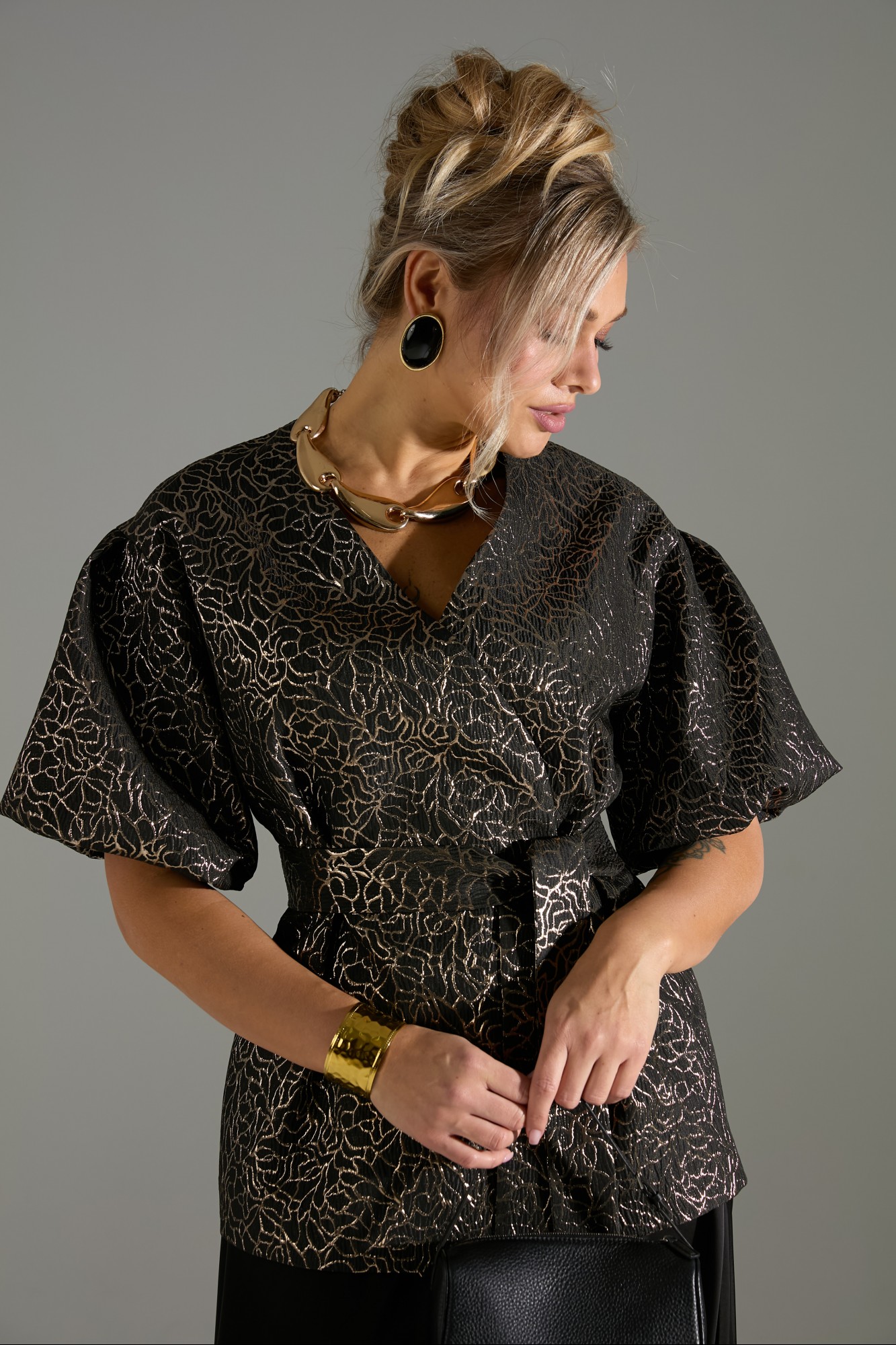 Комплект 2-ка, состоящий из жакета и юбки. Легкий жакет на подкладке с объёмными рукавами. Перед на запах с застежкой на кнопки, под пояс по талии.