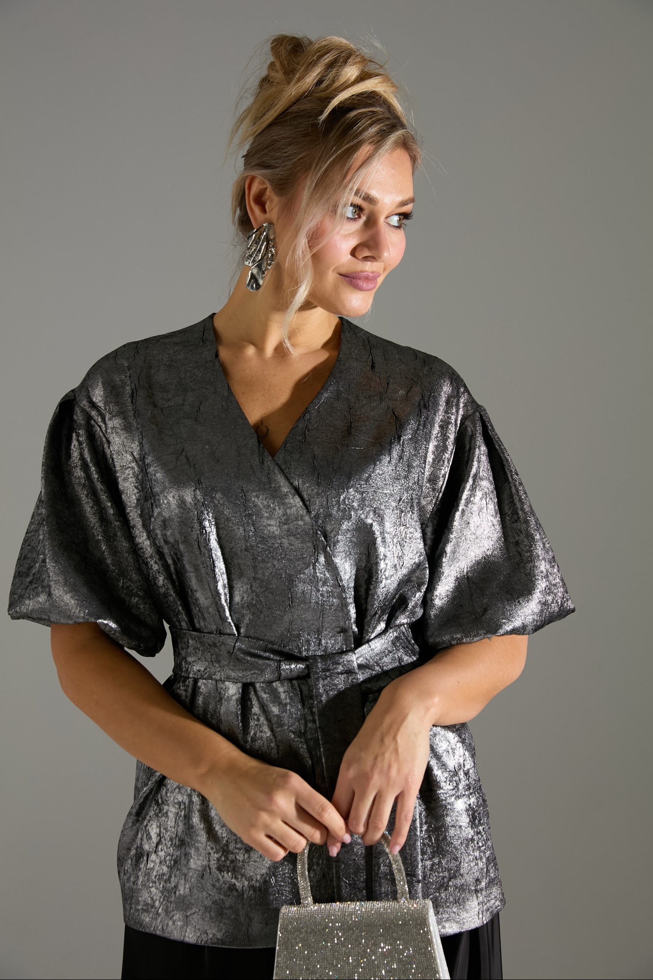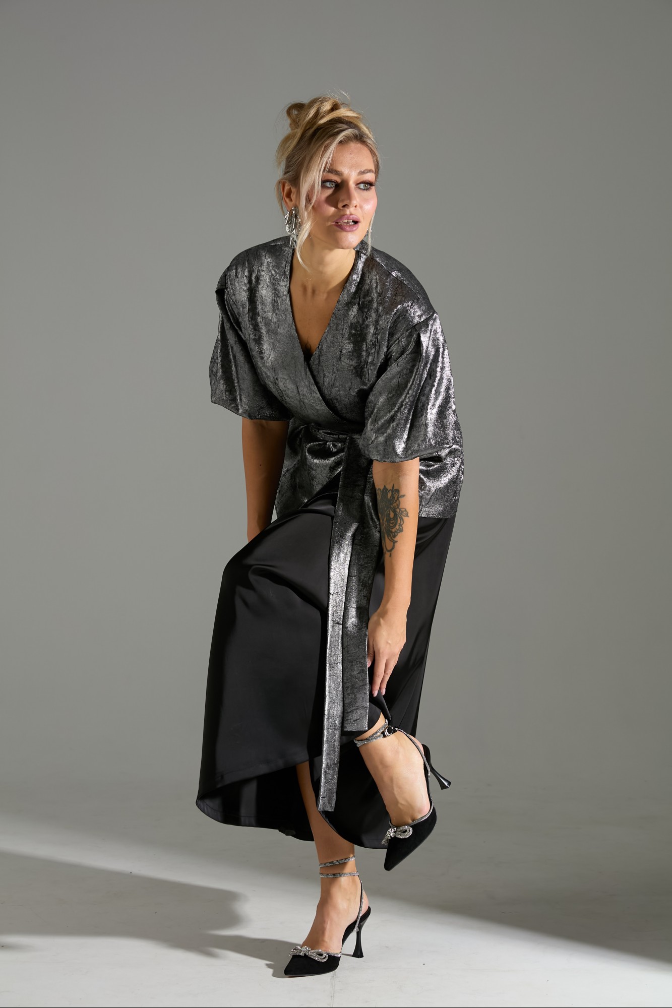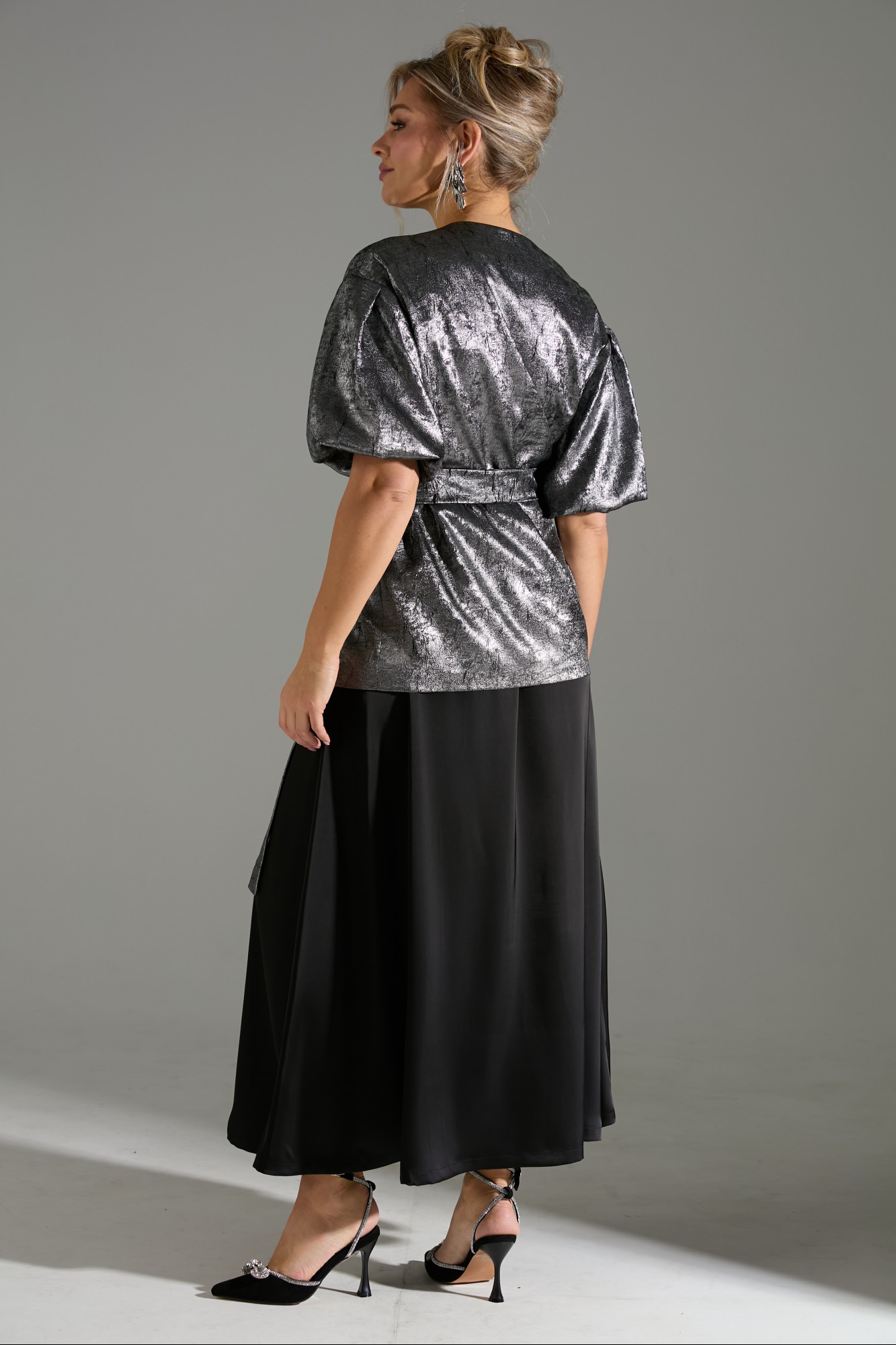 Комплект 2-ка, состоящий из жакета и юбки. Легкий жакет на подкладке с объёмными рукавами. Перед на запах с застежкой на кнопки, под пояс по талии.
