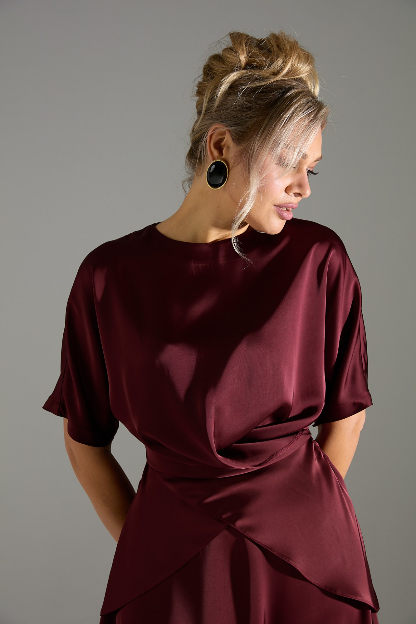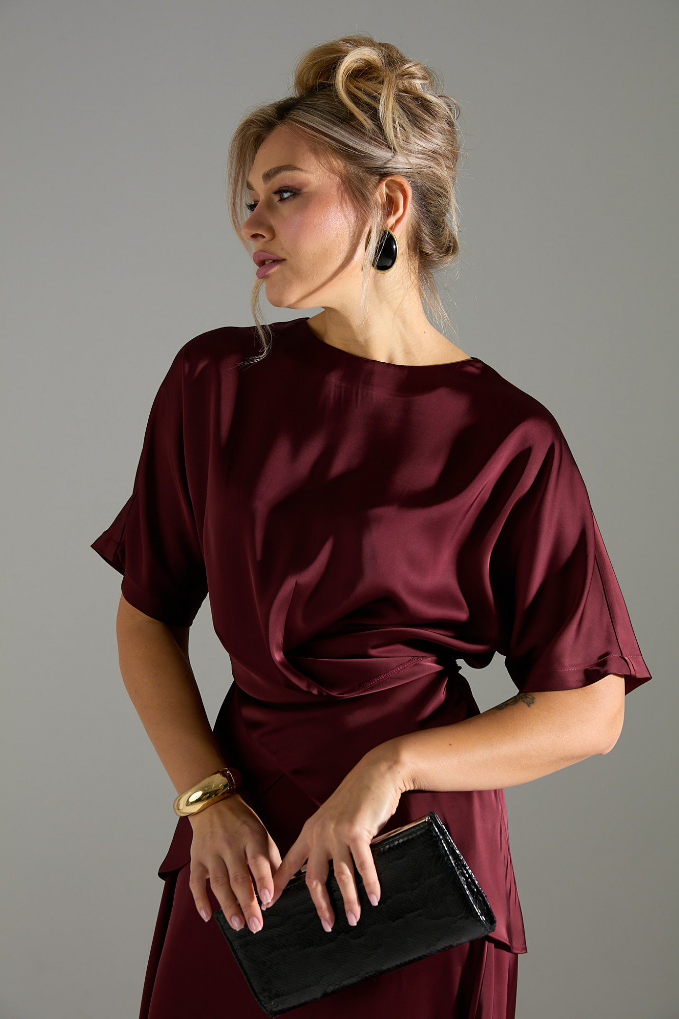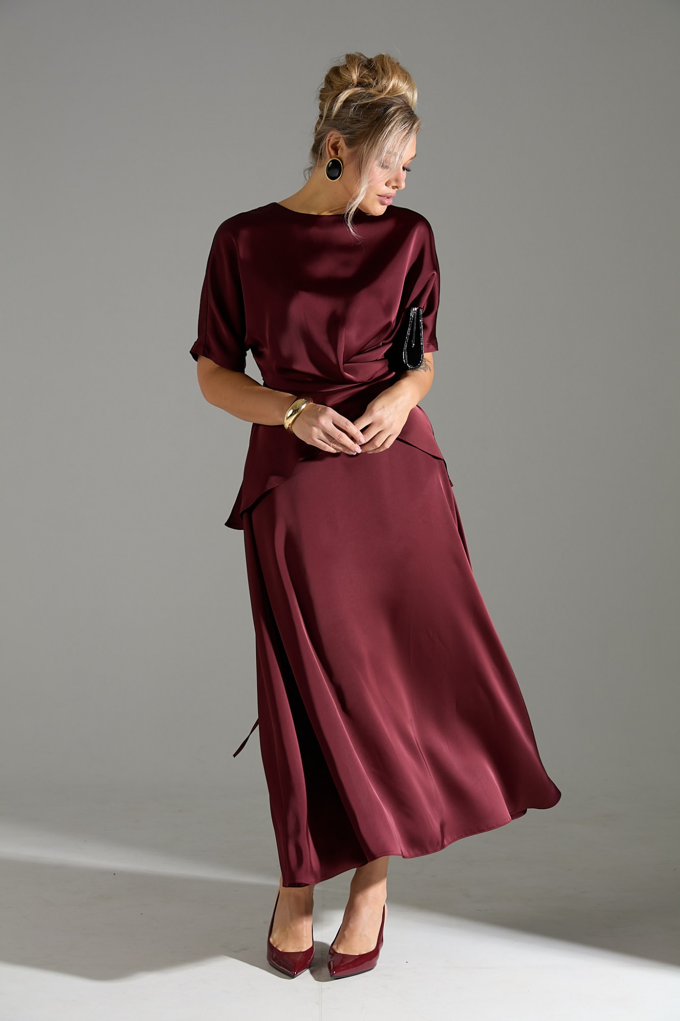 Костюм 2ка из лёгкой струящейся ткани с атласным благородным блеском, состоящий из блузки и юбки. Блузка свободного объёма, по переду имитация застежки на запах. В комплекте шнур из основной ткани, которым можно приталить блузу, обвязав по кругу, или продеть через боковые швы и завязать по спинке. Юбка широкого объёма.