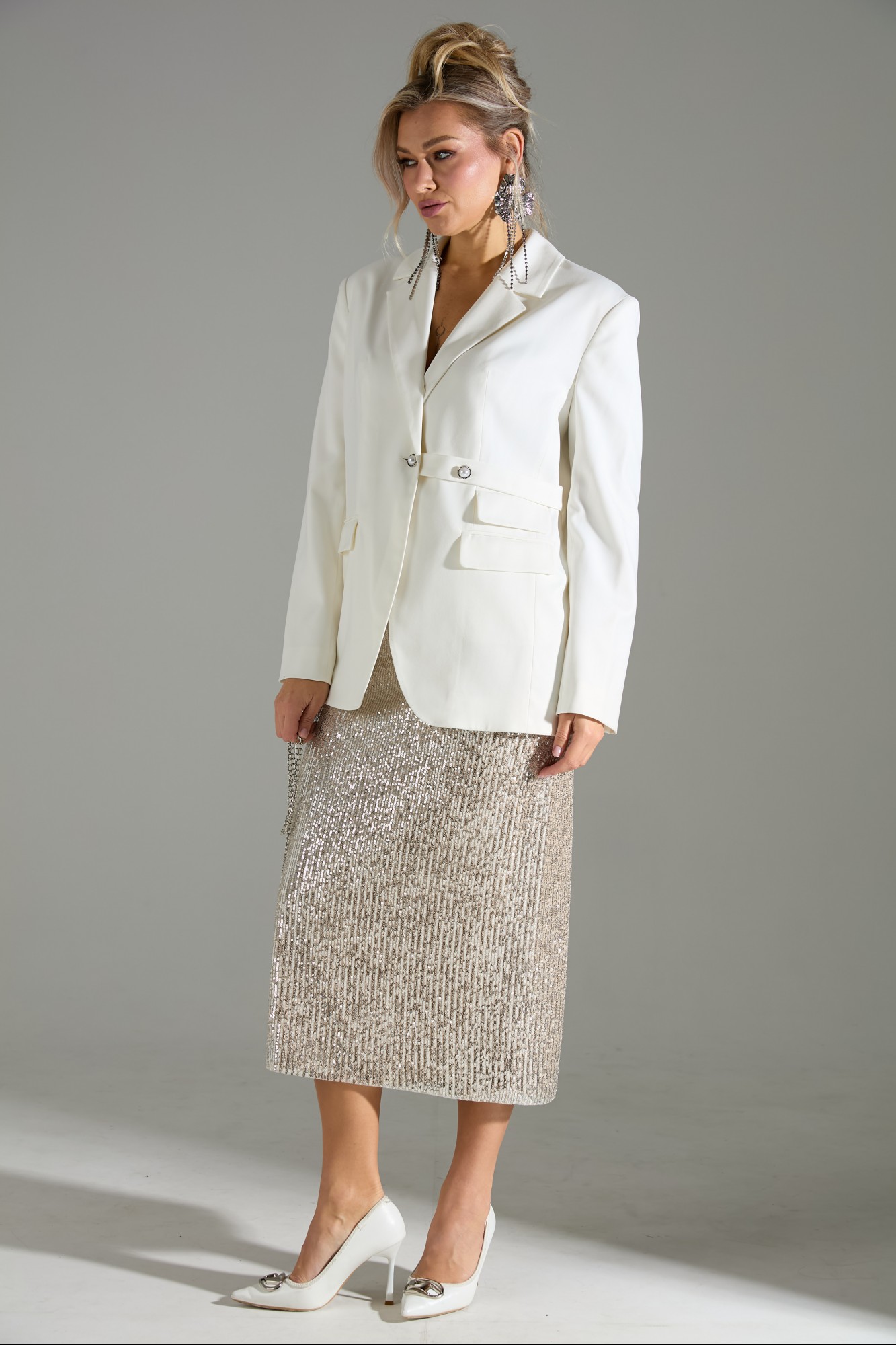 Комплект 2-ка, состоящий из жакета и юбки. Жакет однобортный объёмного силуэта с расширенным плечевым поясом. Застёжка на одну пуговицу. Из бокового шва выходит декоративная пата. По полочки распложены три прорезных кармана с клапанами, два из которых функциональные. Юбка- карандаш длиной ниже колена прямого силуэта. Пояс юбки и подкладка выполнены из эластичного трикотажа. Верхний слой юбки из лёгкой ткани расшитой пайетками. Застёжка на потайную молнию в среднем шве по спинке, разрез расположен внизу среднего шва.