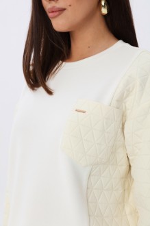 Трикотажный костюм 2ка , состоящий из джемпера и юбки. Джемпер прямого кроя свободного силуэта. Низ джемпера по переду укорочен и дополнен разрезами. Рукава джемпера, боковые вставки и карман на груди выполнены из мягкой стёганой отделочной ткани. Юбка-карандаш длиной ниже колена. По переду расположены карманы из стёганой ткани.