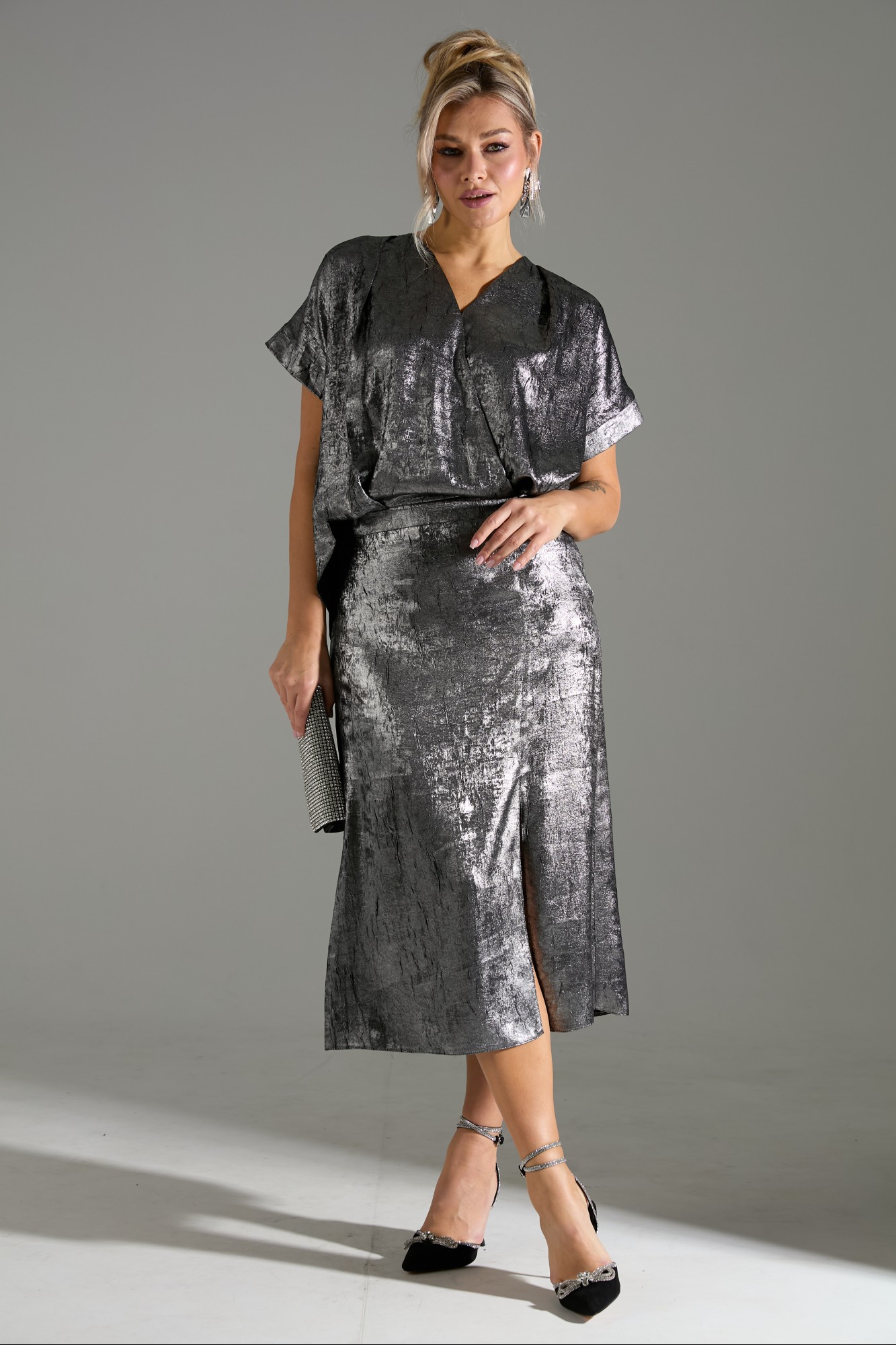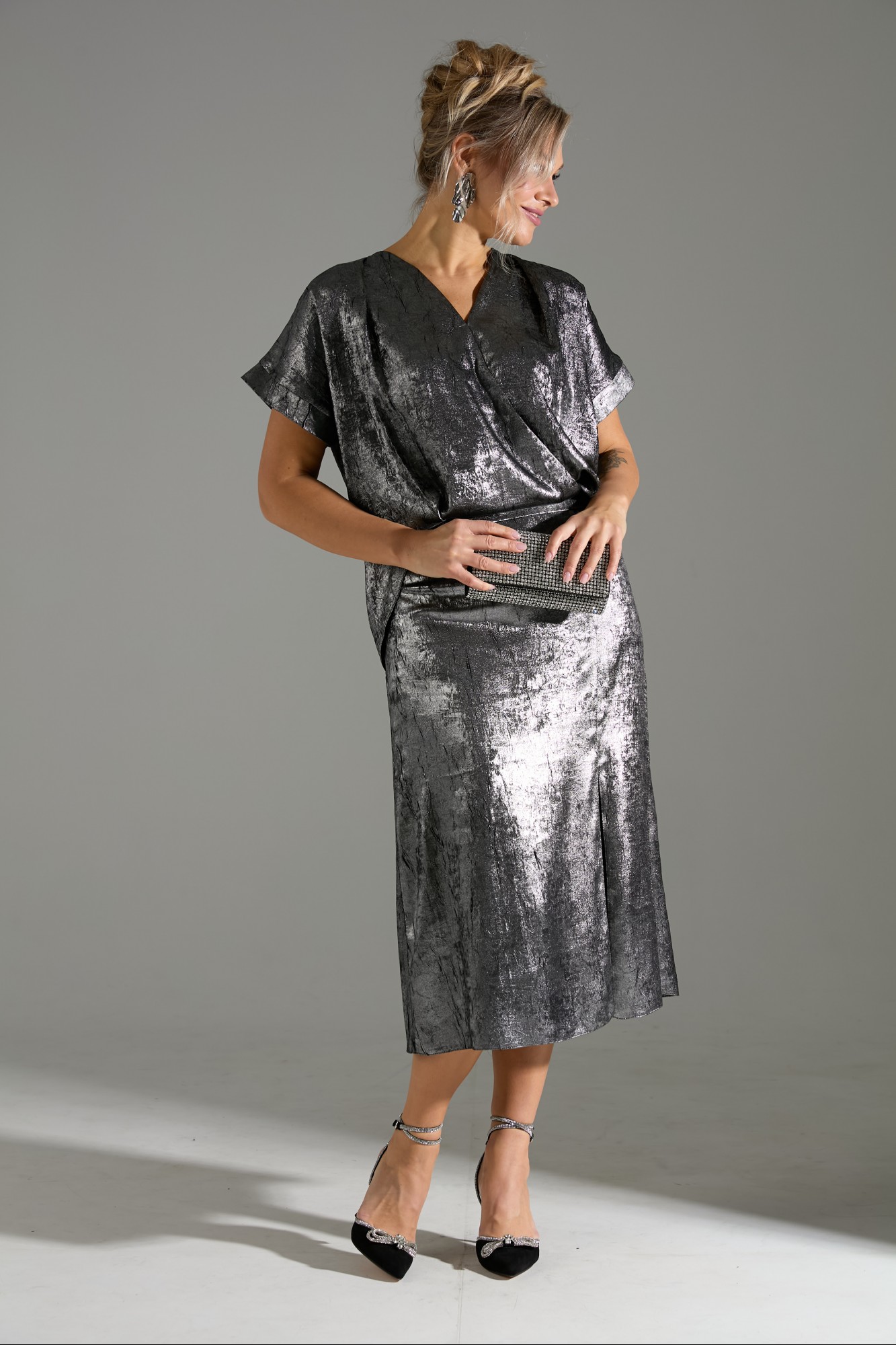 Комплект 2ка, состоящий из блузки и юбки. Блузка свободного силуэта с короткими рукавами. Горловина V-образная. Низ блузки разноуровневый: спереди короче, сзади длиннее. Блузка по талии может соединяться с юбкой с помощью молнии , создавая имитацию платья. Юбка слегка расширена к низу, длиной ниже колена. По переду юбки разрез на левую сторону. Пояс юбки по переду на эластичной тесьме, застёжка на потайную молнию.