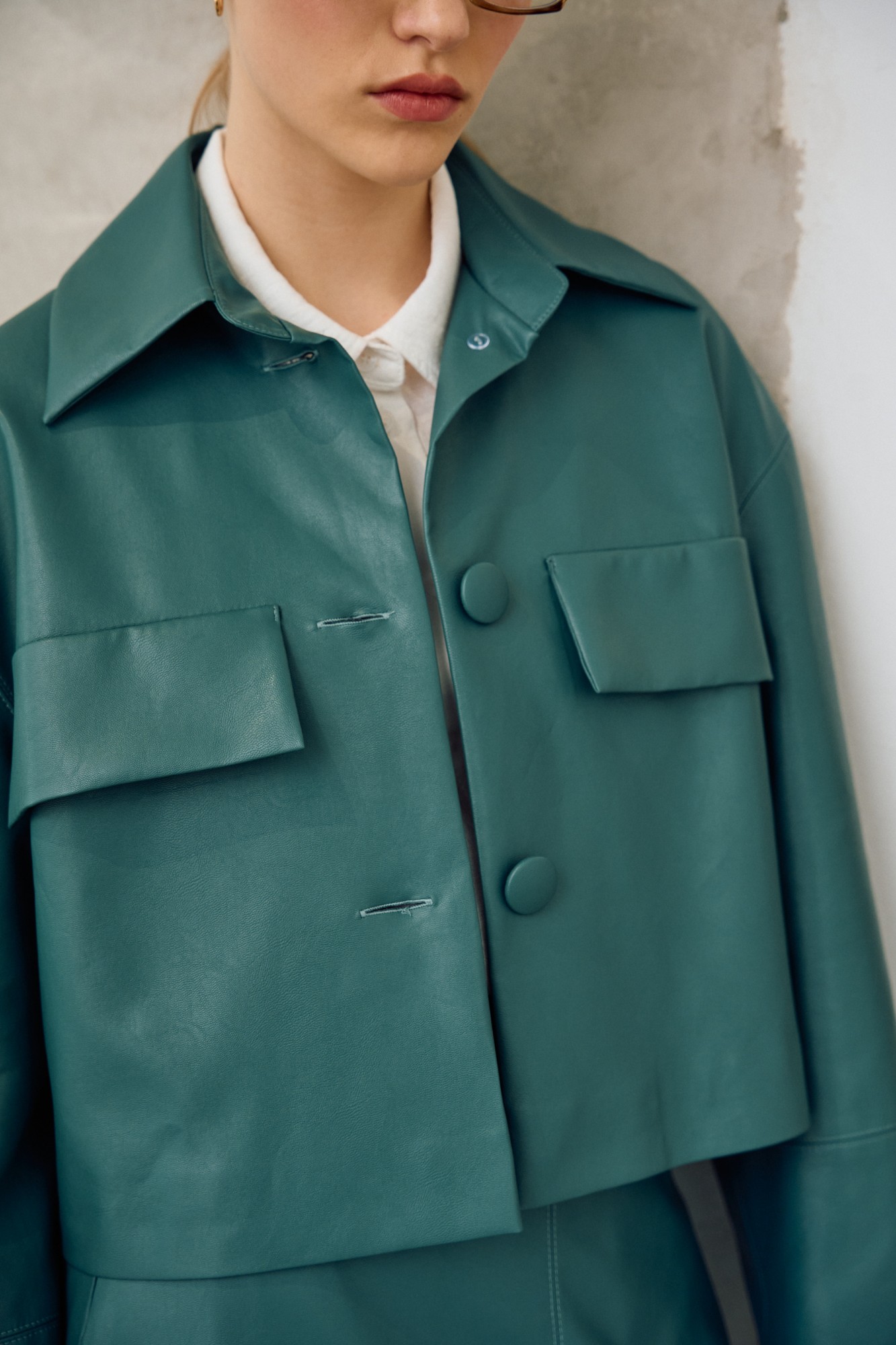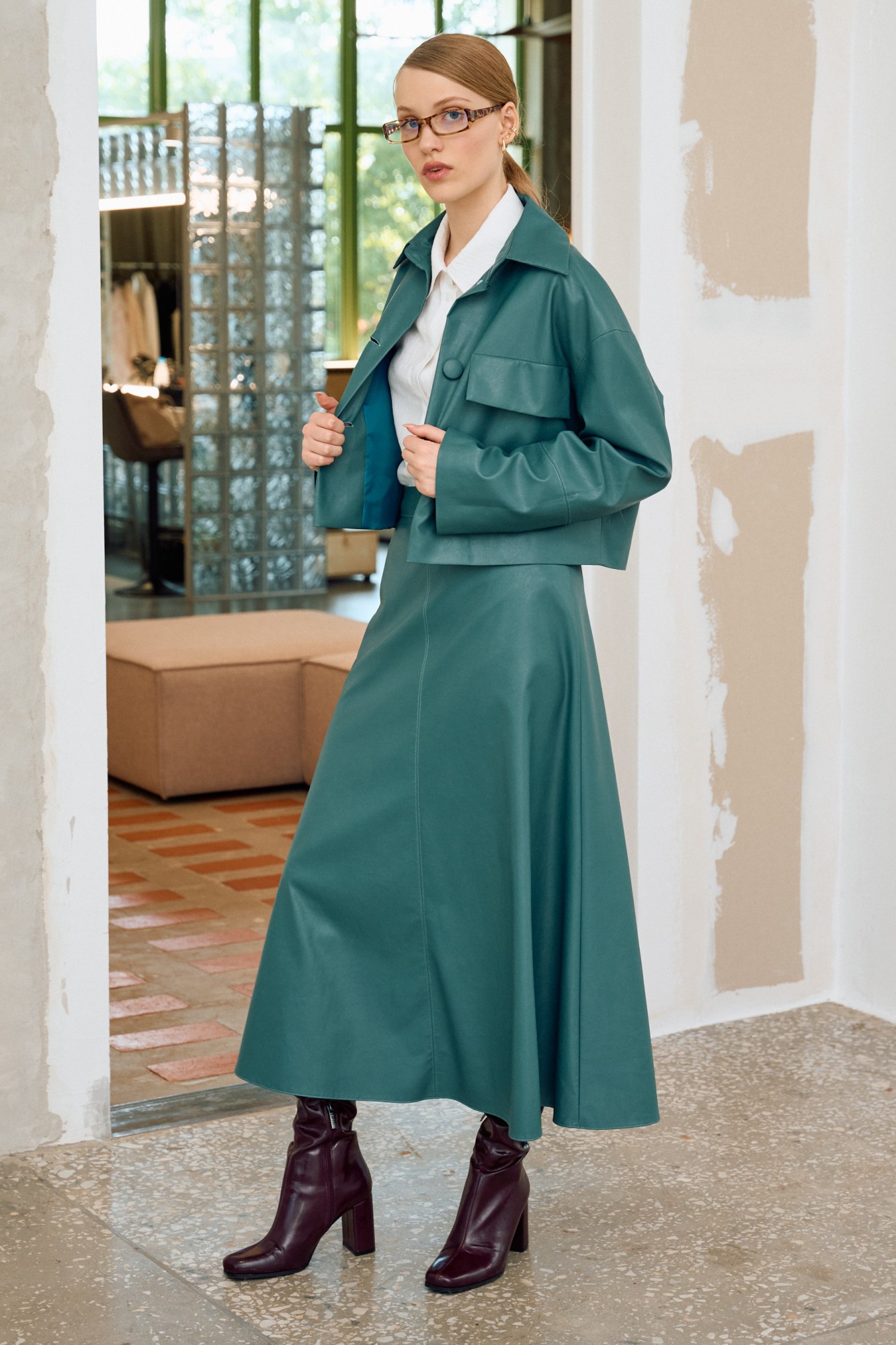 Комплект состоит из жакета и юбки, и выполнен из экокожи. Жакет укороченный, прямого кроя, на подкладке. Линия плеча спущена, рукав длинный, ниже уровня локтя подрез. Воротник рубашечного кроя, застежка на петли и пуговицы. Выше уровня груди отлетные клапаны. По спинке кокетка. Юбка А-силуэта на притачном поясе, на подкладке. По передней части юбки средний шов, по задней части юбки средний шов, переходящий в застёжку на потайную молнию.