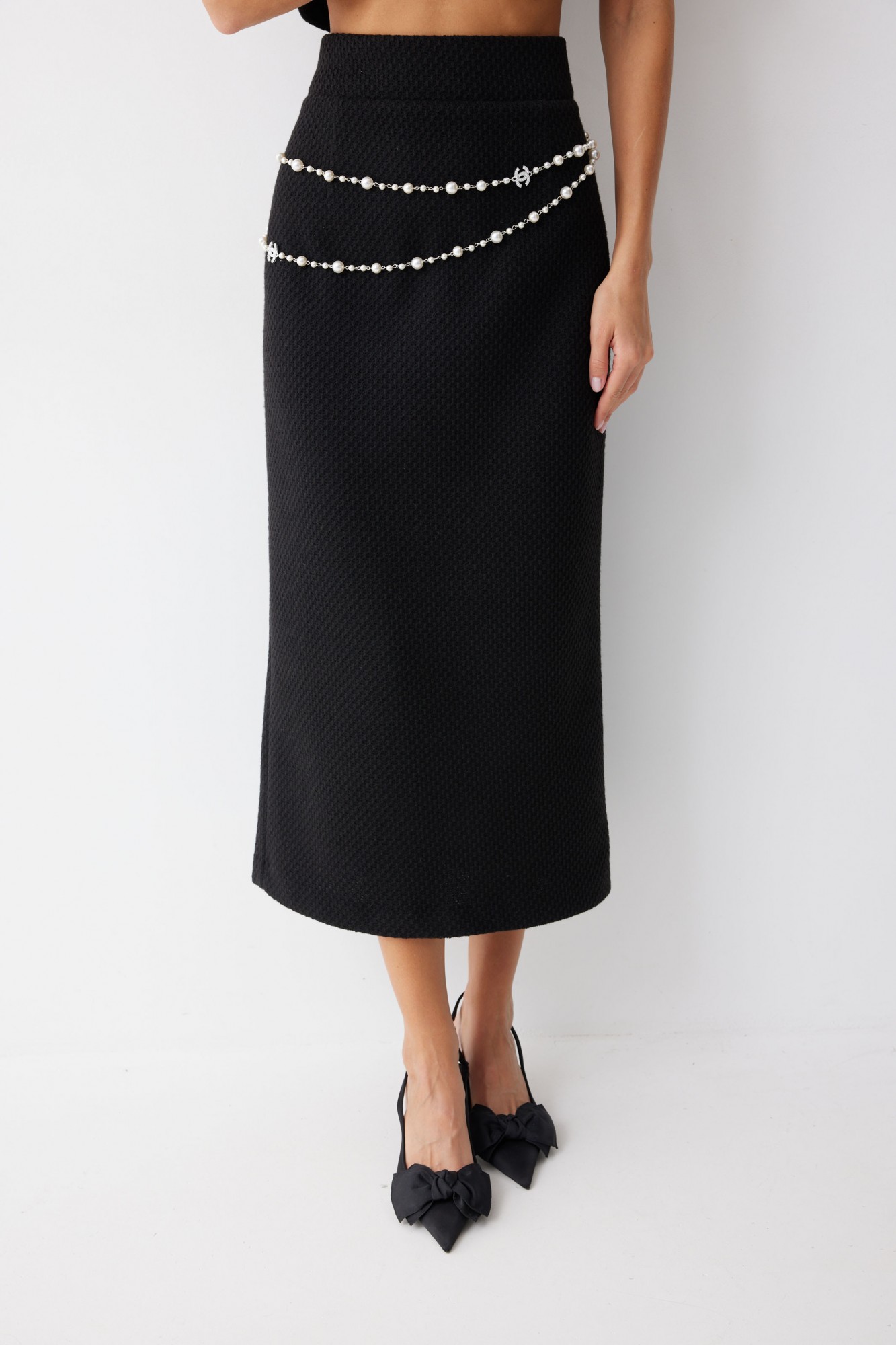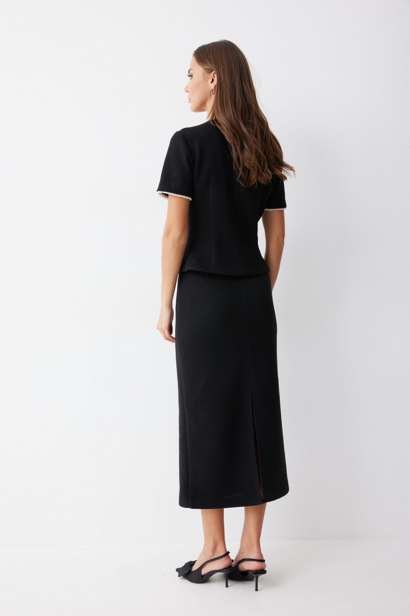 Жакет полуприлегающего силуэта из трикотажного полотна. Горловина округлая по центру застежка на петли и пуговицы. Рукав втачной короткий. По переду таллиевые вытачки и накладные карманы, на спинке – таллиевые вытачки. Жакет на подкладке. Обращаем ваше внимание, что фурнитура может отличаться от фото. Юбка прямого силуэта из трикотажного полотна. По верху юбки притачной пояс. На спинке юбки в центральном шве застежка на потайную молнию, по низу разрез. Юбка на подкладке.