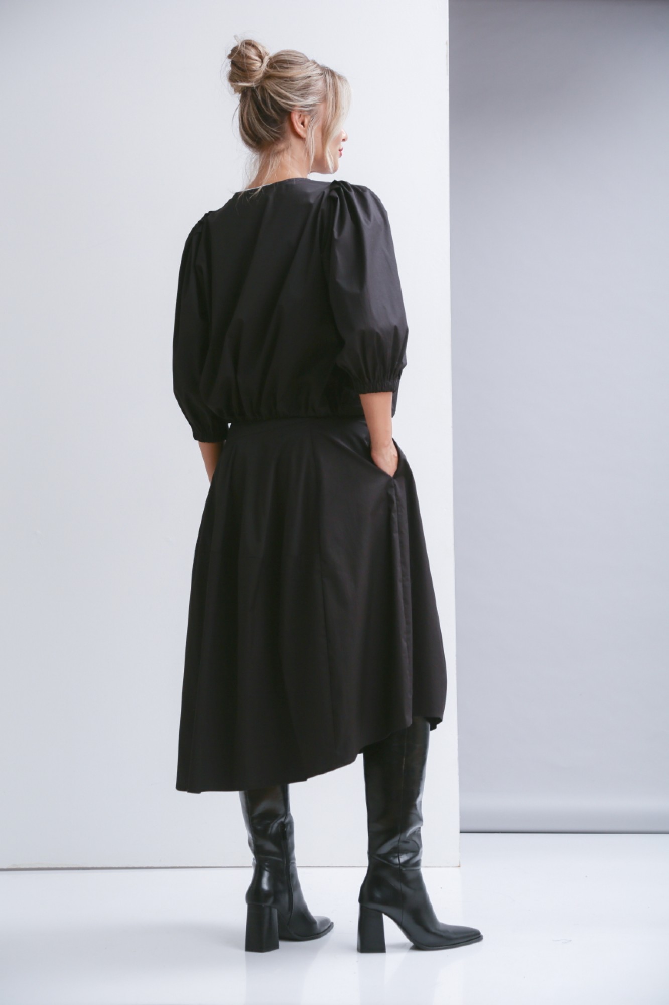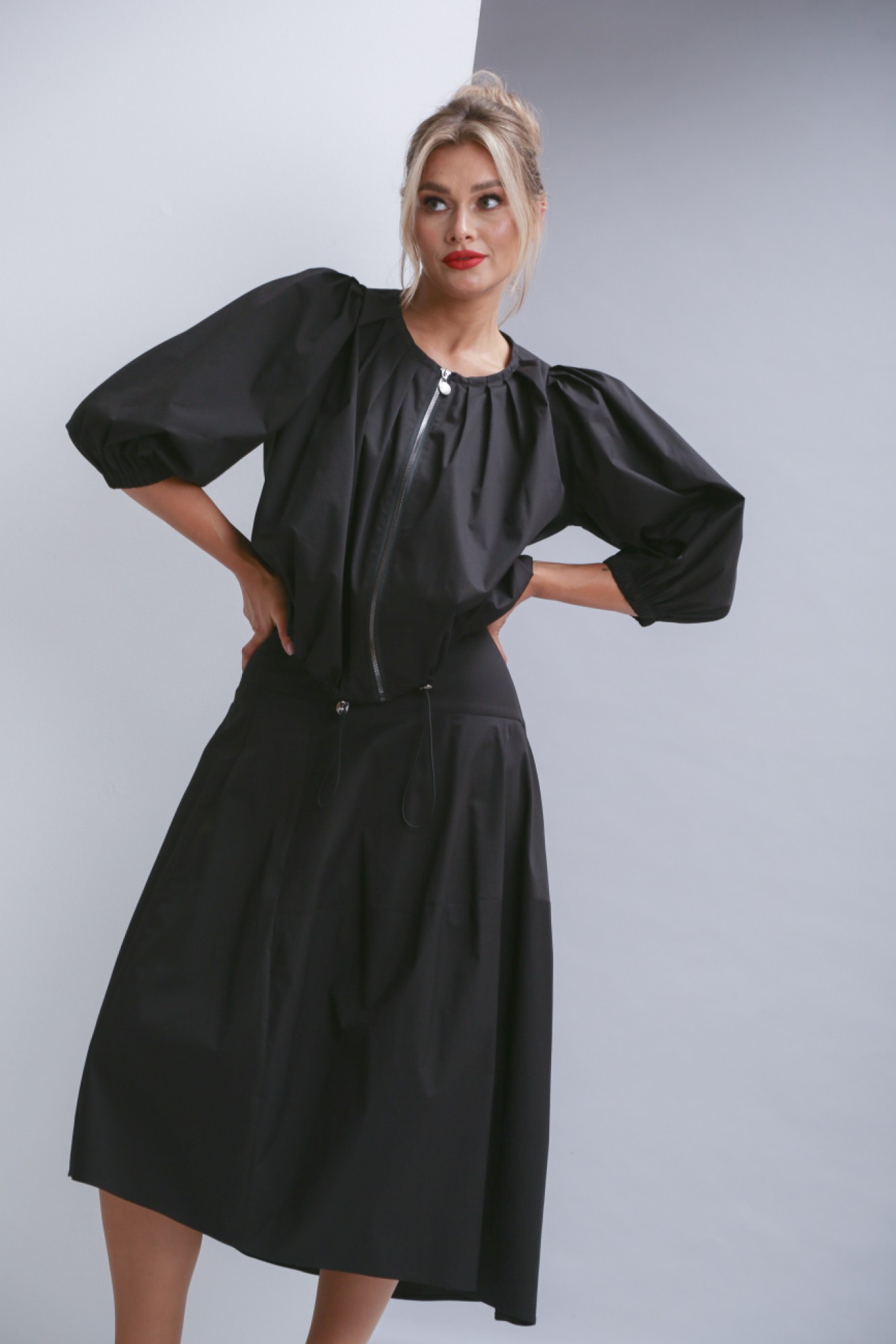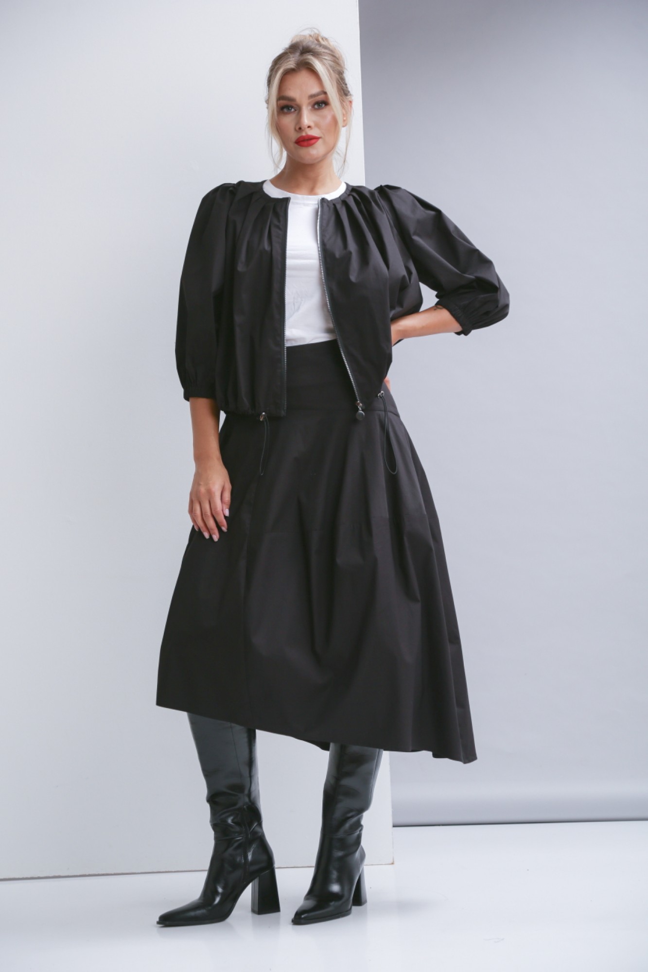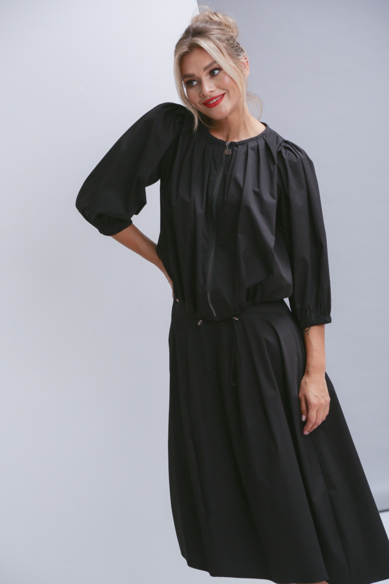 Комплект двухпредметный, состоит из блузы и юбки. Блуза свободного кроя без воротника и с застежкой на декоративную тесьму-молнию. Рукав втачной со складками в верхней части и сборкой по низу. В боковых швах карманы. Юбка - баллон с декоративными подрезами по переду и спинке. В верхней части ассиметричная кокетка с застежкой на потайную молнию в боковом шве. Юбка на подкладке.