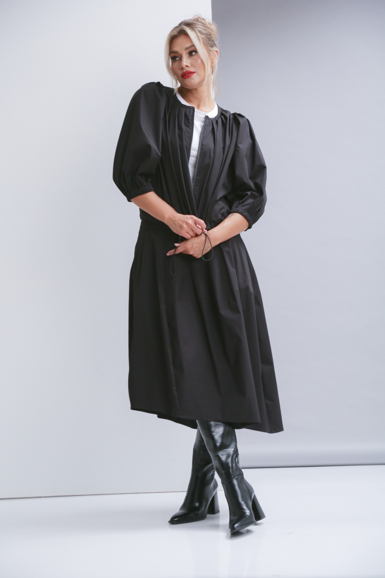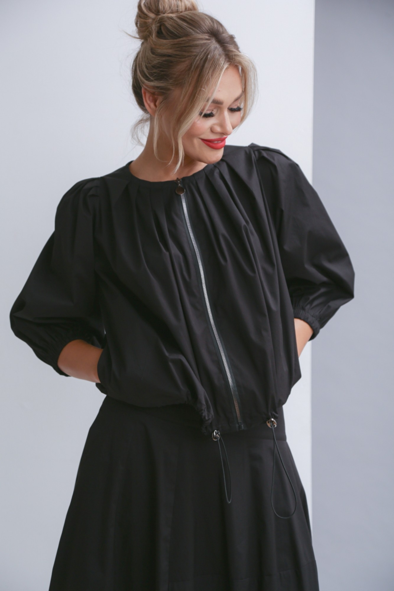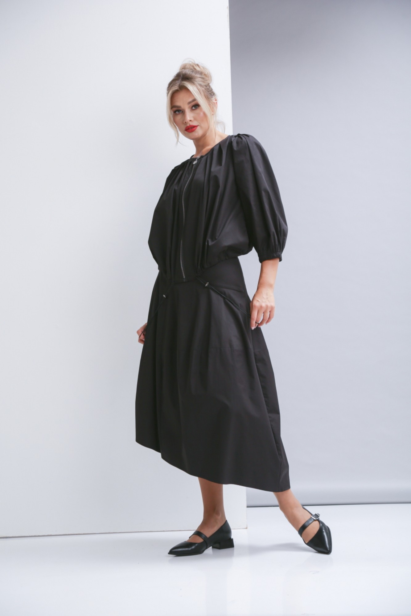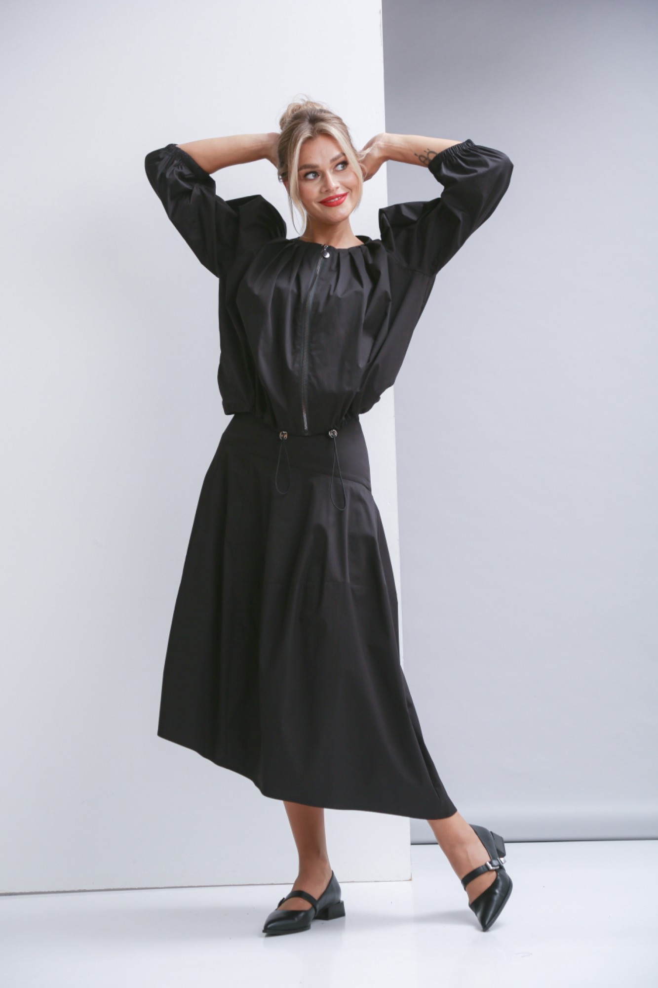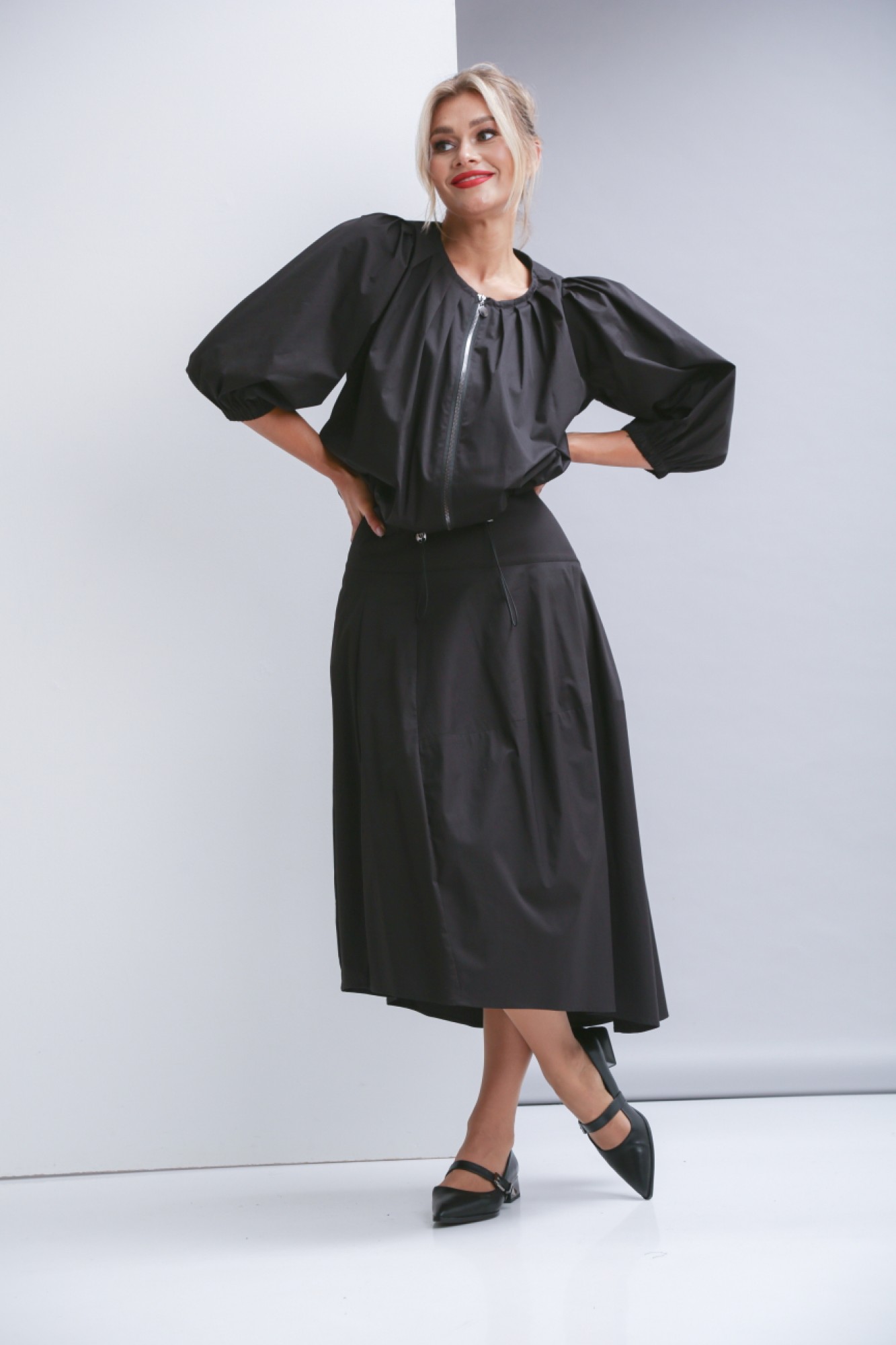 Комплект двухпредметный, состоит из блузы и юбки. Блуза свободного кроя без воротника и с застежкой на декоративную тесьму-молнию. Рукав втачной со складками в верхней части и сборкой по низу. В боковых швах карманы. Юбка - баллон с декоративными подрезами по переду и спинке. В верхней части ассиметричная кокетка с застежкой на потайную молнию в боковом шве. Юбка на подкладке.