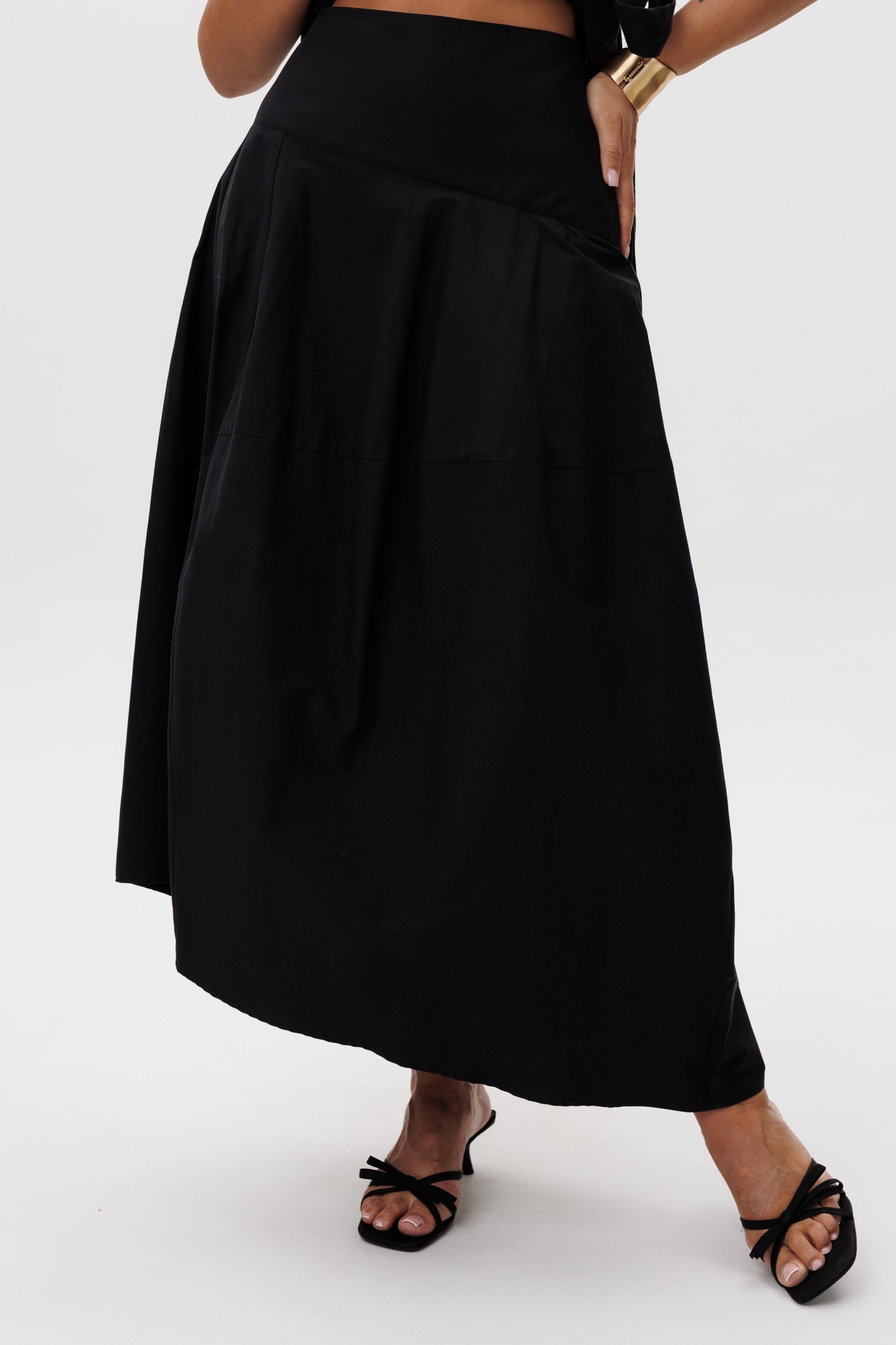 Комплект двухпредметный состоит из жилеты и юбки. Жилет приталенного силуэта с запахом по переду. Юбка-баллон на отрезной кокетке с застежкой на потайную молнию в боковом шве.