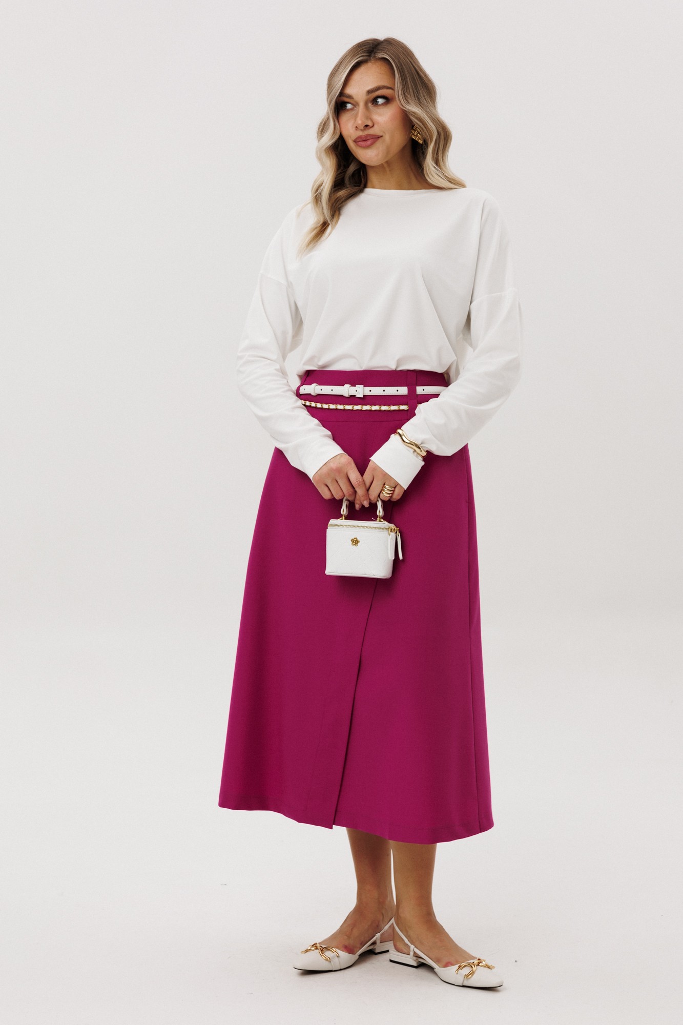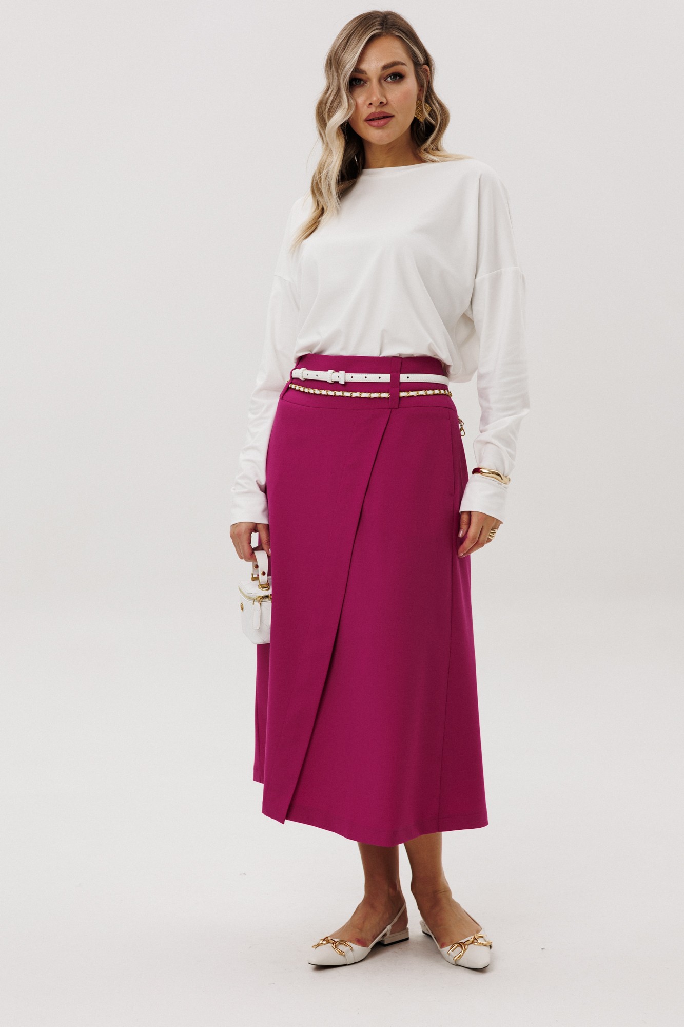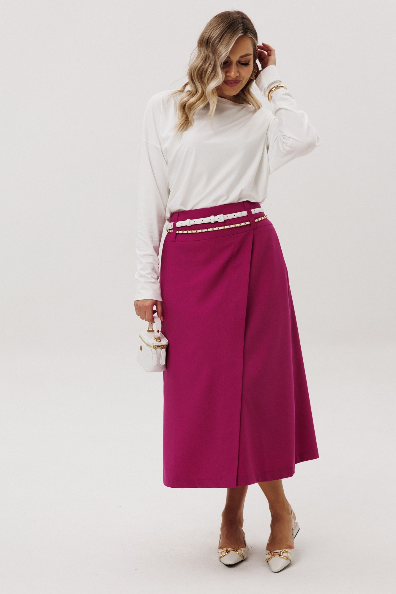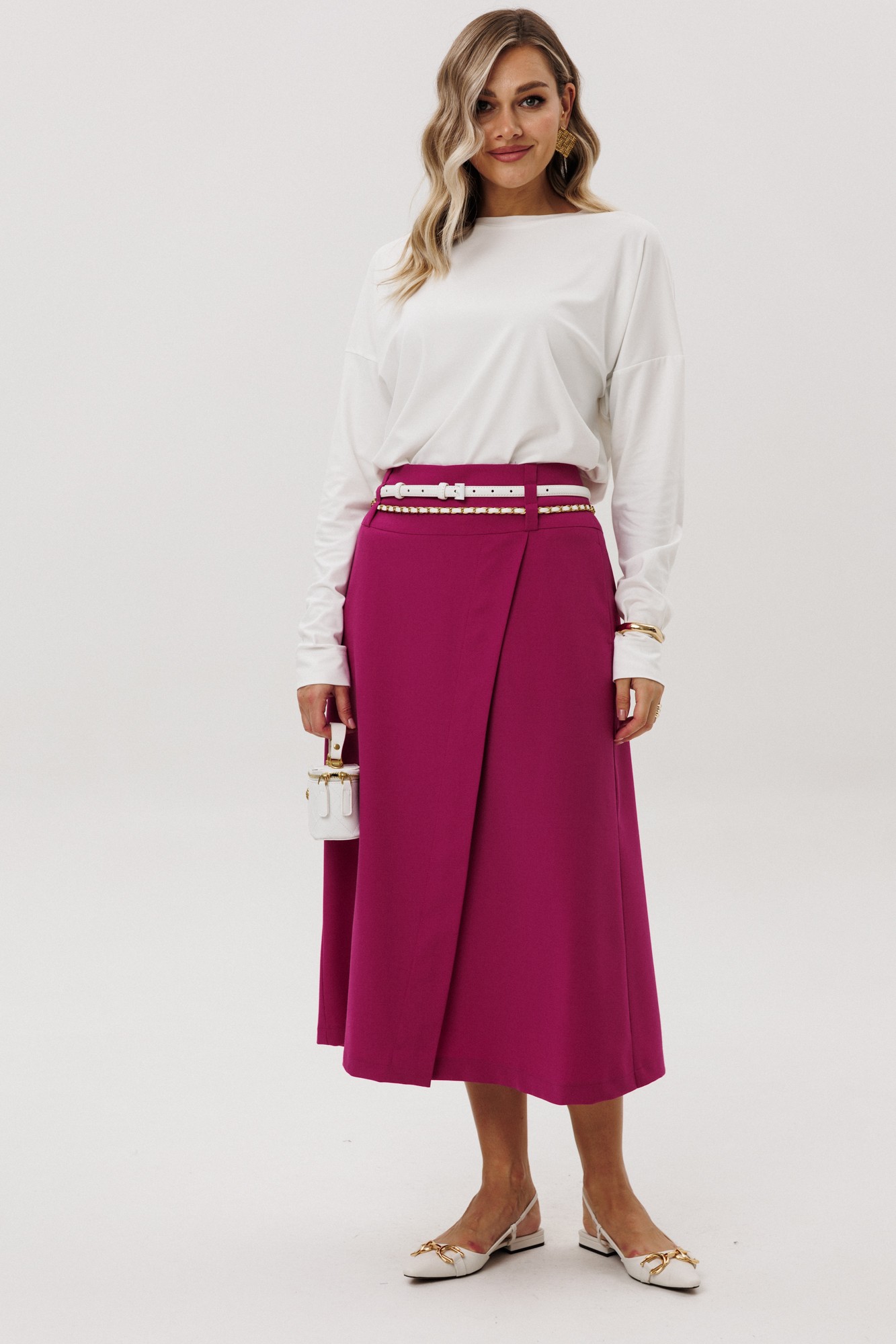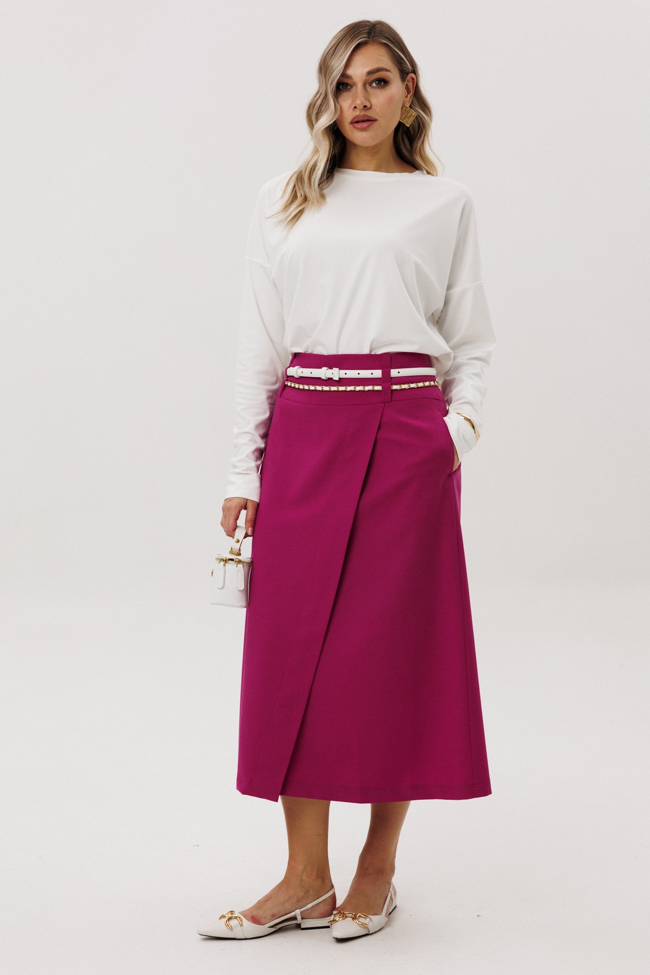 Комплект двухпредметный, состоит из джемпера и юбки. Джемпер свободного кроя с длинным рукавом. По низу широкая подгибка. Юбка из тонкой костюмной ткани на подкладке А-образного силуэта. Юбка по линии талии на широкой кокетке. По кокетке настрочены шлевки для декоративного ремешка. По передней половинке запах. В боковых швах карманы. Застежка по центру задней половинке на потайную тесьму-молнию.