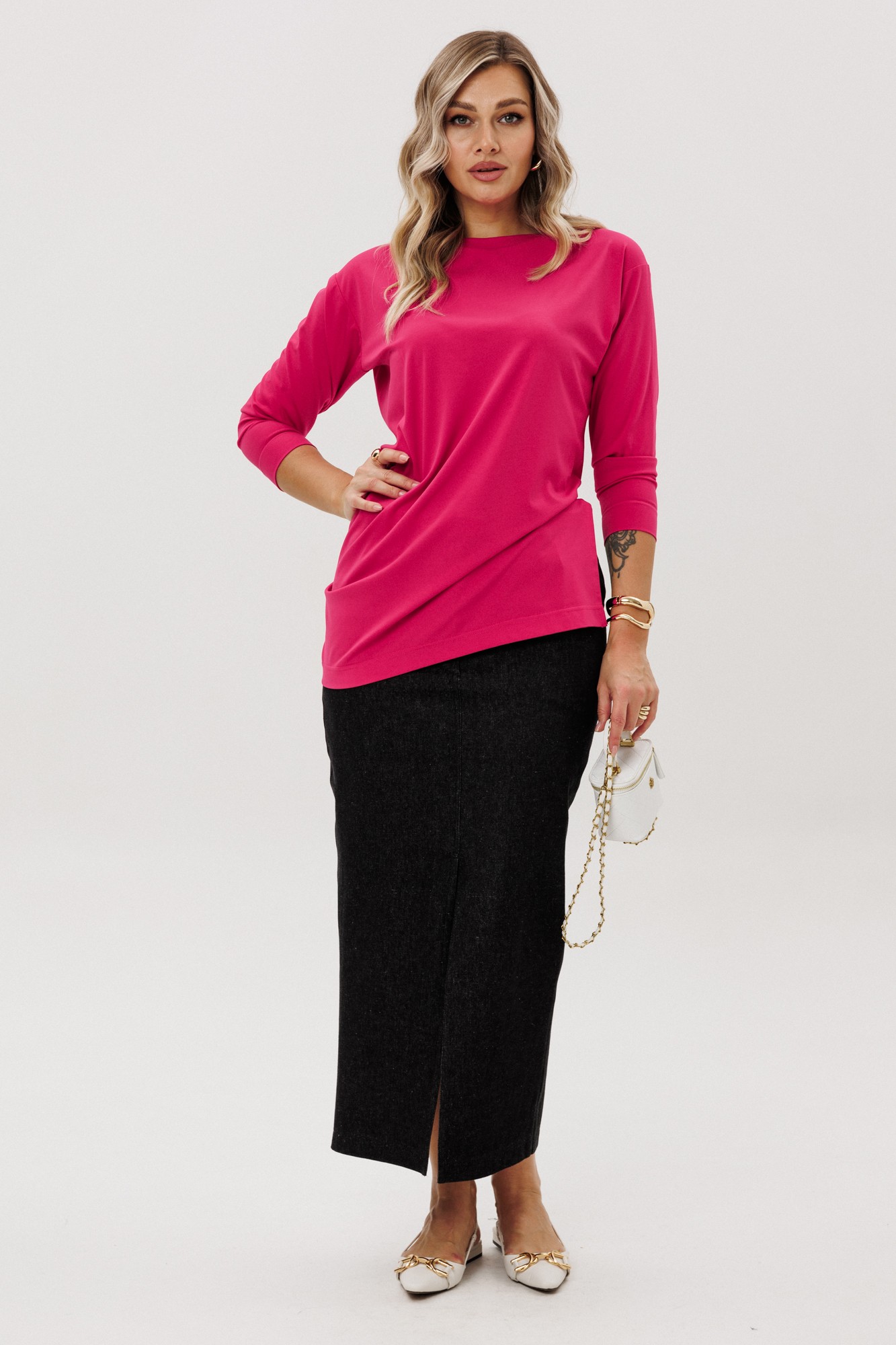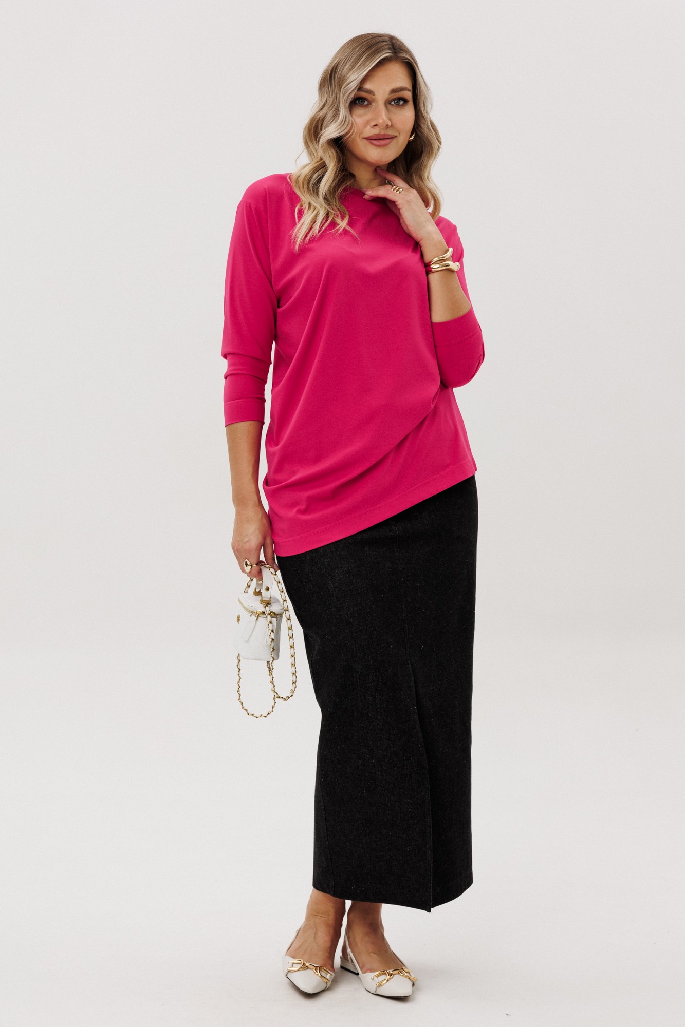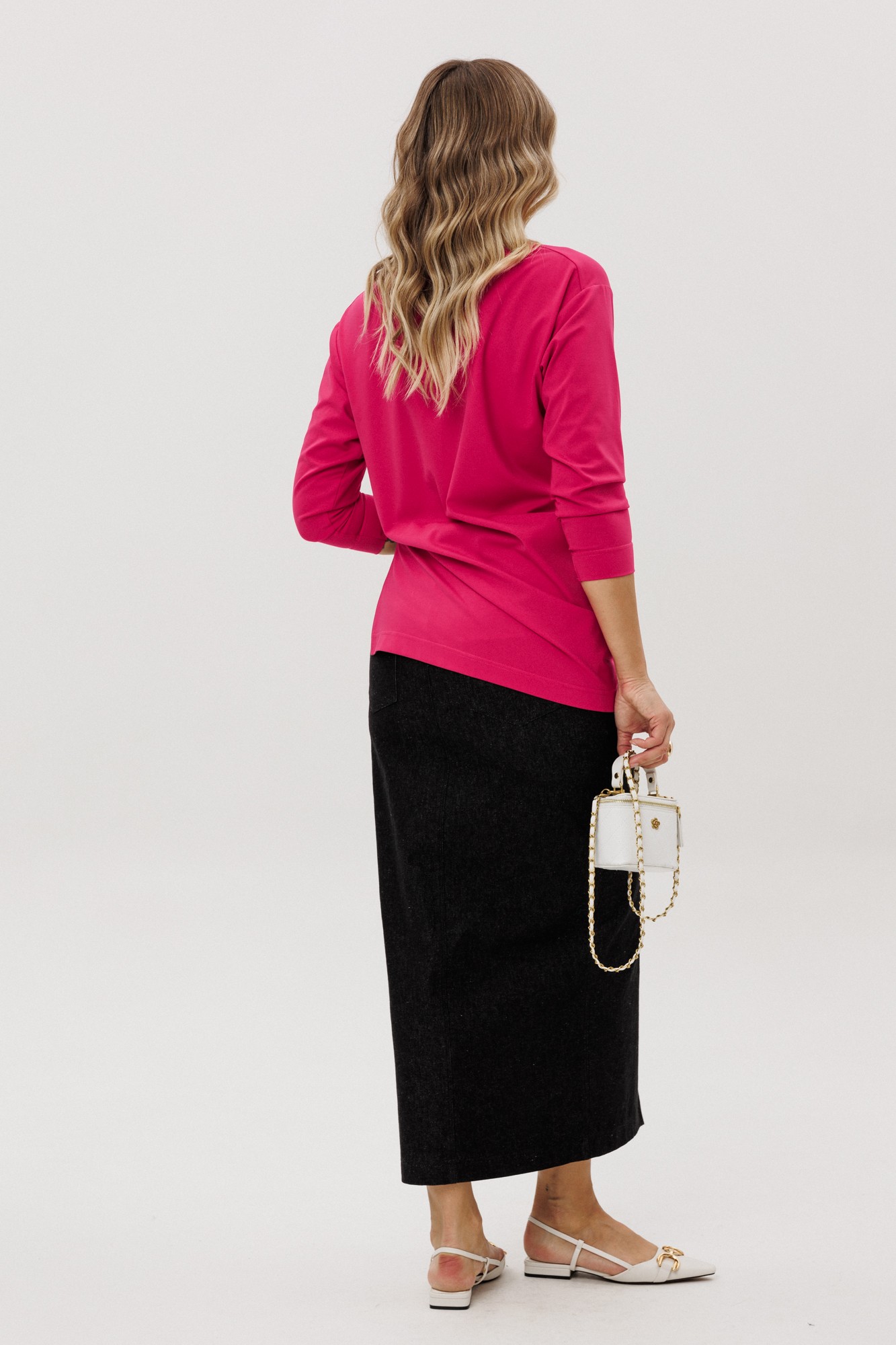 Комплект двухпредметный, состоит из джемпера и юбки. Джемпер ассиметричный с небольшой драпировкой по правому боку. Левый боковой шов заканчивается разрезом. Плечо спущенное, длинный рукав. Юбка прямого силуэта из хлопчатобумажной ткани в джинсовом стиле. Застёжка по центру передней половинки на тесьму-молнию. В среднем шве передней половинки разрез.