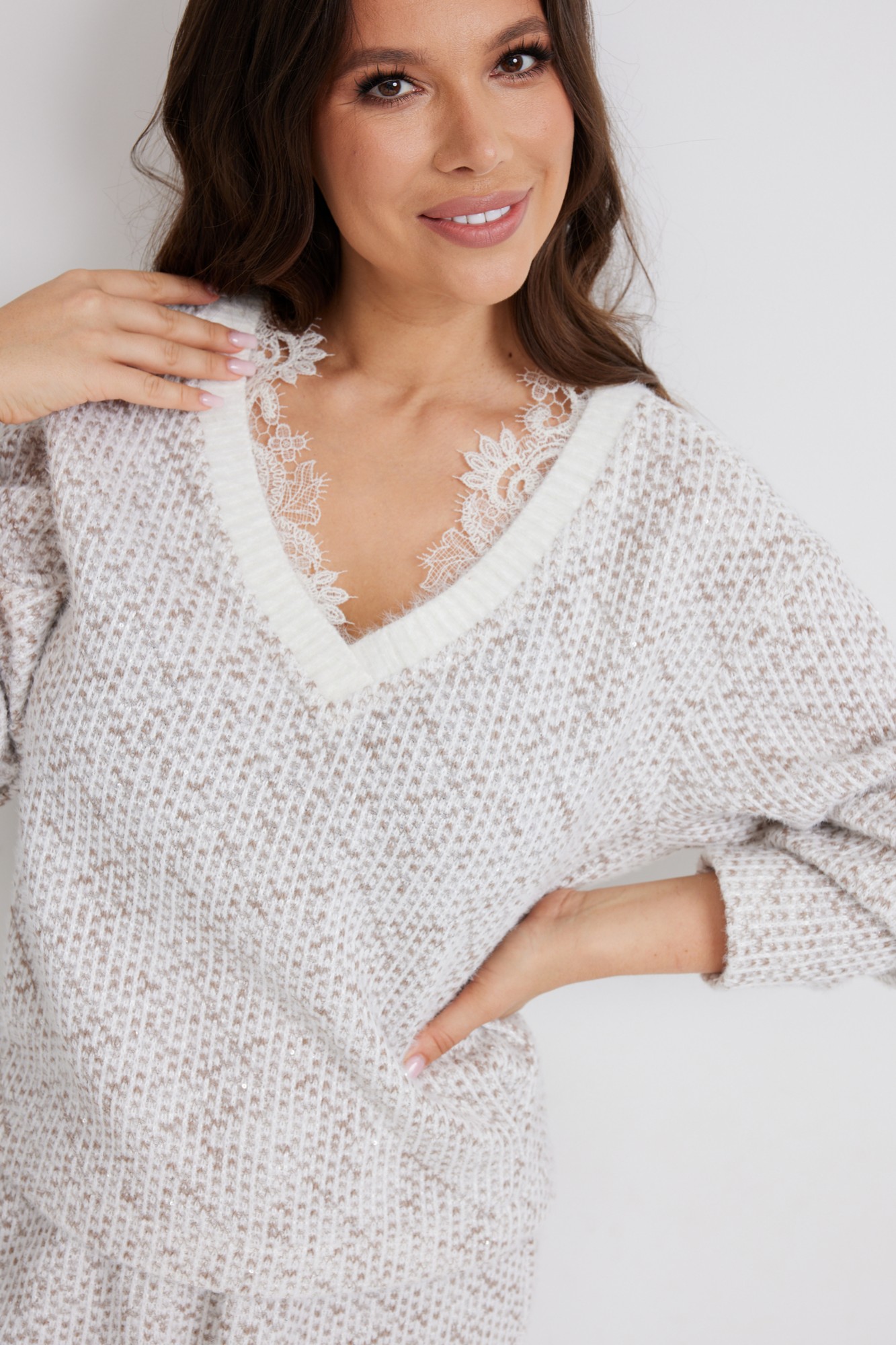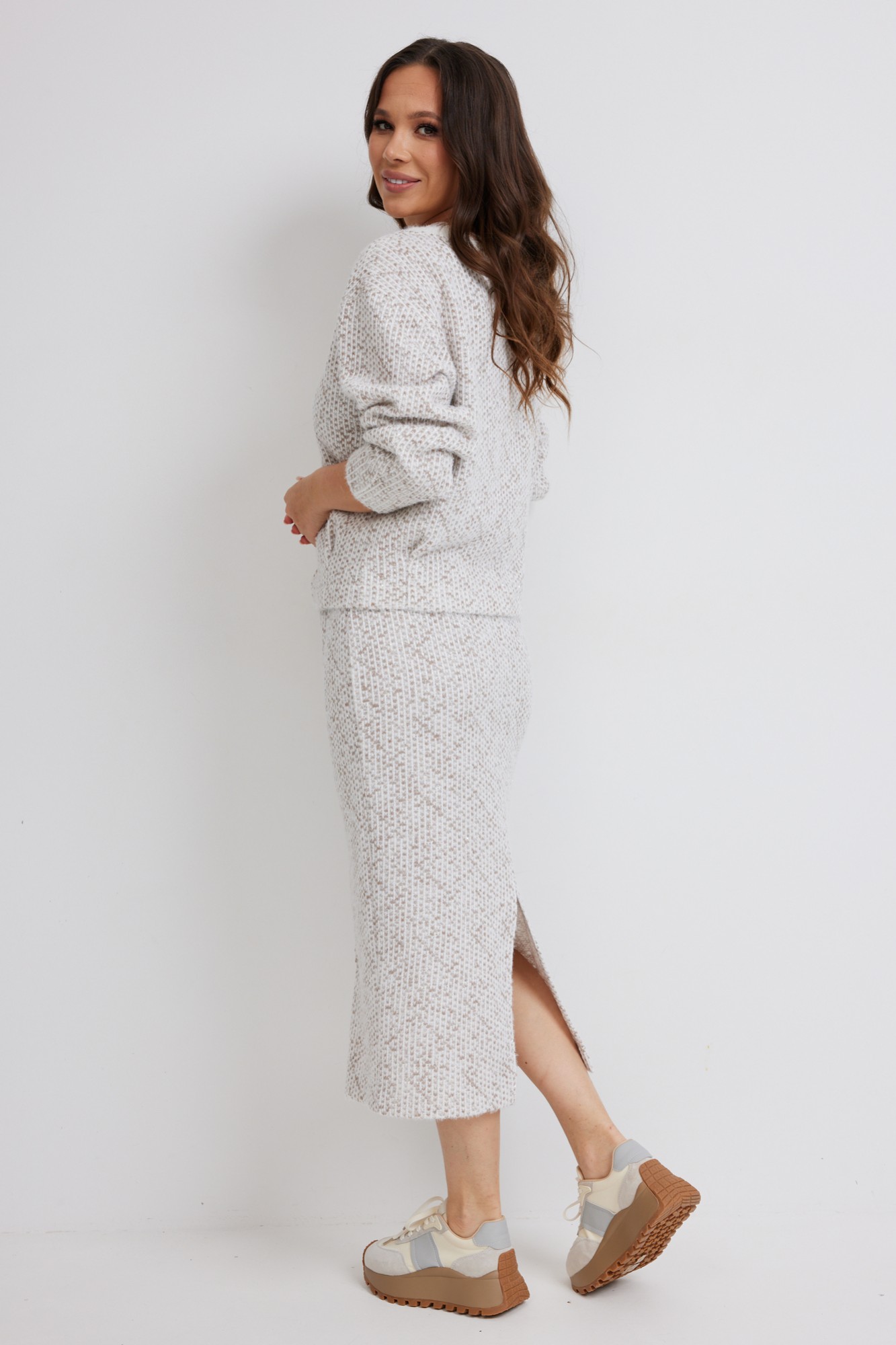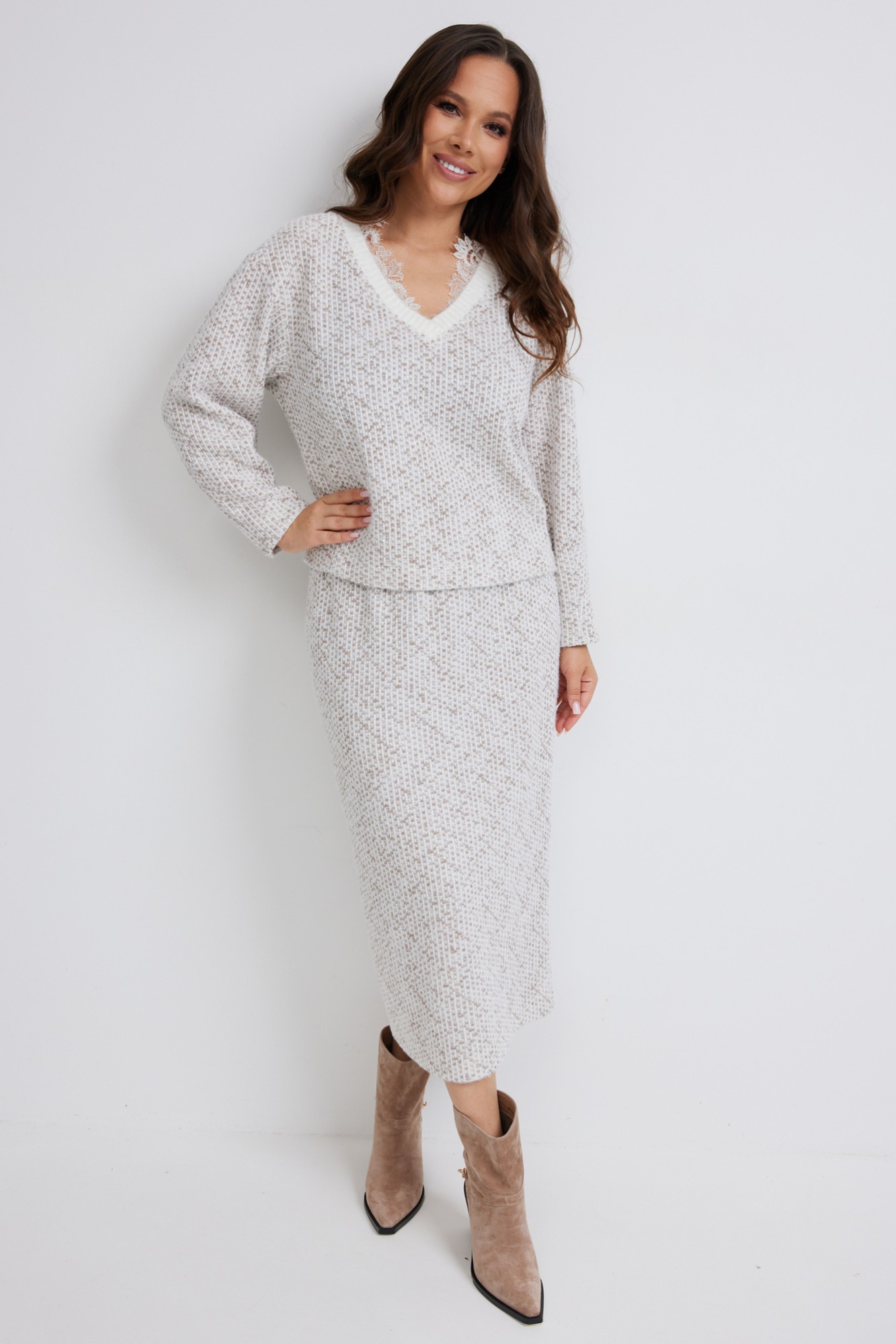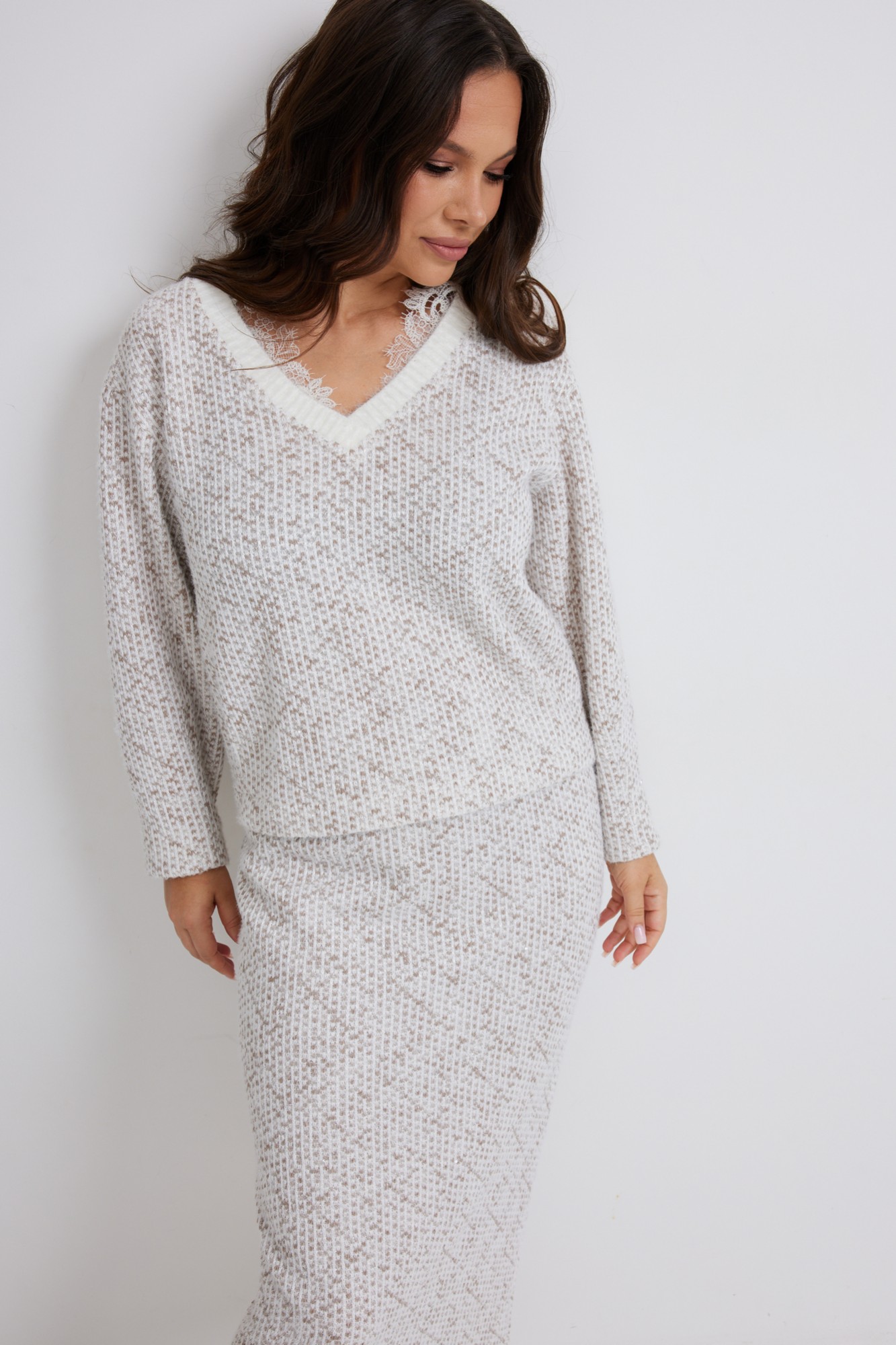 Элегантный и нежный комплект из джемпера и юбки, выполненных из вязаного, слегка пушистого трикотажного полотна с россыпью мелких , слегка мерцающих пришивных пайеток. Джемпер свободного кроя со спущенной линией плеча. Горловина с V- образным вырезом, дополненным нежным кружевом. Юбка прямого классического кроя с притачным поясом, дополненным эластичной тесьмой. Юбка на комфортной трикотажной подкладке.
