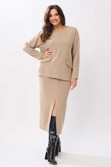 Костюм женский, состоящий блузы и юбки. Блуза прямого силуэта. Горловина круглая, обтачная,, спинка с центральным швом. Перед с центральным швом и настроченными клапанами. Рукава спущенные. Юбка зауженная к низу, на резинке и завязке. Перед со средним швом и разрезом. Юбка на подкладке.