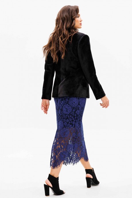 Комплект женский, состоящий из жакета и юбки. Жакет полуприлегающего силуэта, на подкладке, с центральной бортовой застежкой на 2 петли и пуговицы. Воротник отложной, на стойке. Рукав втачной, двухшовный со шлицей по низу и обработан 4-мя декоративными пуговицами. Карманы прорезные с клапаном. Спинка со средним швом. Юбка зауженная к низу. Спинка со средним швом, заканчивающимся разрезом, застежка на тесьму молнию в среднем шве спинки. Верхний срез обработан обтачкой. Юбка на подкладке.
