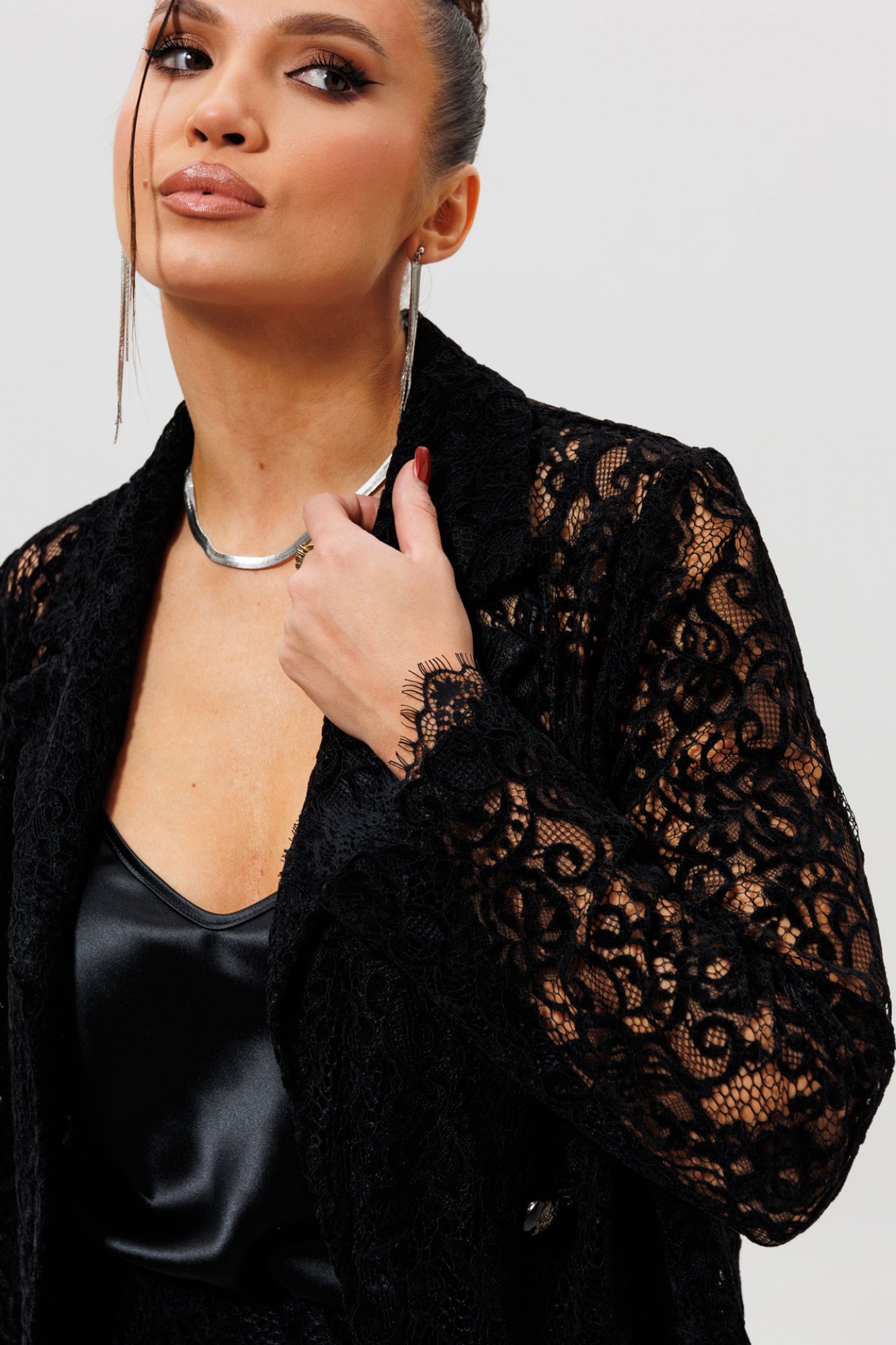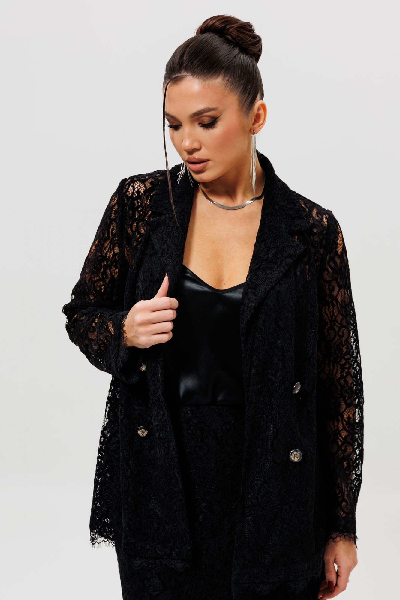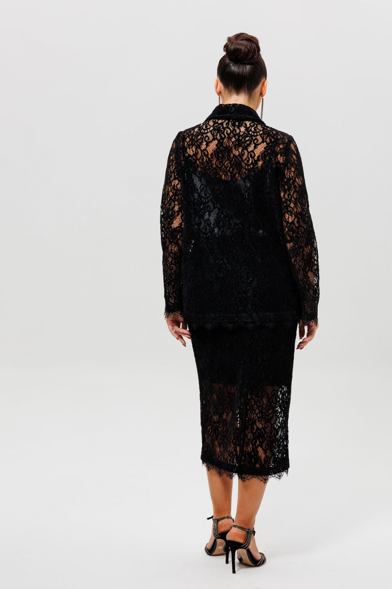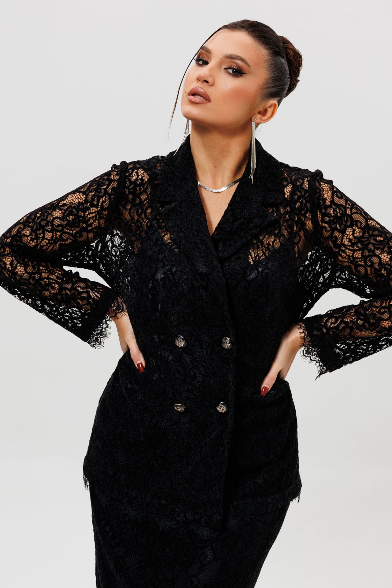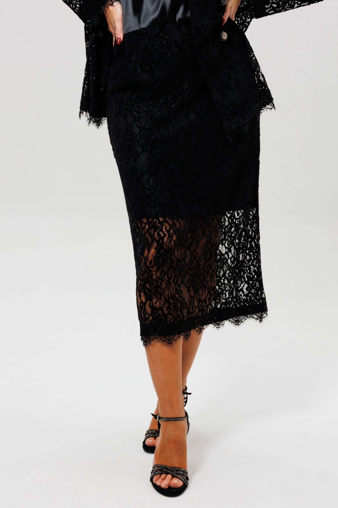 Этот гармоничный кружевной костюм с юбкой (Арт. 1284) выполнен в соблазнительной черной гамме. Комплект сочетает полуприлегающий жакет на подкладке и элегантную юбку из эластичной сетки с ажурным бархатным узором. Жакет с кружевными рукавами и лаконичным кроем создает утонченный верх, в то время как кружевная юбка подчеркивает женственность силуэта. Как и в других моделях коллекции, ткань обладает небольшой прозрачностью, поэтому для полного образа мы рекомендуем дополнить комплект однотонным топом (арт.1164) или бюстье. Этот ажурный костюм — идеальный выбор для романтического свидания, торжественного ужина или любого события, где вы хотите выглядеть неотразимо.