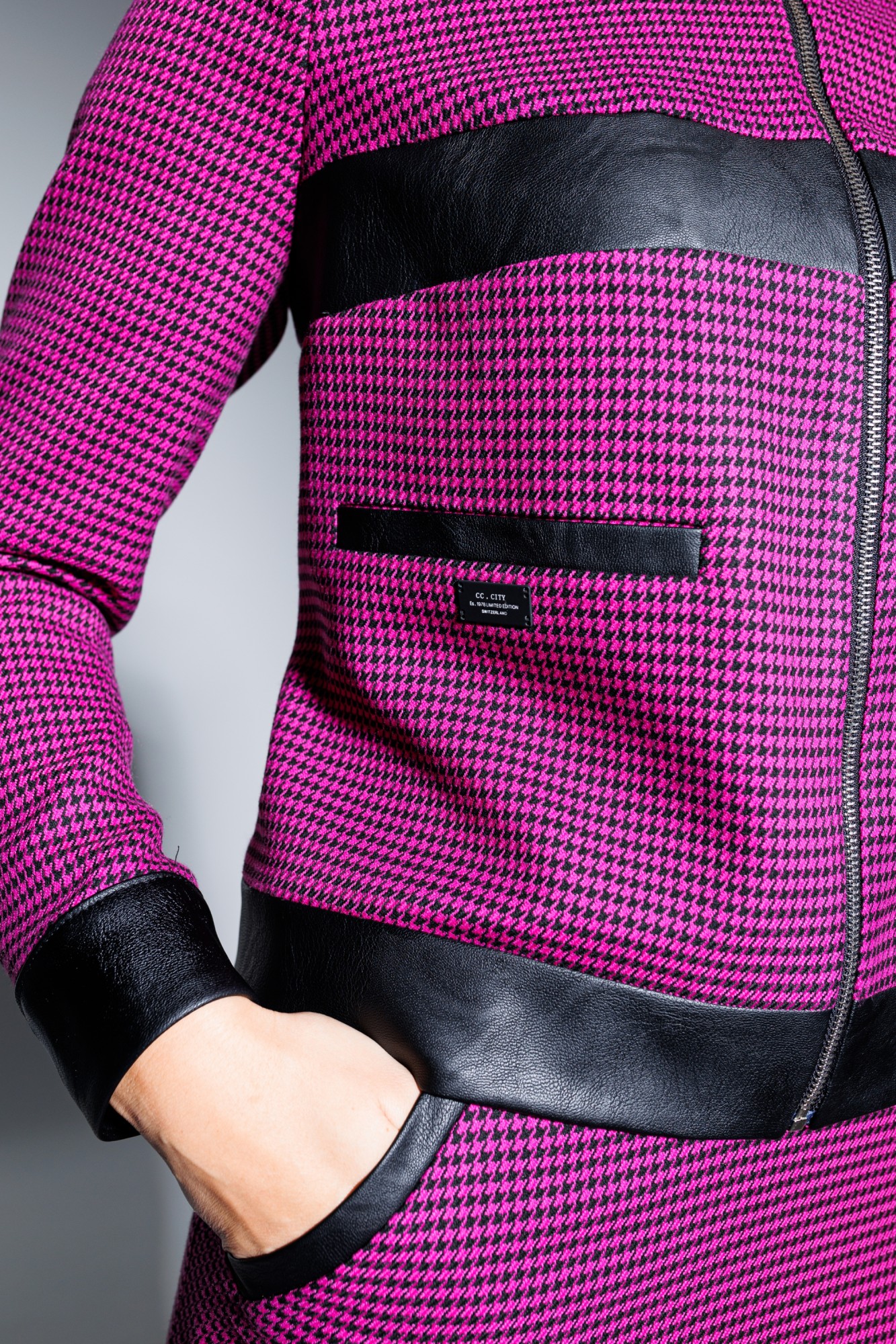 Костюм женский, состоящий из жакета и юбки. Жакет полуприлегающего силуэта с центральной застежкой на молнию. Спинка со средним швом. По переду горизонтальные вставки из эко-кожи. Карманы с листочкой также из отделки. По низу жакета планка. Воротник-стойка. Юбка зауженная к низу. На притачном поясе. Молния и шлица в среднем шве. По низу юбки планка из эко-кожи. Наклонные карманы с листочками в области бедер. Костюм на подкладке.