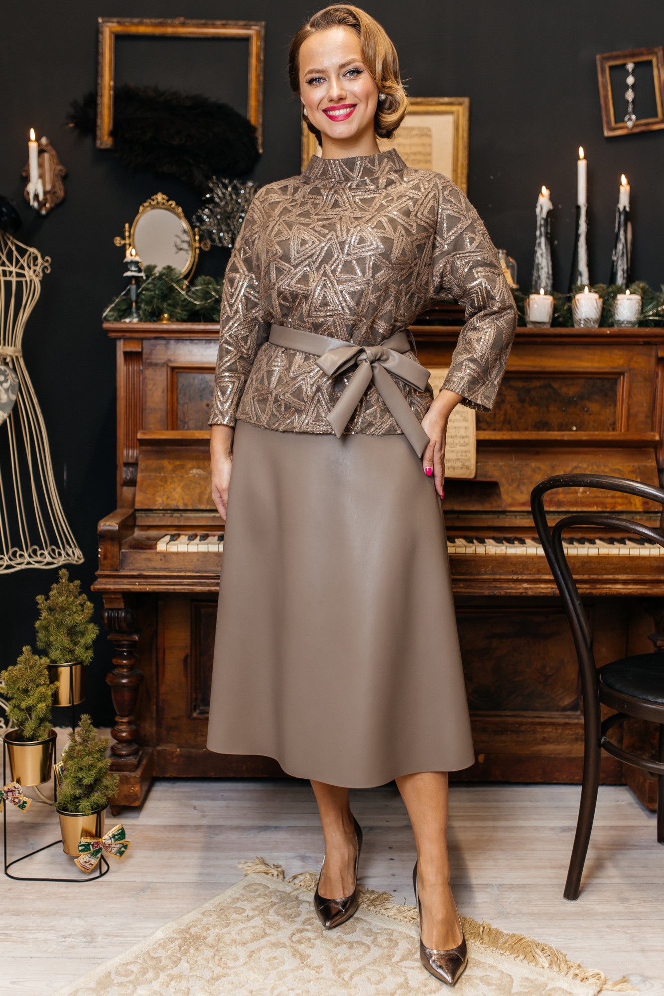 Время сиять! Главная ночь в году не обходится без пайеток. Образ, который стал знаковым - свободный блузон из гипюра с вышивкой и пайетками в тандеме с юбкой А силуэта из эко-кожи. Блузон по переду выполнен с нагрудными вытачками выходящими из боковых швов. Спинка со средним швом. Воротник стойка. Юбка на притачном поясе сзади с резинкой. Застежка на тесьму молнию в боковом шве . Комплект дополнен поясом, что позволяет подчеркнуть линию талии. Блузон и юбка на подкладке.