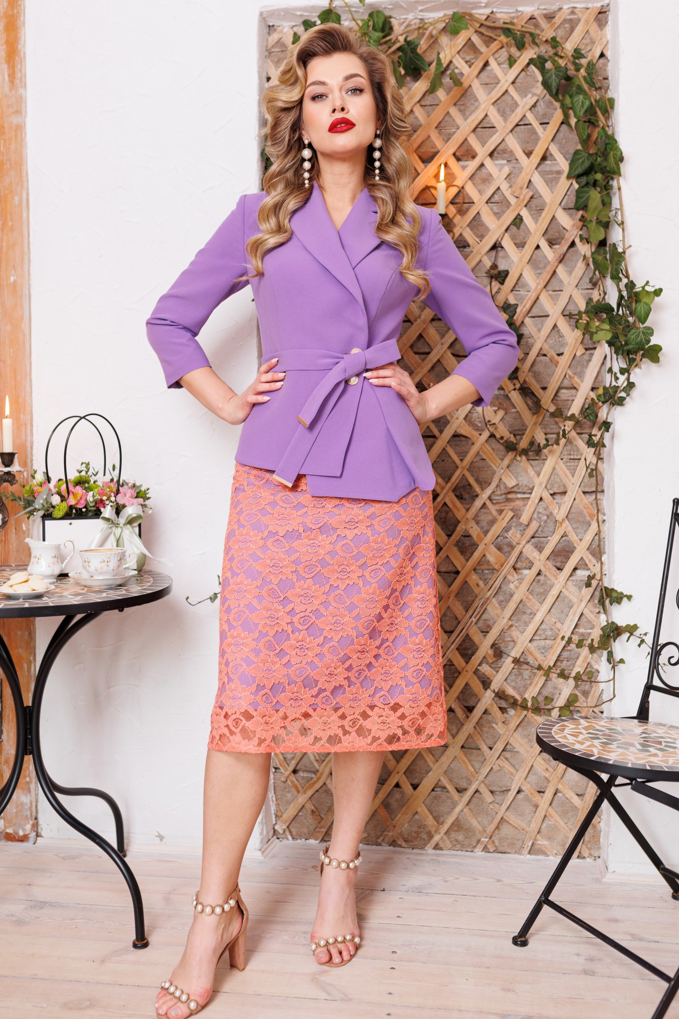 жакет: ПЭ 62% вискоза 33% спандекс 5% юбка: верхний слой: ПЭ 62% вискоза 33% спандекс 5% нижний слой: ПЭ 100% (гипюр)