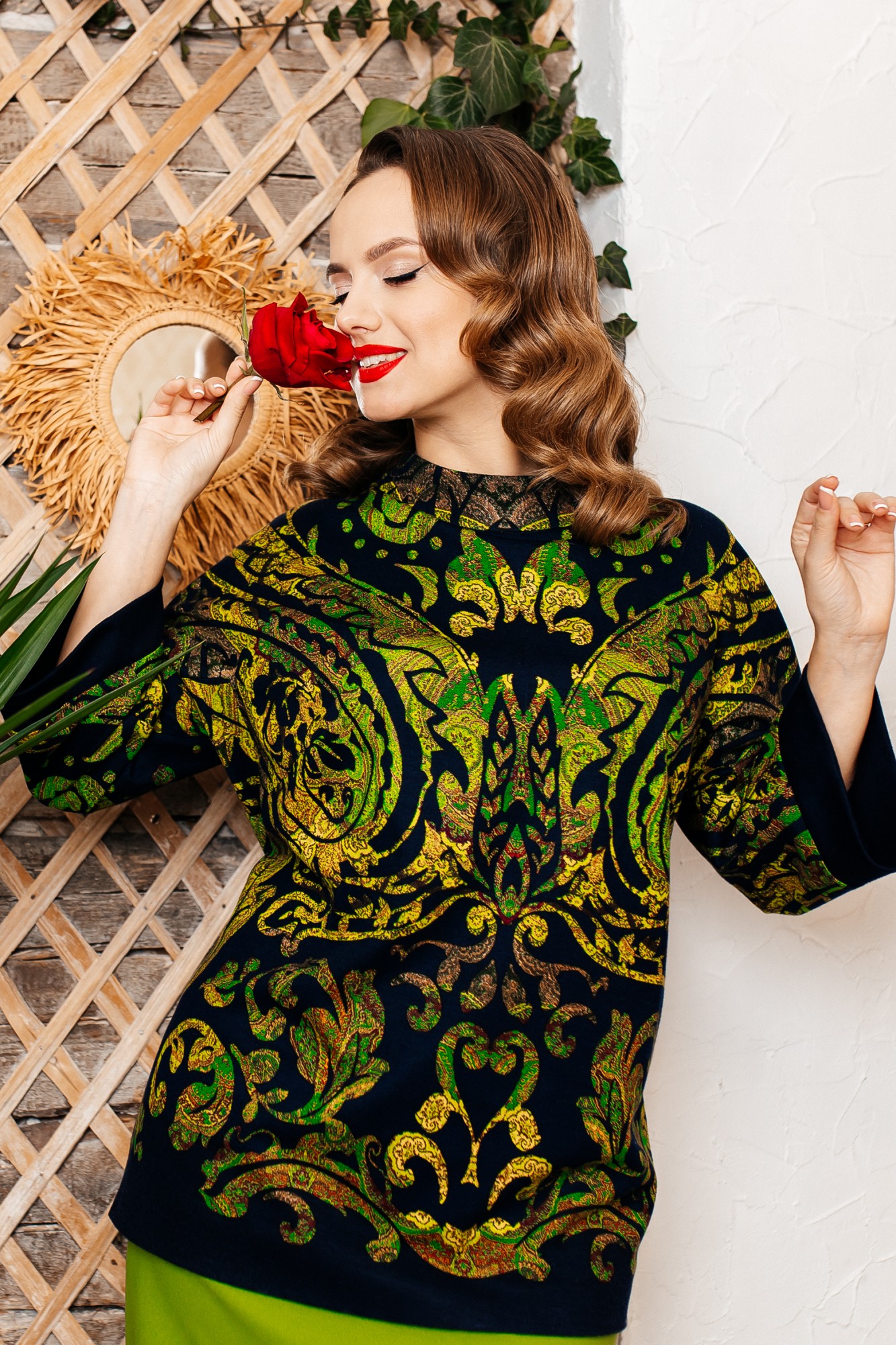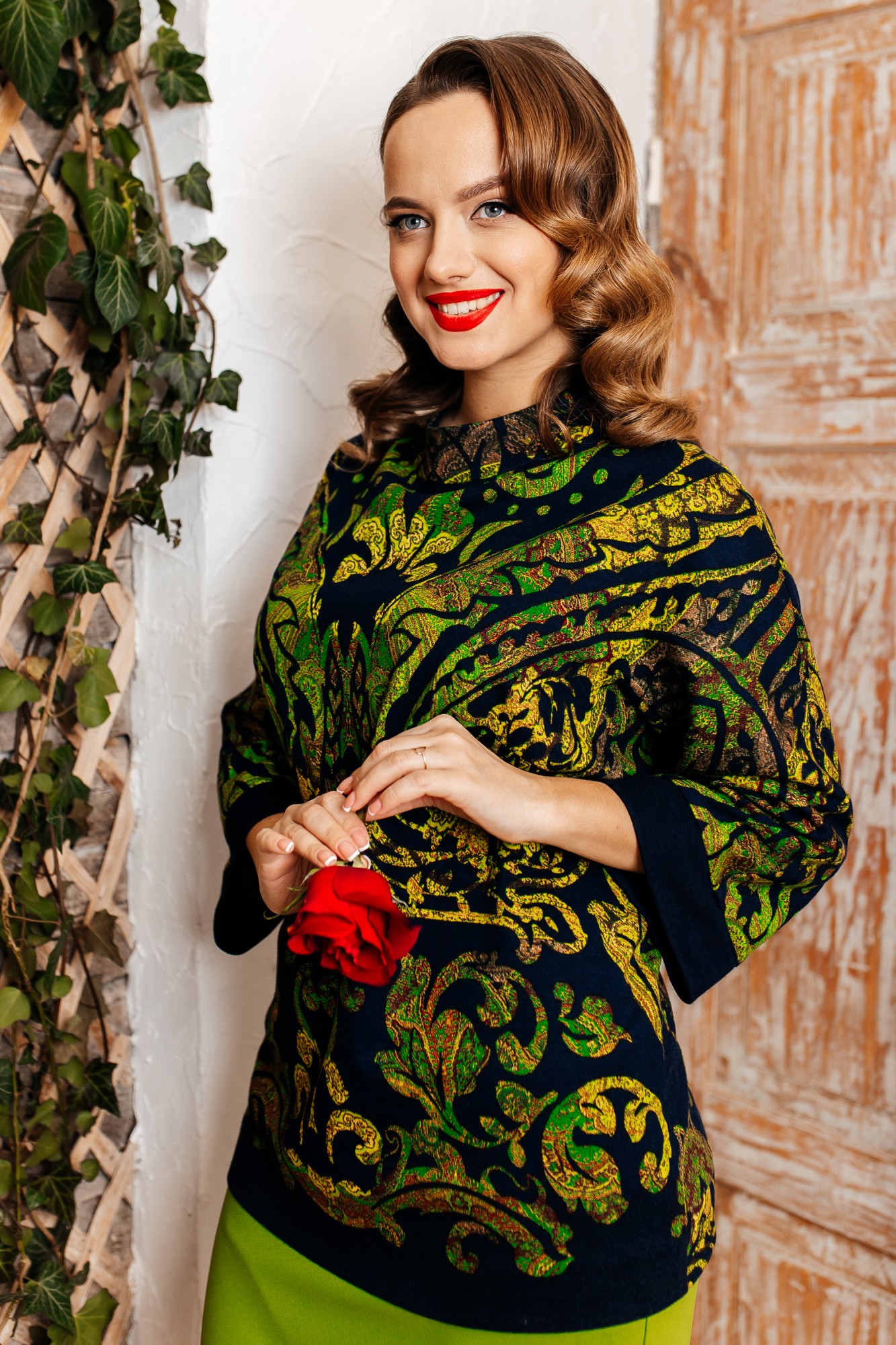 Яркий костюм от бренда «Мода-Юрс» выполнен из трикотажного полотна с акцентным рисунком в сочетании с однотоном. Блузон прямого силуэта с цельнокройным рукавом и ромбовидной ластовицей. Низ рукава с притачной манжетой. Воротник стойка. Застёжка на тесьму молнию в среднем шве. Юбка прямая, зауженная к низу, сверху с отрезными кокетками. Застёжка на тесьму молнию в среднем шве, который переходит в шлицу. Юбка на подкладке.