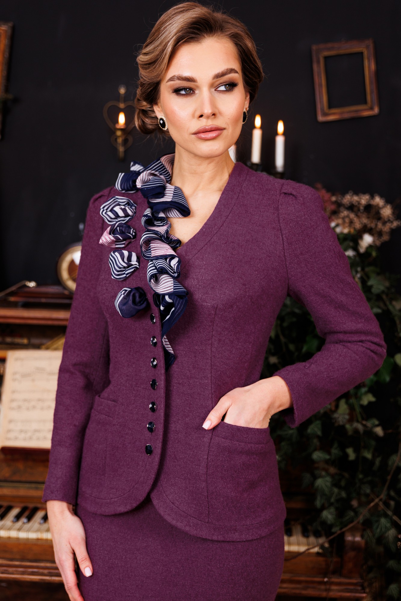 Что делает образ женственным и романтичным? Конечно же силуэты, подчеркивающие женскую фигуру, а также такие ткани как органза, шелк, шифон. Дизайнеры бренда "МОДА-ЮРС" предлагают Вам новинку - жакет из шерсти со съемным шарфом . Данная модель смотрится очень стильно и женственно. Такой жакет может стать основой многих образов. Смело сочетайте его со своими праздничными и деловыми блузами. Жакет полуприлегающего силуэта. По переду и спинке с талиевыми вытачками, на полочках обработаны карманы. Спинка со средним швом. Рукава втачные, двухшовные, сверху по окату со складками. Застежка центральная на петли-пуговицы. Жакет декорирован съемным шарфом, нижняя часть которого застегивается на петли-пуговицы. Юбка прямая, зауженная к низу, сверху на притачном поясе, по бокам с резинками. Застежка на тесьму-молнию в среднем шве, который переходит в шлицу.