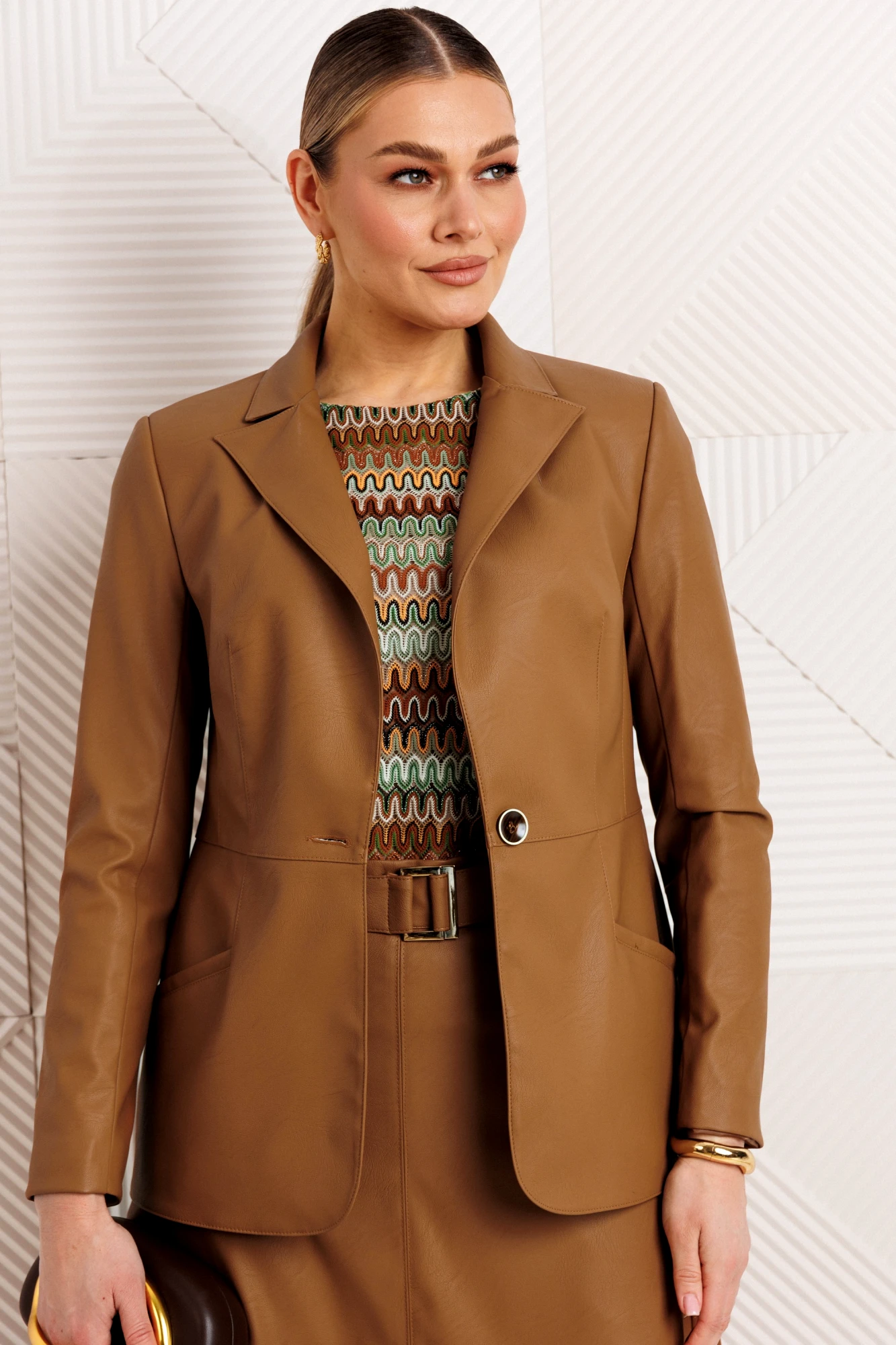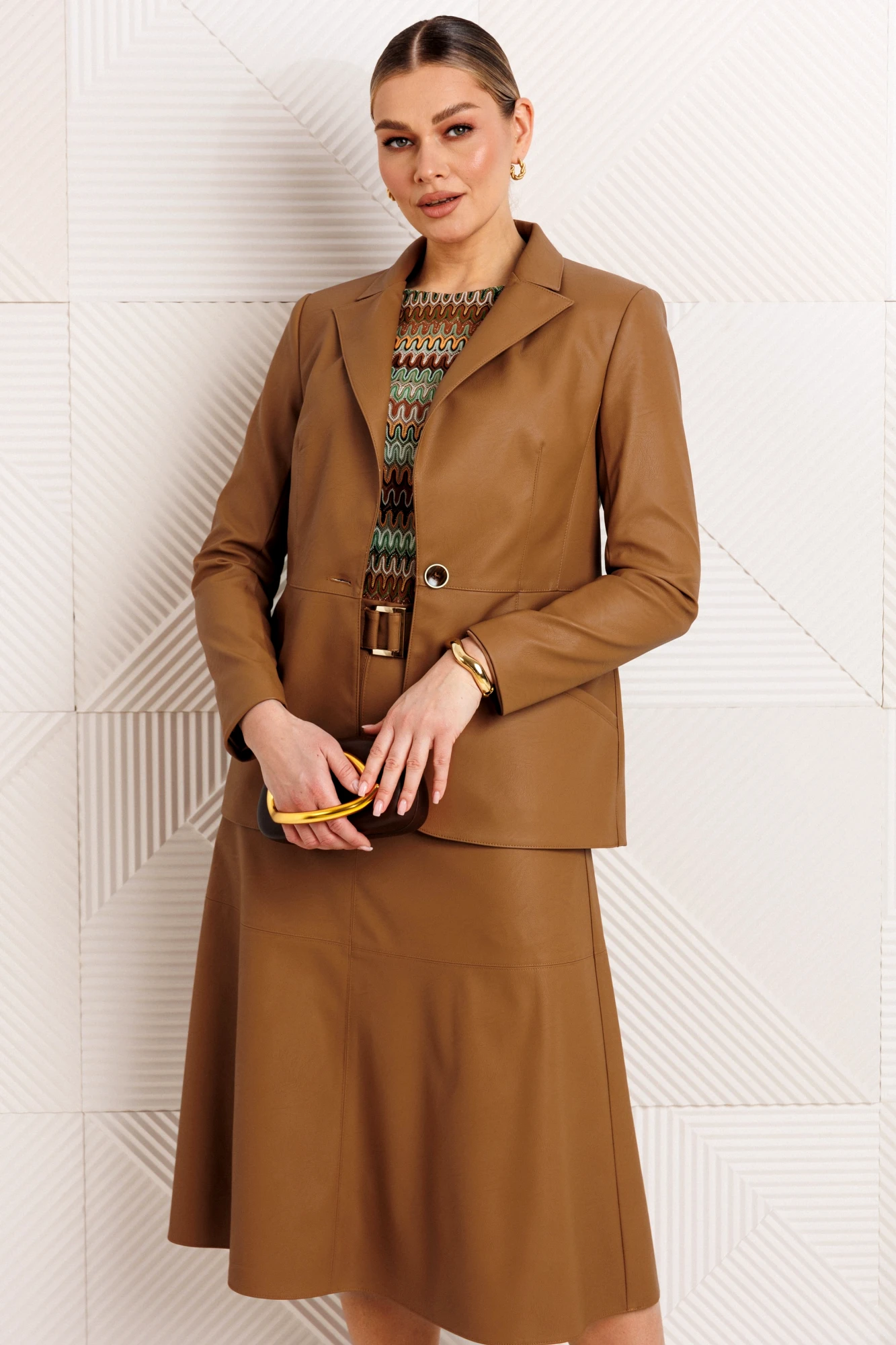 Модный и стильный костюм-тройка с топом - это идеальный выбор как для работы, так и для повседневной жизни. Жакет однобортный, полуприлегающий. Застежка жакета на одну пуговицу, чуть выше линии талии. Рукав втачной, двухшовный. Воротник отложной с лацканами. На полочке прорезные карманы с листочкой. Длина жакета ниже линии бедер. Топ выполнен из кружевного полотна. Такой топ станет отличной базовой вещью гардероба. Его можно носить на выпуск или заправлять. Топ выполнен на трикотажной подкладке. Спинка чуть длиннее полочки, вырез горловины округлый, плечо спущенное. Юбка расширенного силуэта, четырехклинка. Благодаря универсальности и практичности фасона юбка-четырехклинка уже давно является классической моделью. Она идет большинству женщин различных возрастов и типов фигур. Такой фасон способен подчеркнуть достоинства и скрыть недостатки внешности ее хозяйки. Самый хитовый вариант – это кожаная или джинсовая юбка с карманами и притачным поясом. Наша юбка выполнена из экокожи. Жакет выполнен на подкладке, юбка без подкладки.