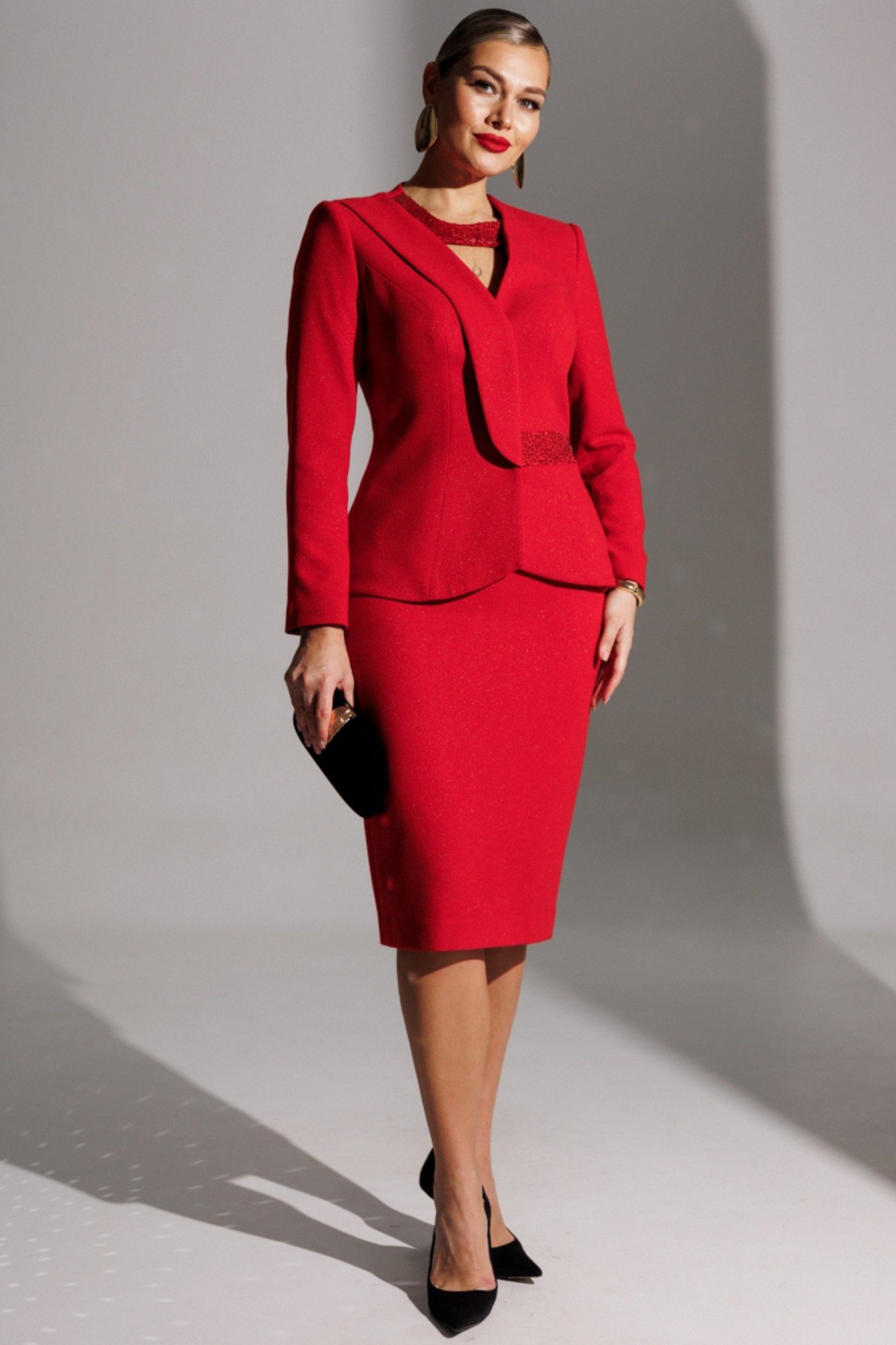 Женственность в каждом шве! Мы предлагаем Вам новинку от бренда "МОДА-ЮРС", которая выделит Ваши лучшие стороны: акцент на талию, плавные линии, идеальная посадка. Забудьте о массивных плечах и прямых линиях - теперь это нежные линии, которые подчеркивают Вашу фигуру и добавляют образу утонченности. Жакет полуприлегающего силуэта с рельефами по переду и спинке. Рукава втачные, двухшовные. Спинка со средним швом. Жакет декорирован отрезными деталями по линии талии и горловине, которые выполнены из ткани в пайетки. Главным акцентом является отрезной лацкан с одной стороны и брошь, декорированная жемчужинами, с другой стороны. Застежка на металлические пришивные кнопки. Юбка прямая, зауженная к низу, сверху на притачном поясе, по бокам с резинками. Застежка на тесьму-молнию в среднем шве. Комплект на подкладке.
