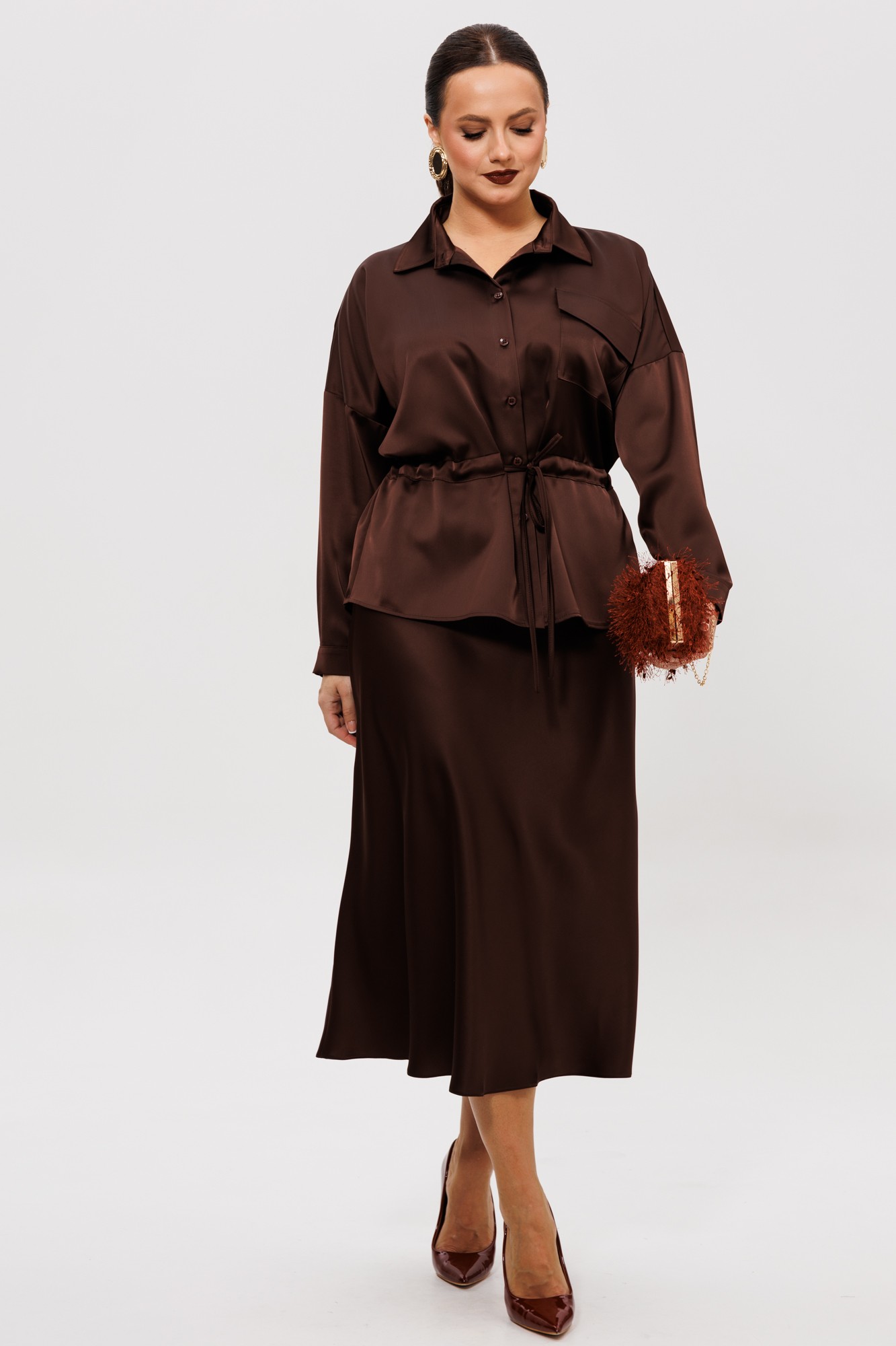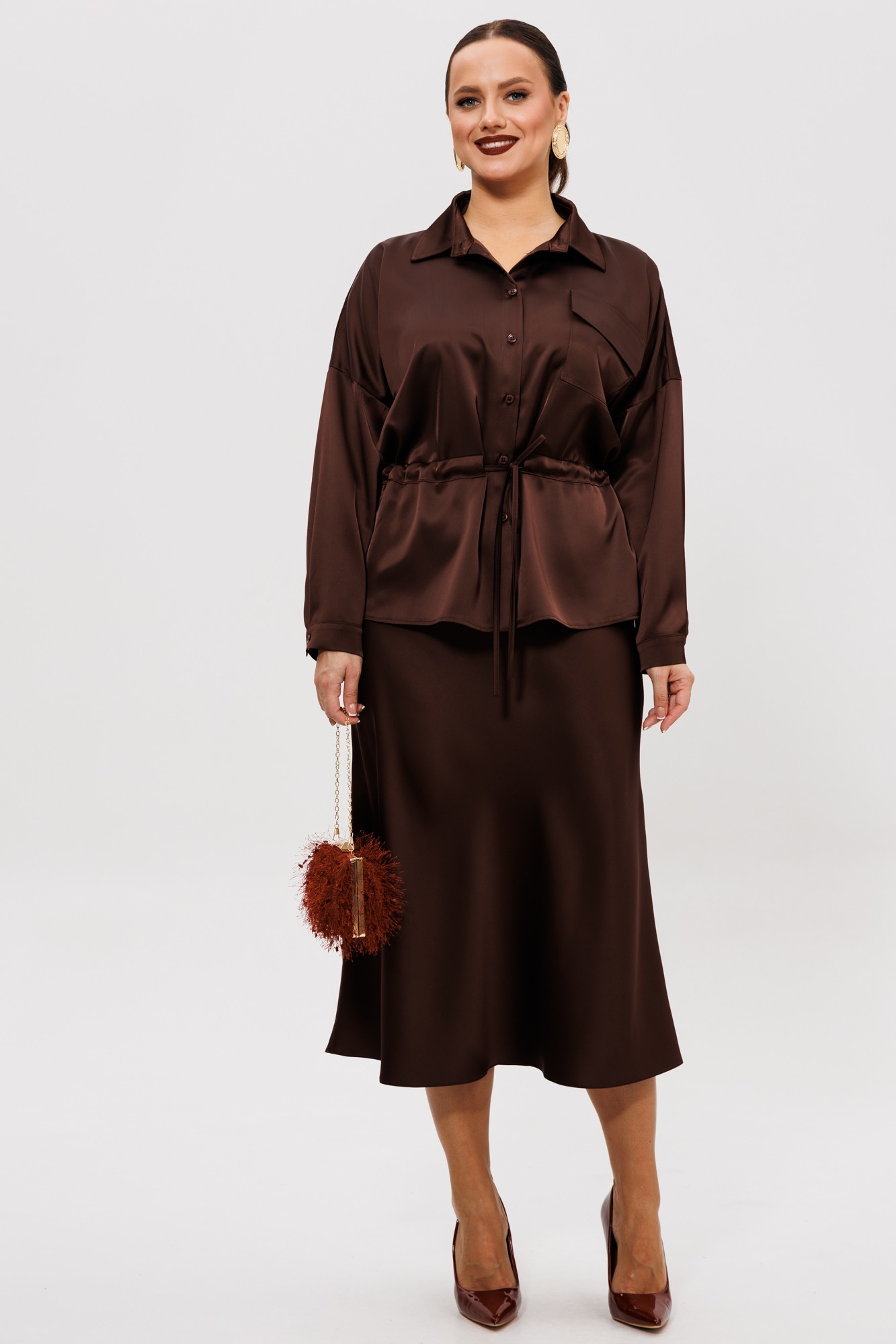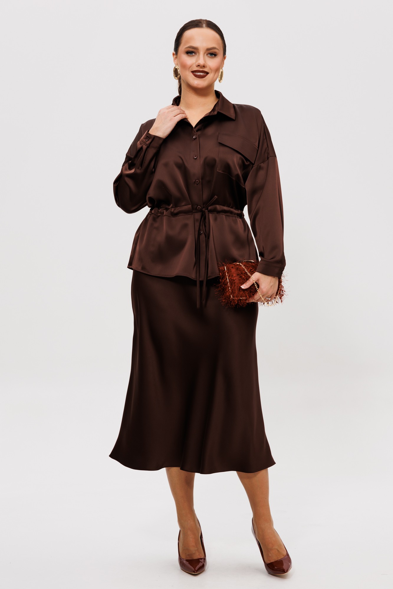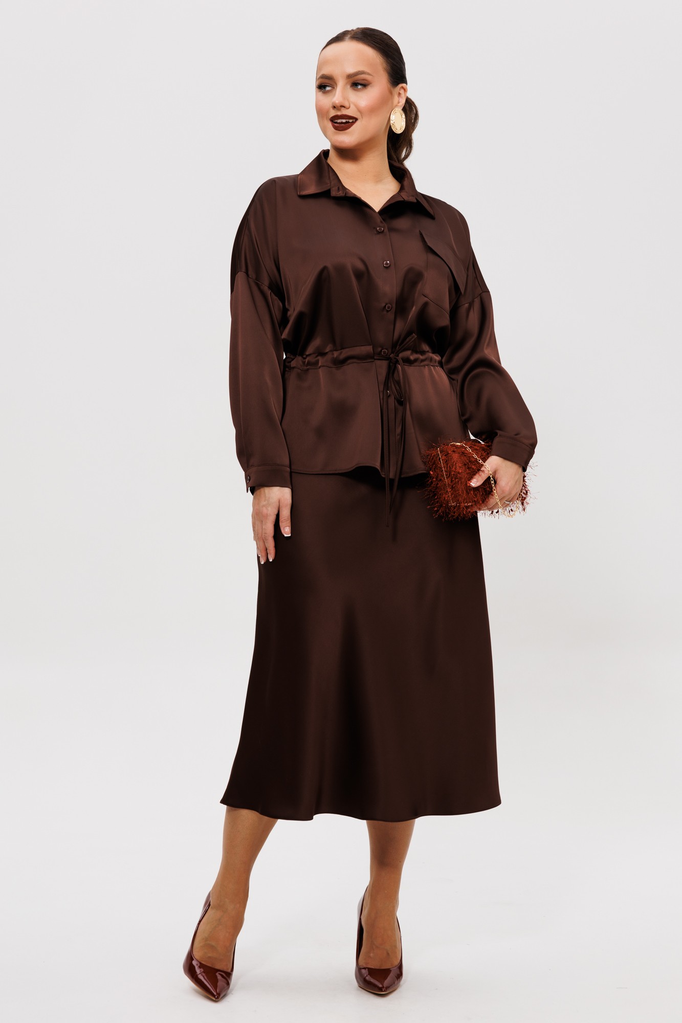 Нарядный юбочный костюм, выполненный из струящегося шелка «Армани» (тянется). Блуза прямого силуэта со спущенной линией плеча. По переду накладной карман с клапаном (по правой части переда), центральная застежка на петли-пуговицы, надстрочные кулисы со шнуром. Спинка цельная с надстрочной кулисой, присборенная резинкой. Горловина оформлена воротником рубашечного типа со стойкой. Рукава одношовные с притачной манжетой, застегивающейся на пуговицы. Юбка расширенная к низу. Верхний срез оформлен поясом с эластичной резинкой. Юбка без подкладки.