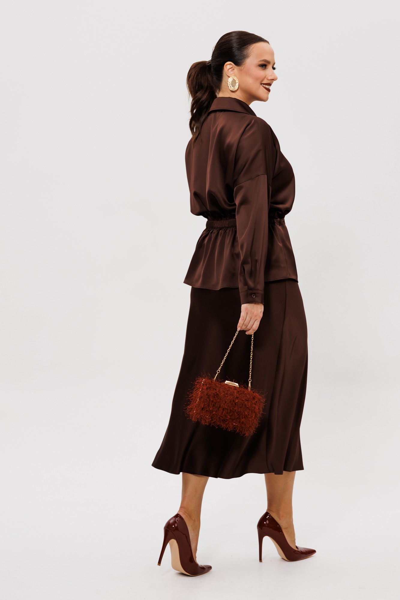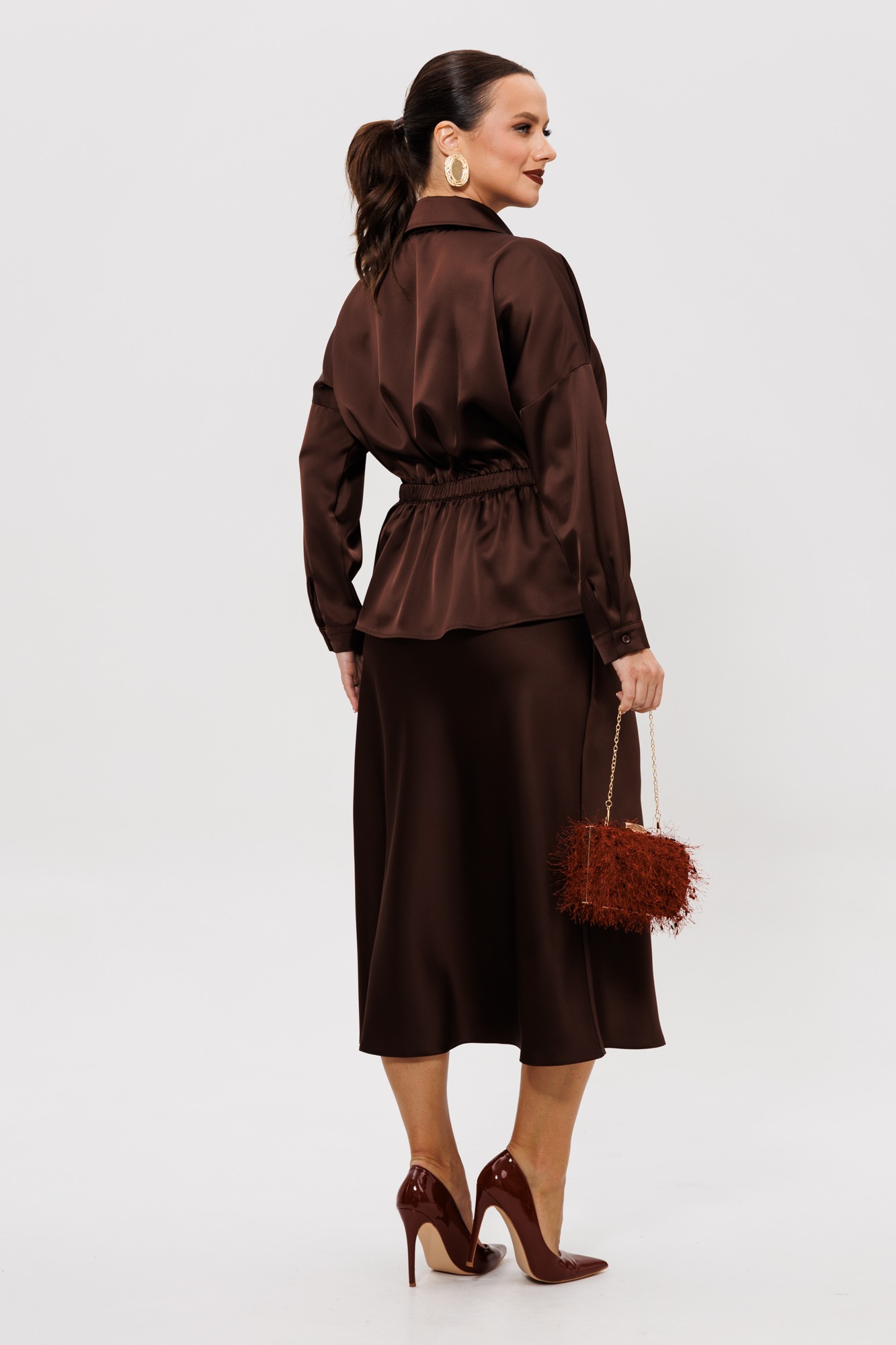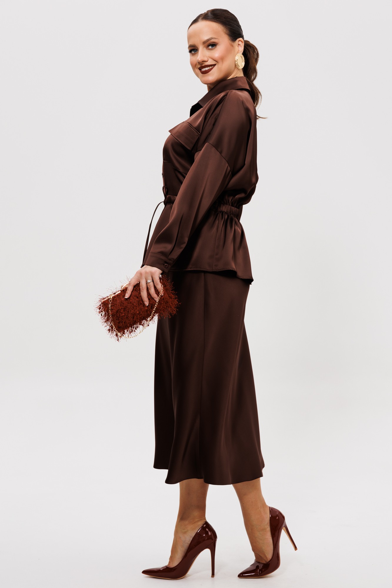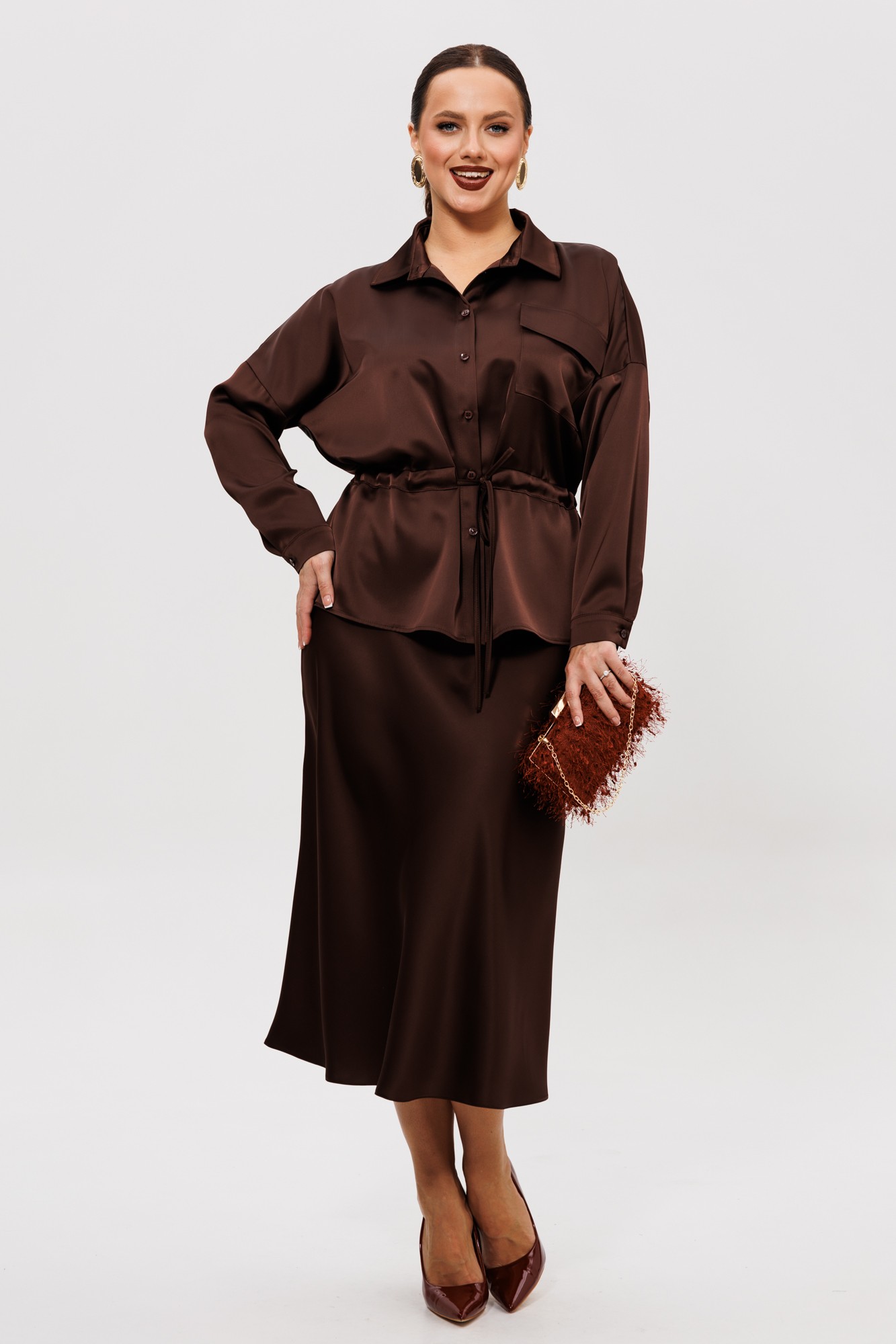 Нарядный юбочный костюм, выполненный из струящегося шелка «Армани» (тянется). Блуза прямого силуэта со спущенной линией плеча. По переду накладной карман с клапаном (по правой части переда), центральная застежка на петли-пуговицы, надстрочные кулисы со шнуром. Спинка цельная с надстрочной кулисой, присборенная резинкой. Горловина оформлена воротником рубашечного типа со стойкой. Рукава одношовные с притачной манжетой, застегивающейся на пуговицы. Юбка расширенная к низу. Верхний срез оформлен поясом с эластичной резинкой. Юбка без подкладки.